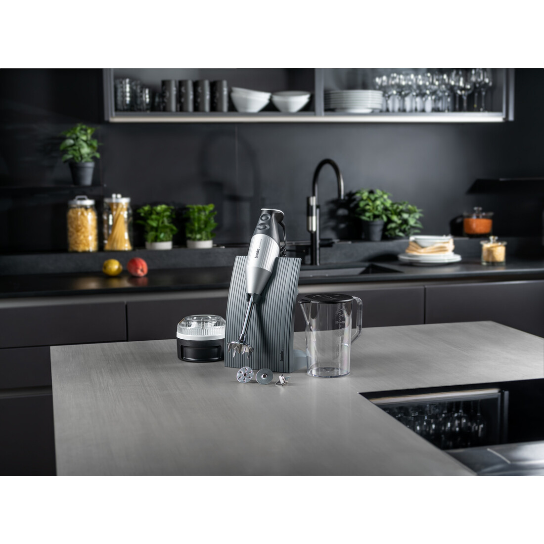 Bij de staafmixer worden verschillende accessoires geleverd. Gebruik de drie verschillende opzetstukken om te kunnen afwisselen per ingrediënt. In de bijgeleverde processormolen kan je tapanade of pesto klaarmaken. Verder zit er in de verpakking een bijpassende beker van 1 liter en een houder voor de staafmixer met accessoires. De zilveren Bamix SwissLine is ook in diverse andere kleuren verkrijgbaar.