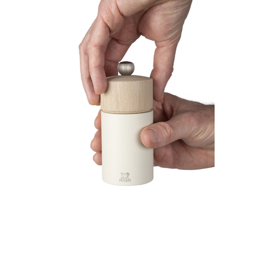 Compact, stijlvol en tijdloos. De Peugeot Boreal zoutmolen in vederwit heeft een afmeting van 12 cm en combineert elegantie met de betrouwbaarheid die je van Peugeot mag verwachten. Met zijn heldere, zachte wittint en zilverkleurige knop brengt deze molen een frisse en minimalistische sfeer in elke keuken. Dankzij het manuele instelmechanisme pas je eenvoudig de maalgraad aan, van grof tot fijn. Het geharde stalen maalwerk, exclusief ontworpen voor peperkorrels, garandeert een constante maling en uitzonderlijke duurzaamheid.