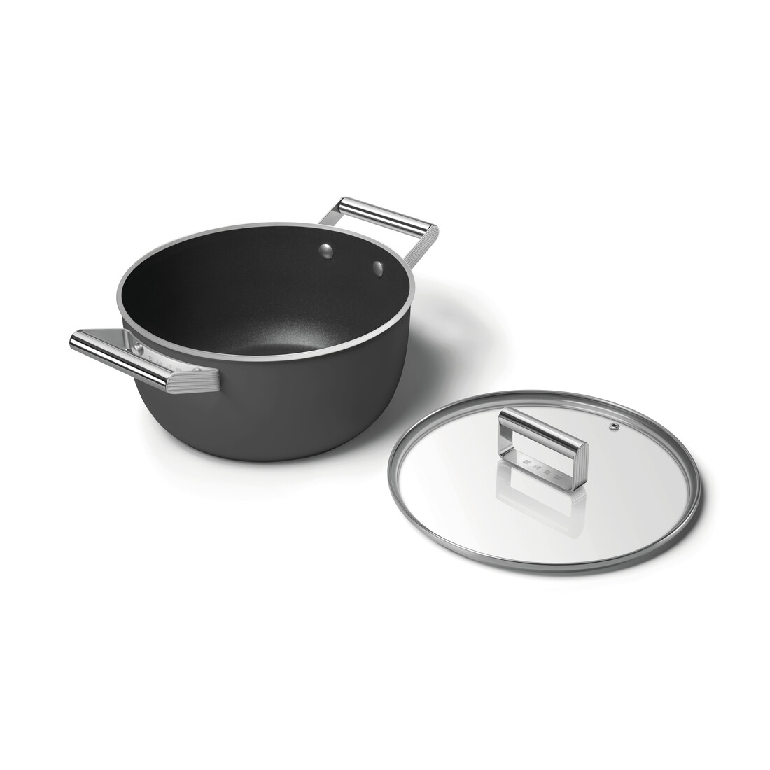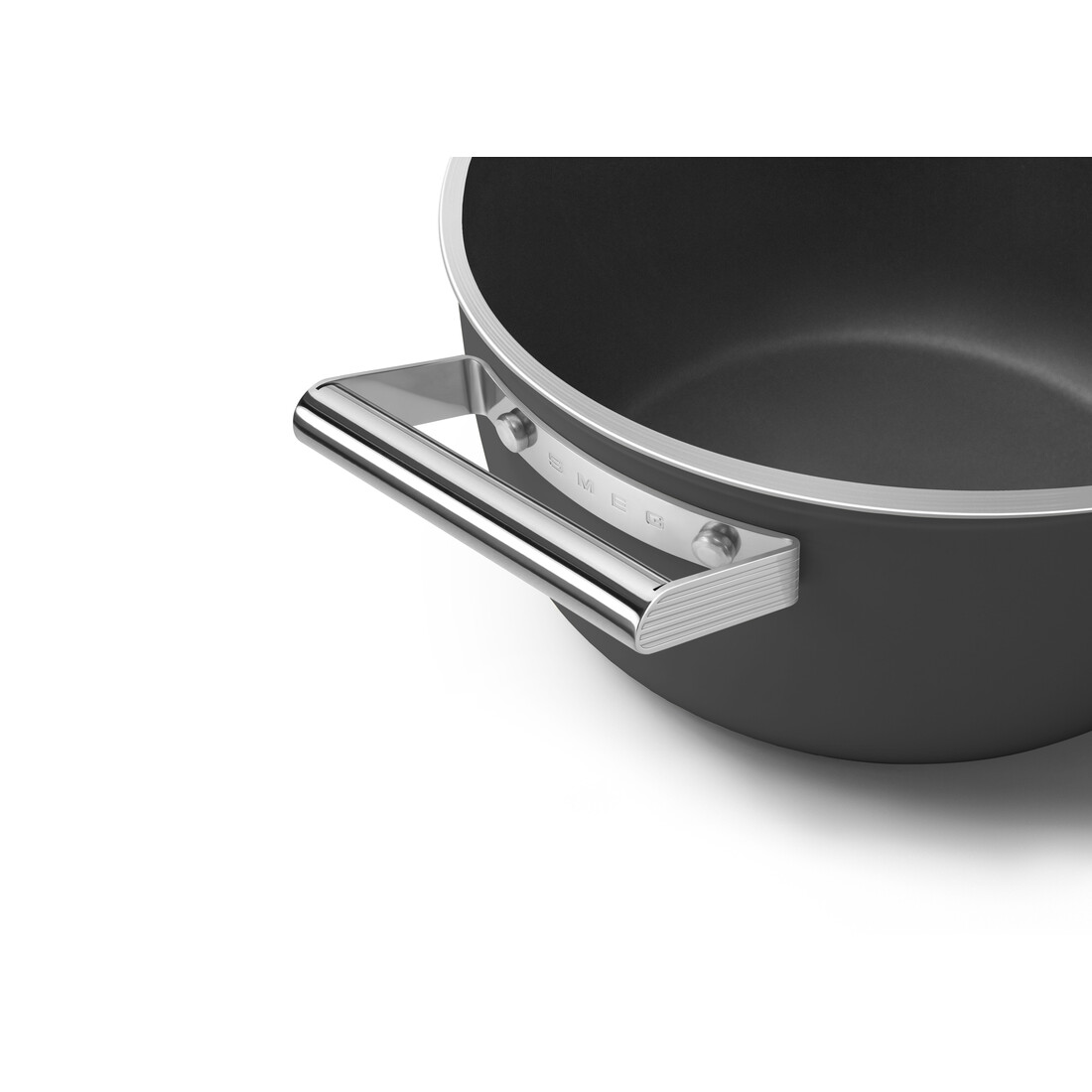 De pan is verkrijgbaar in drie kleuren: crème, mat zwart en emerald green. Zoals alle SMEG-producten is ook deze braadpan gemaakt in Italië en sluit hij aan bij het bekende, tijdloze design van het merk.