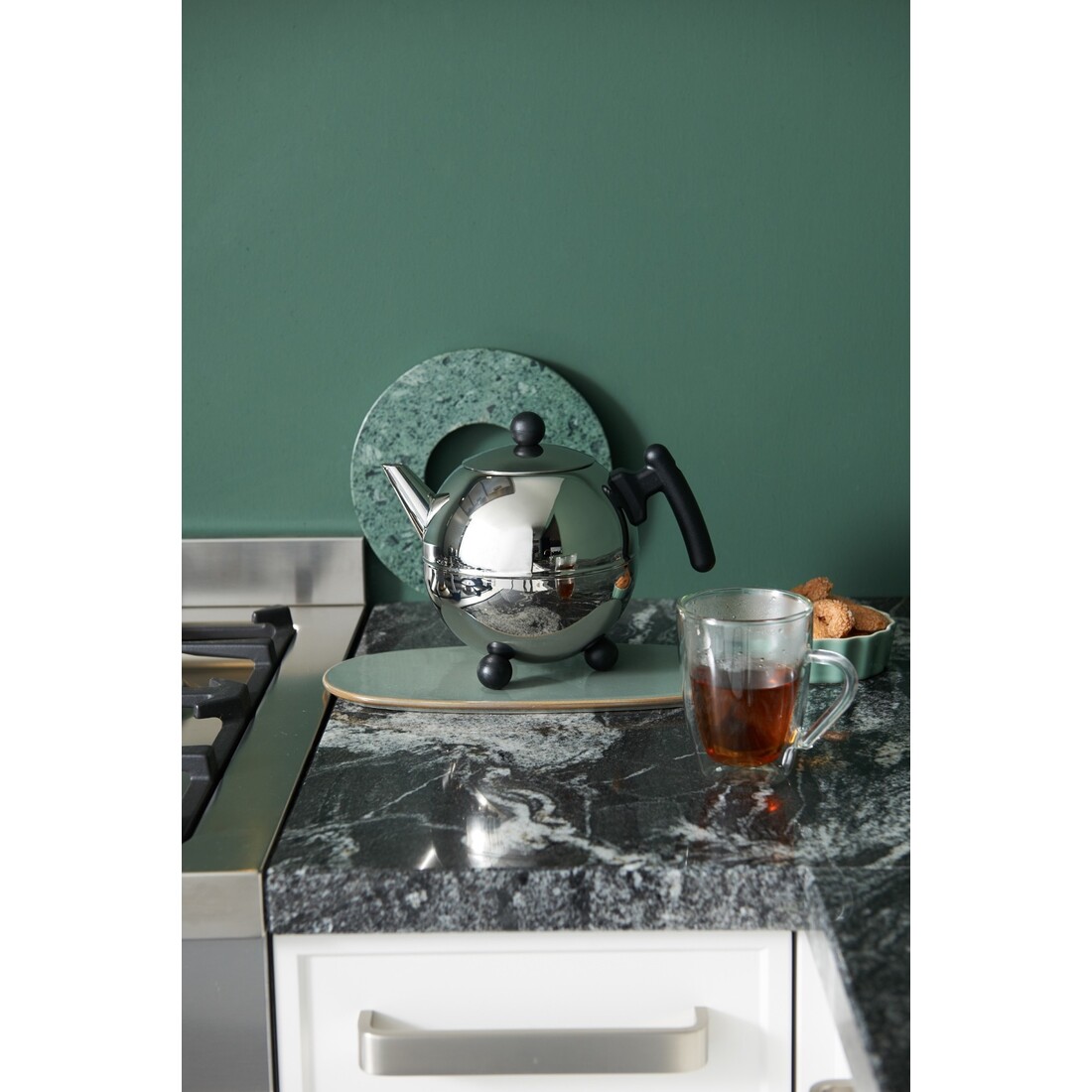 Heerlijke thee uit deze klassieke dubbelwandige theepot van hoogglanzend metaal. De thee wordt lang op temperatuur gehouden. Door de fijne schenktuit kunt u eenvoudig de thee in de theeglazen schenken. Inhoud 1,5 ltr. De theepot heeft een RVS kleur met natuurzwart beslag.
