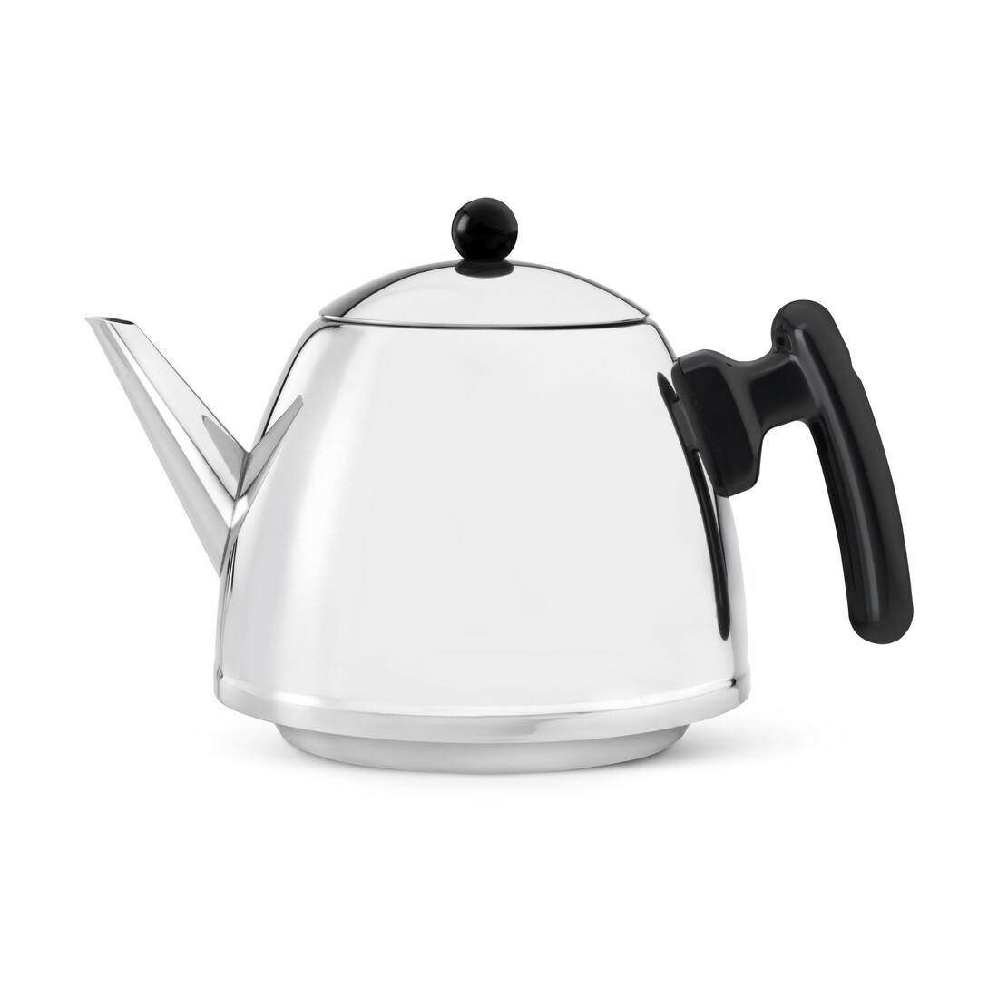 Deze prachtige dubbelwandige theepot van hoogglanzend metaal met zwart beslag is een solide topper van Bredemeijer. Dankzij het isolerende ontwerp blijft de thee op temperatuur en kunt u toch zonder problemen de handgreep vastpakken. Gemakkelijk schenken dankzij de schenktuit. Inhoud 1,2 ltr.