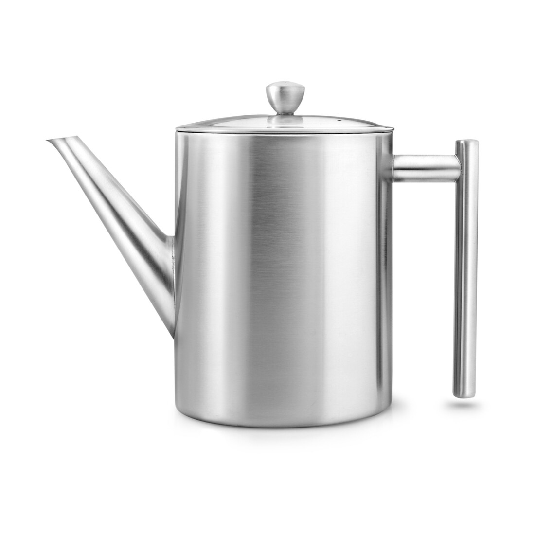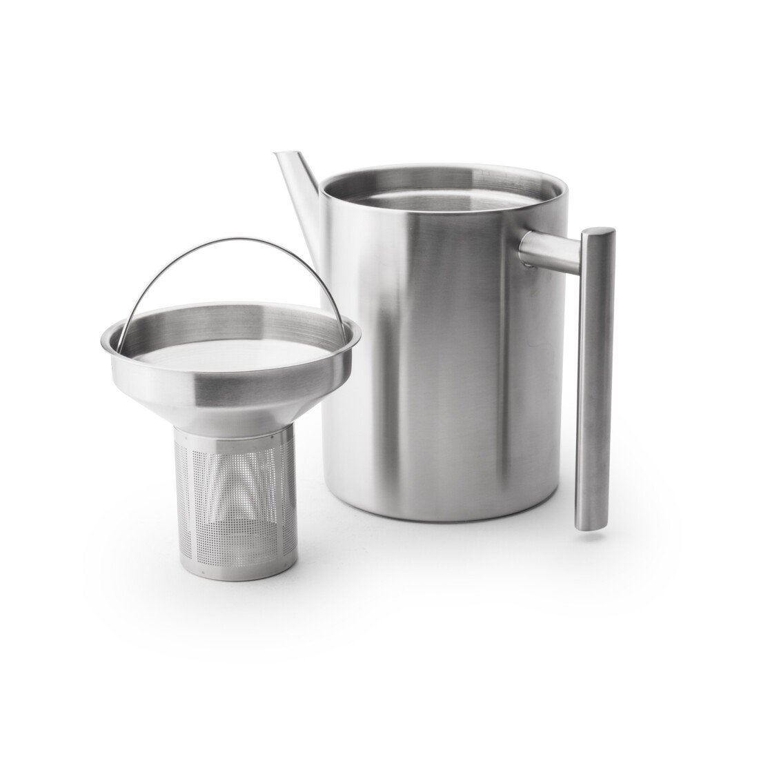 Dubbelwandige theepot gematteerd metaal. De isolerende werking zorgt voor een ideaal temperatuurverloop. Inclusief het losse theefilter waardoor de theepot ook bijzonder geschikt is voor losse thee.