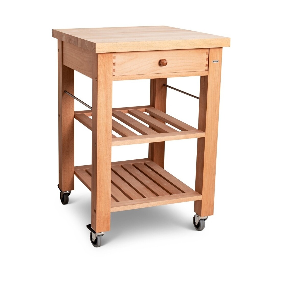De Butler keukentrolley M-600 is jouw perfecte keukenhulp. De trolley biedt extra werk- en opbergruimte. Je gebruikt hem in de keuken of tijdens het serveren van maaltijden. Gemaakt van beukenhout en met een 4 cm dik bovenblad van langshout. Om alles goed op te bergen heeft de keukentrolley één lade en een ophangstang aan beide zijden. Er is daarnaast voldoende ruimte voor de apart verkrijgbare rieten mand, kies dan voor de grote variant.