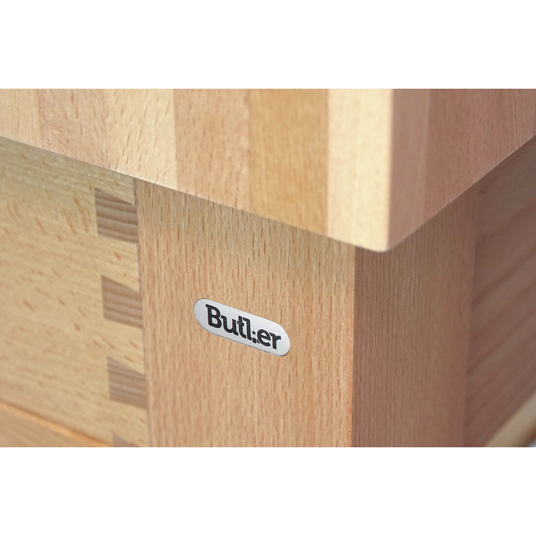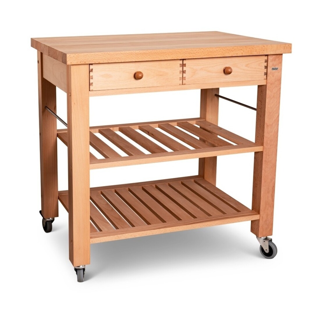 De Butler keukentrolley M-900 is jouw perfecte keukenhulp. De trolley biedt extra werk- en opbergruimte. Je gebruikt hem in de keuken of tijdens het serveren van maaltijden. Gemaakt van beukenhout en met een 4 cm dik bovenblad van langshout. Om alles goed op te bergen heeft de keukentrolley twee lades en een ophangstang aan beide zijden. Er is daarnaast voldoende ruimte voor twee apart verkrijgbare rieten manden, kies dan voor de kleine variant.