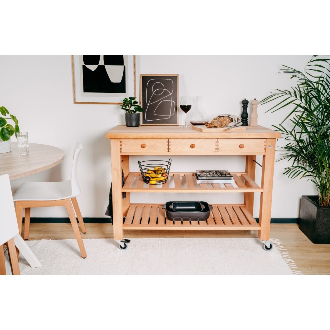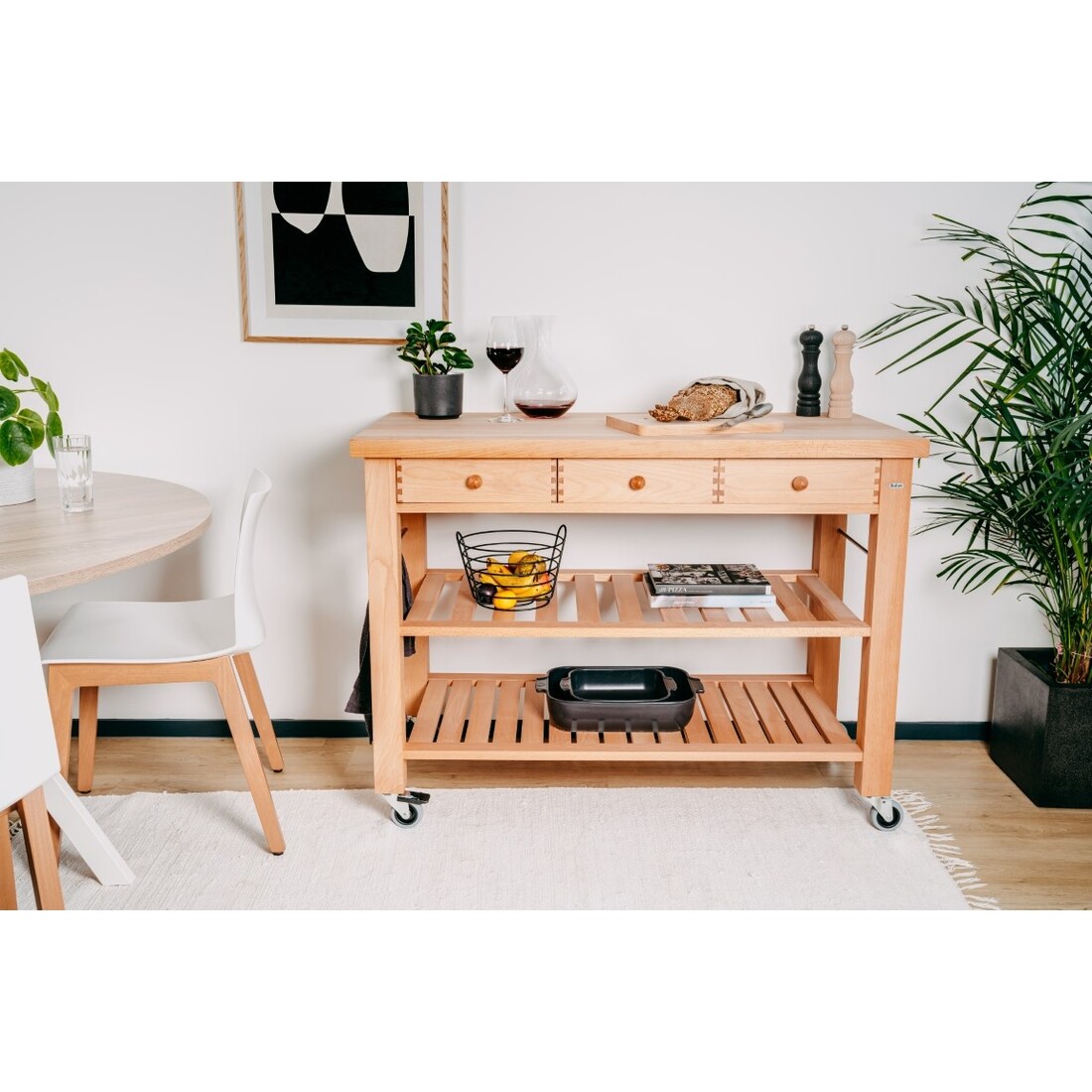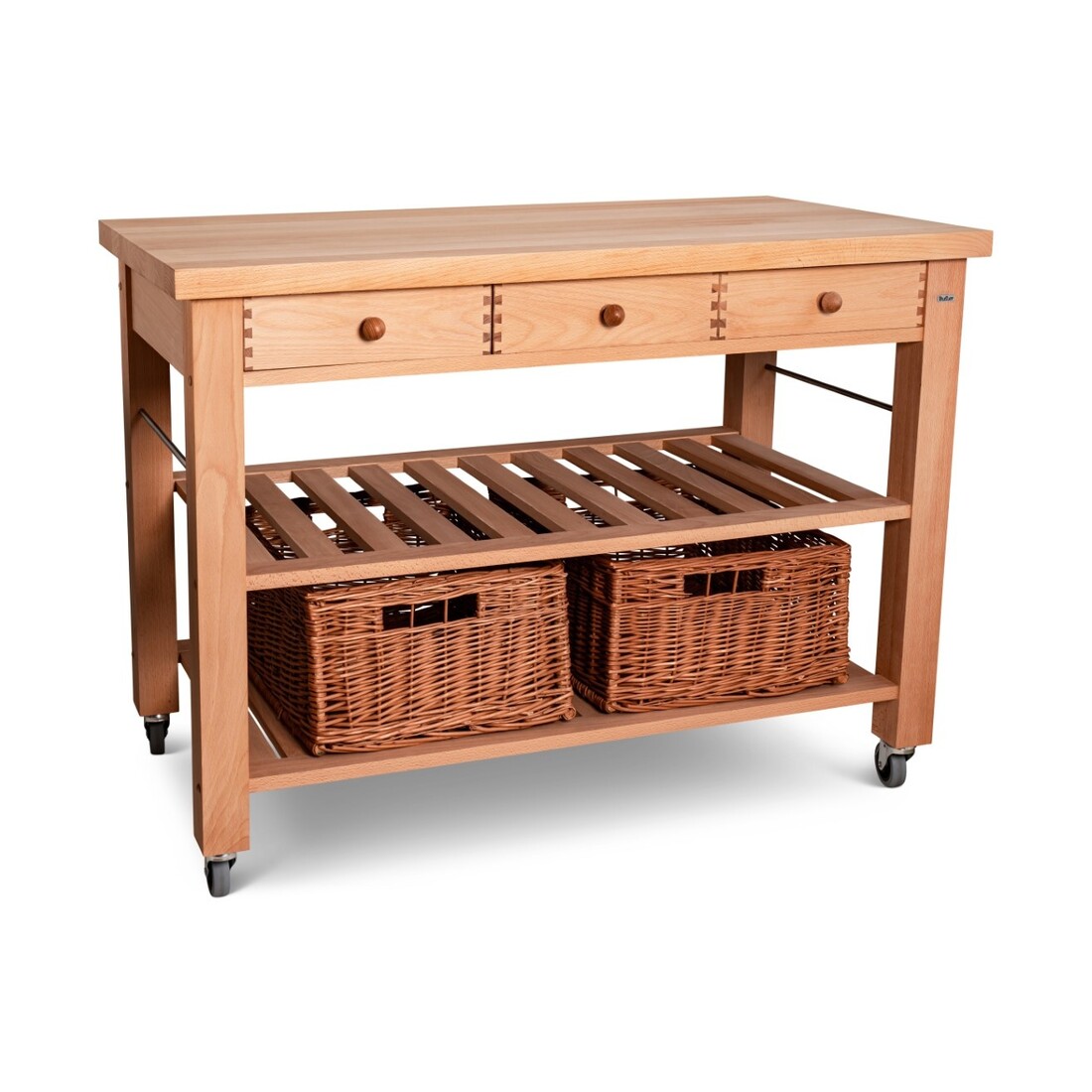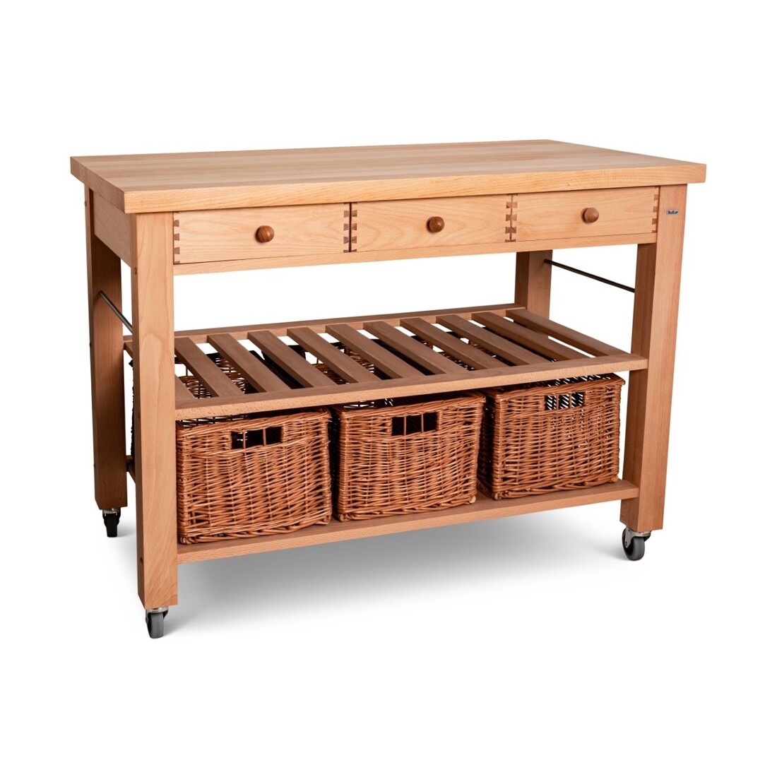 De Butler keukentrolley M-1200 is jouw perfecte keukenhulp. De trolley biedt extra werk- en opbergruimte. Je gebruikt hem in de keuken of tijdens het serveren van maaltijden. Gemaakt van beukenhout en met een 4 cm dik bovenblad van langshout. Om alles goed op te bergen heeft de keukentrolley drie lades en een ophangstang aan beide zijden. Er is daarnaast voldoende ruimte voor drie apart verkrijgbare rieten manden. Kies hierbij voor één kleine mand en twee grote manden.