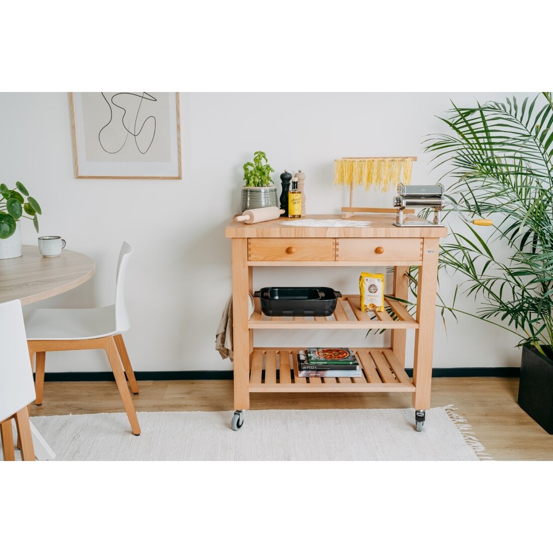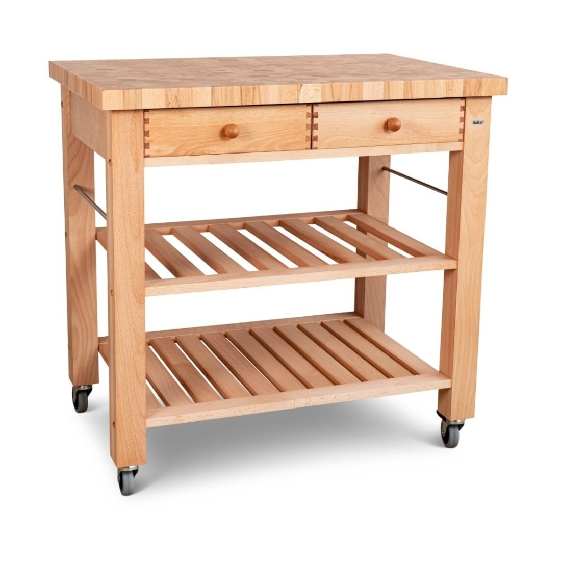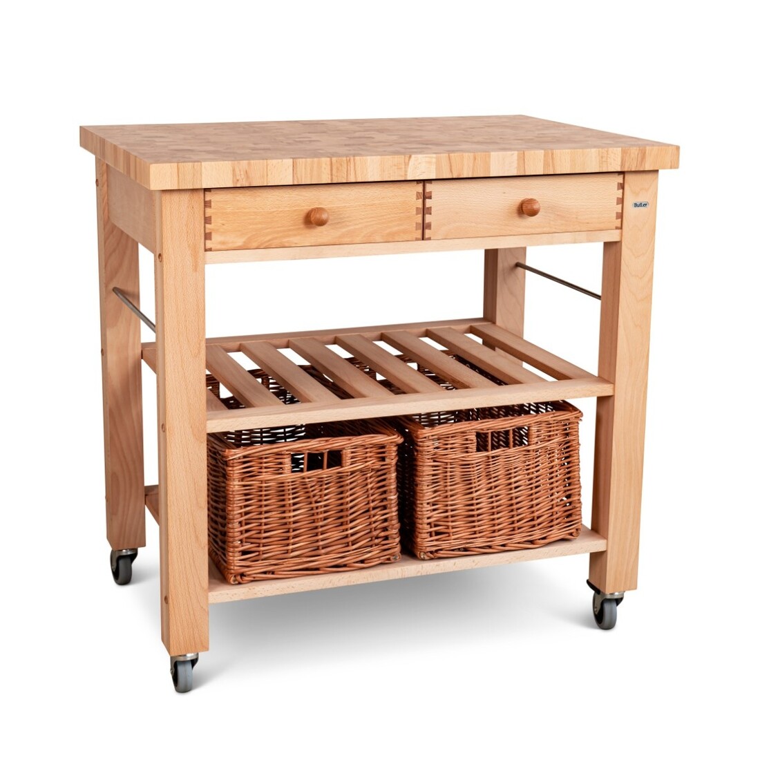 De Butler keukentrolley M-900, kopshout, is jouw perfecte keukenhulp. De trolley biedt extra werk- en opbergruimte. Je gebruikt hem in de keuken of tijdens het serveren van maaltijden. Gemaakt van beukenhout en met een 4 cm dik bovenblad van kopshout. Het bovenblad is voorzien van een beschermende laklaag. Om alles goed op te bergen heeft de keukentrolley twee lades en een ophangstang aan beide zijden. Er is daarnaast voldoende ruimte voor twee apart verkrijgbare rieten manden, kies dan voor de kleine variant.