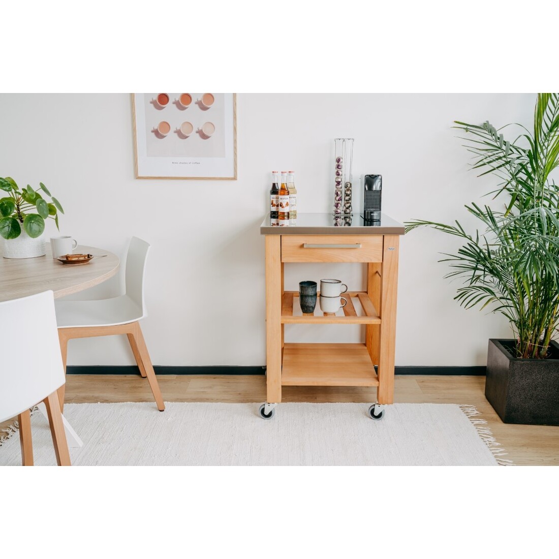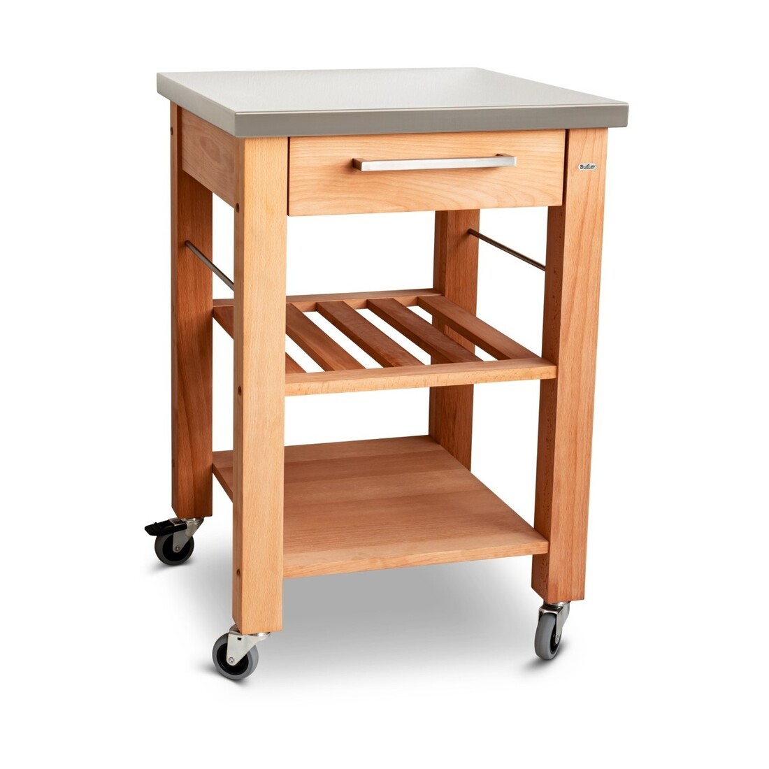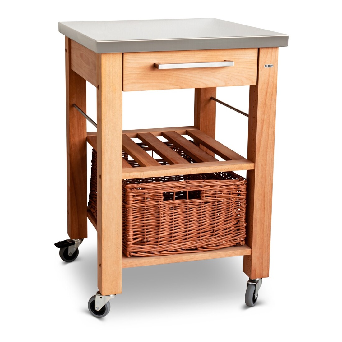 De Butler keukentrolley M-600, roestvrij staal, is jouw perfecte keukenhulp. De trolley biedt extra werk- en opbergruimte. Je gebruikt hem in de keuken of tijdens het serveren van maaltijden. Gemaakt van beukenhout en met een bovenblad van roestvrij staal. Om alles goed op te bergen heeft de keukentrolley één lade en een ophangstang aan beide zijden. Er is daarnaast voldoende ruimte voor een apart verkrijgbare rieten mand, kies dan voor de grote variant.