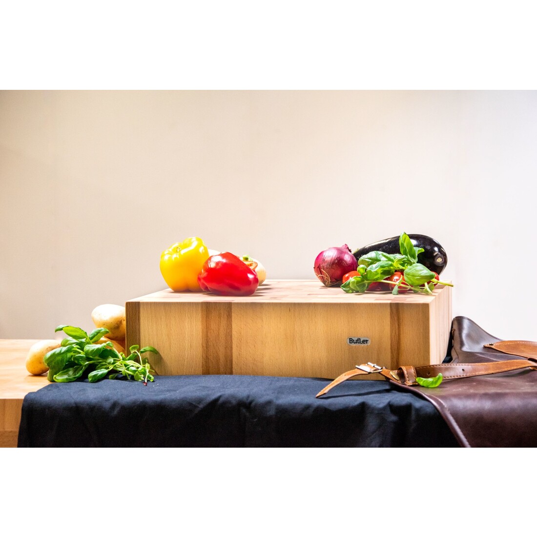Het Butler hakblok is voor de professionele thuiskoks. Het blok ligt stevig en stabiel op het aanrecht, zodat je op een veilige manier kan snijden. Het zware blok is 10 cm dik, waardoor je snijhoogte automatisch verhoogd wordt. Het Butler hakblok is gemaakt van een hoogwaardige kwaliteit massief kops beukenhout met FSC-keurmerk. Dit natuurlijke materiaal bespaart je messen tijdens het snijden, zo blijven ook je messen langer van hoge kwaliteit.