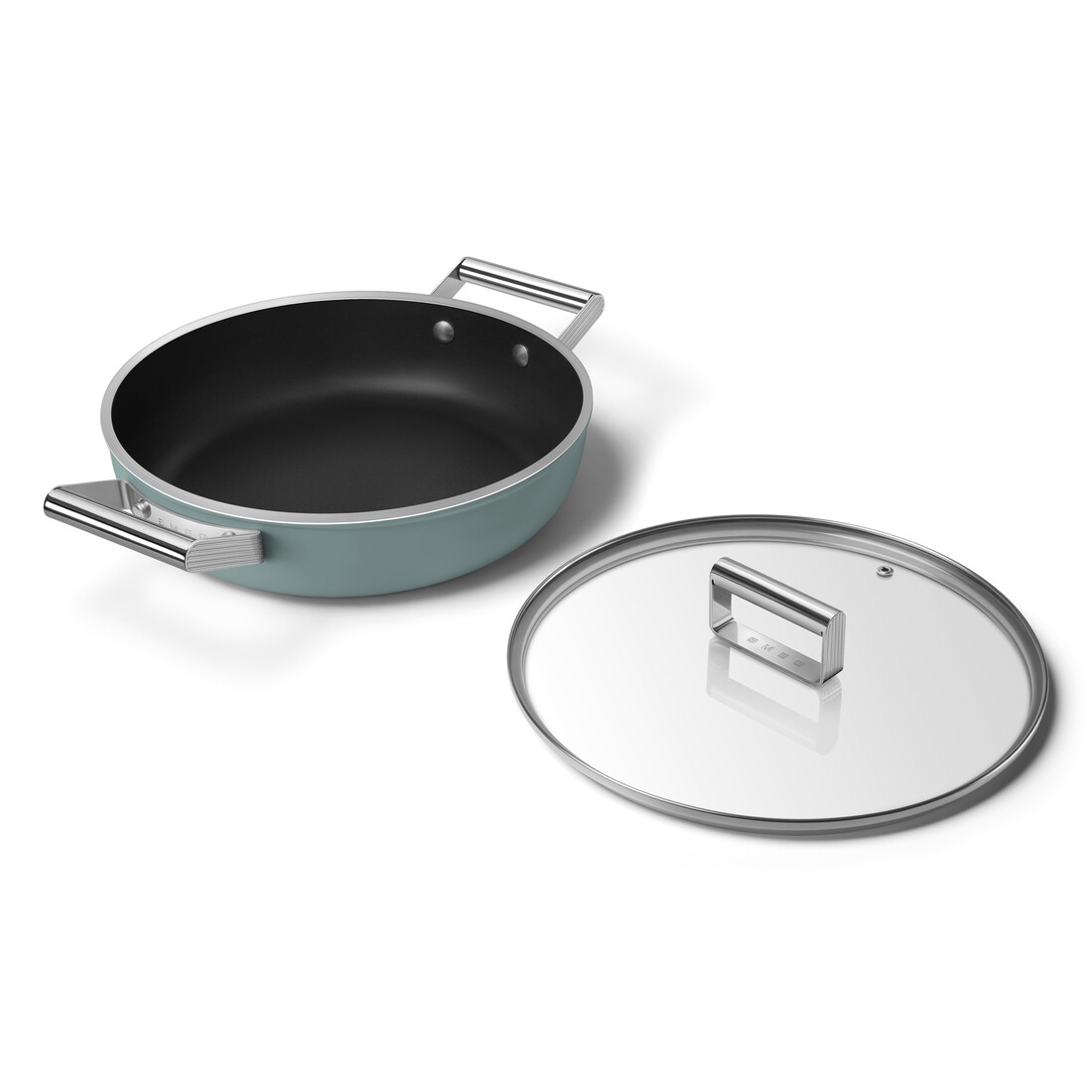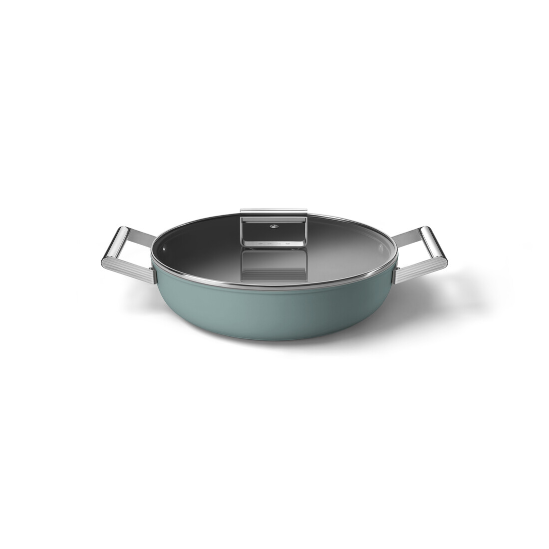 De bodem van roestvrij staal zorgt voor een goede warmtegeleiding en gelijkmatige verdeling van de hitte. Dit helpt om gerechten gelijkmatig te garen en voorkomt aanbranden. De pan is verkrijgbaar in drie kleuren: crème, mat zwart en emerald green. Net als andere SMEG-producten is ook deze pan ontworpen en geproduceerd in Italië, met oog voor kwaliteit en afwerking.