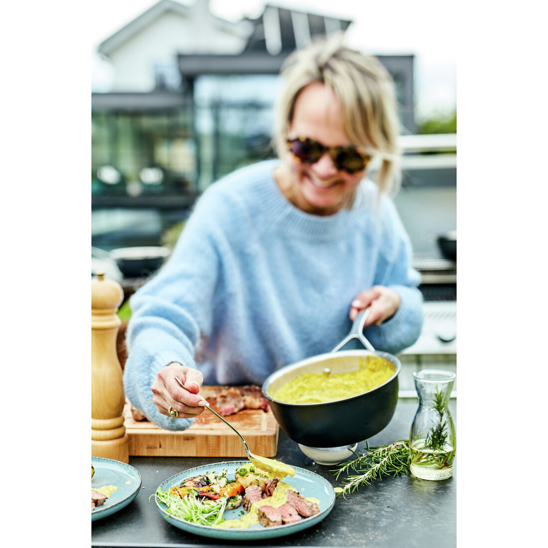 De Demeyere Black 5 pannen zijn jouw nieuwe keukenhelden voor binnen én buiten. De pannen hebben een stijlvolle mat zwarte coating, die ook nog eens hittebestendig is tot 400°C. De roestvrijstalen binnenzijde zorgt ervoor dat jij gerechten met de beste smaken klaarmaakt. De pannen zijn opgebouwd uit 5 lagen, wat zorgt voor een perfecte warmteverdeling en geweldige prestaties in de keuken. Deze iconische sauspan gebruik je om de lekkerste sauzen te maken bij jouw gerecht. De pan heeft een extra grote handgreep, waardoor je deze ook gemakkelijk met hittebestendige handschoenen vastpakt. De pan heeft een diameter van 20 cm en een inhoud van 2 liter. Geschikt voor iedere warmtebron!