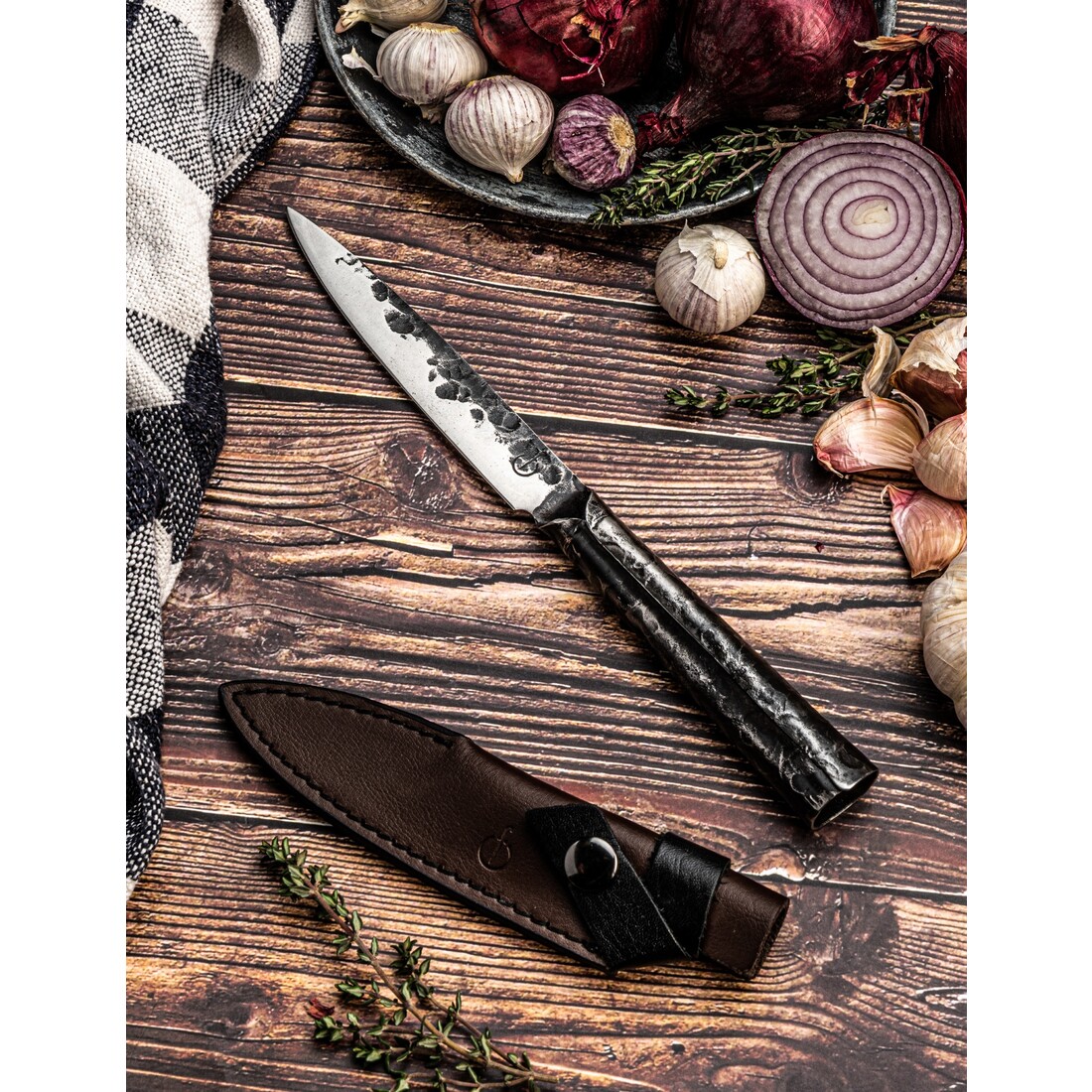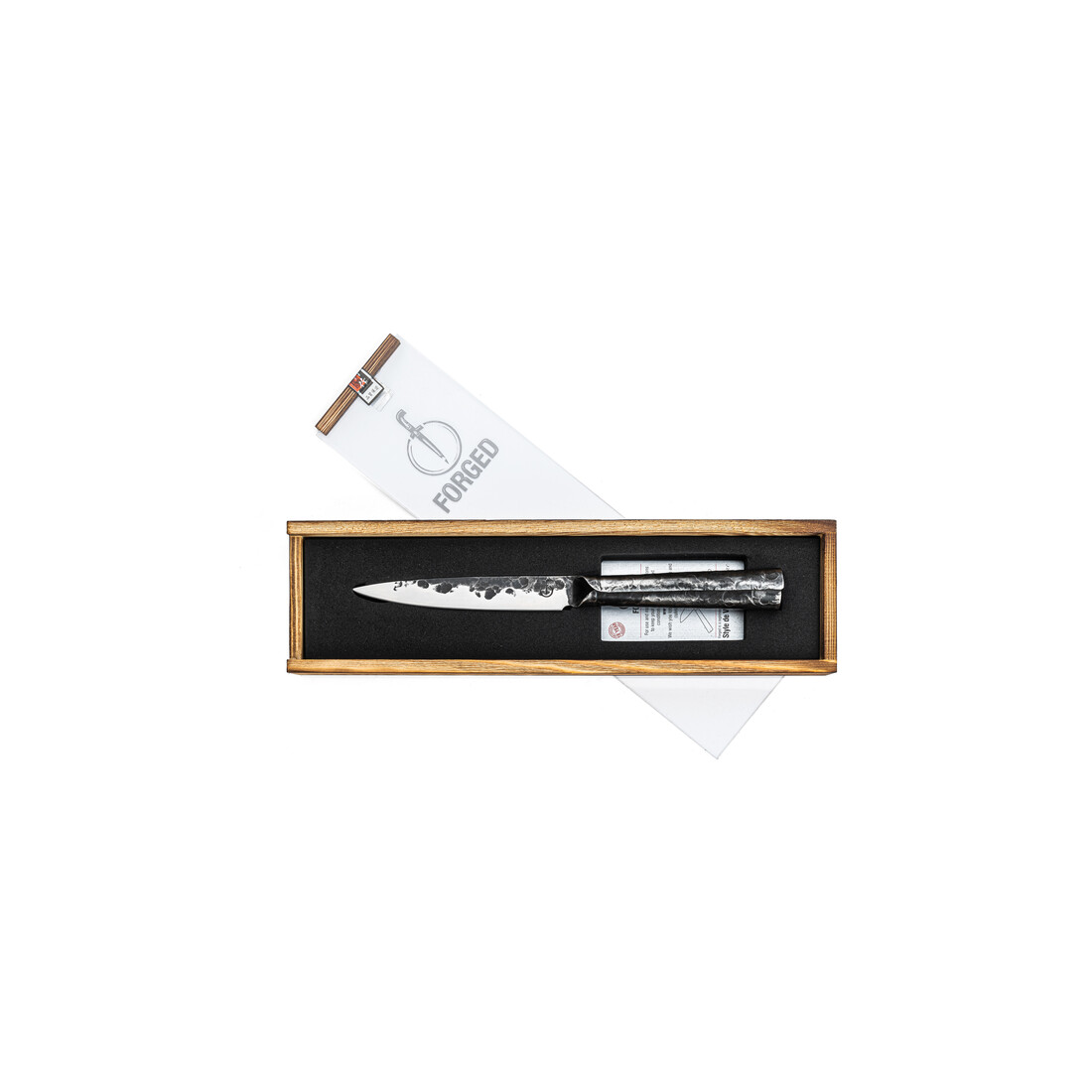 Dit Officmes uit de Brute serie van het merk Forged heeft een lengte van 12cm. Forged messen worden met de hand vervaardigd uit roestvrij staal en hebben een machinaal en grof uiterlijk. Het handvat wordt gemaakt van opgerold roestvrij staal. De krop en de achterkant zijn open gelaten en creeëren een unieke look. Elk Forged mes wordt geleverd in een gebrand houten kistje met Forged logo.