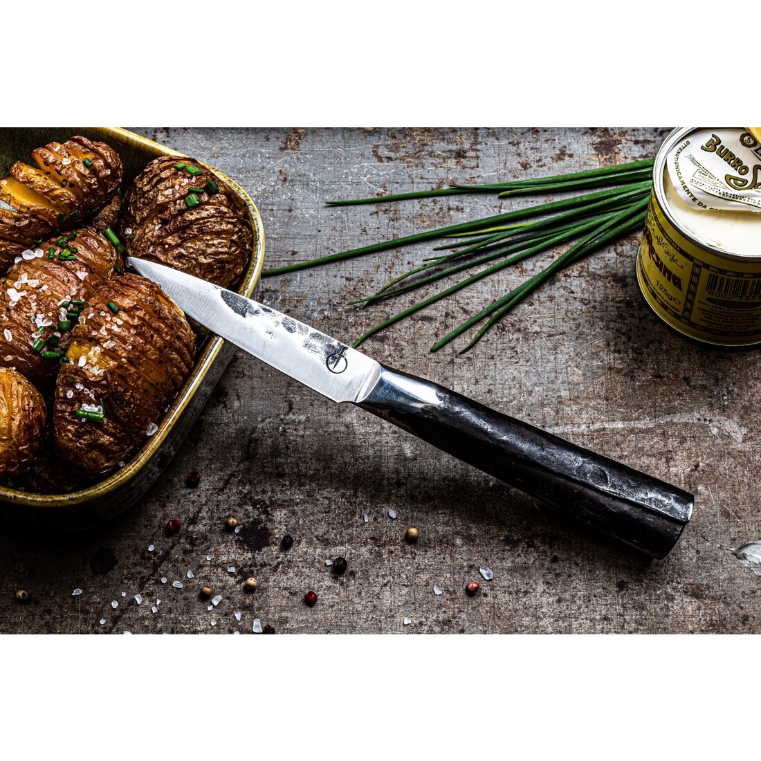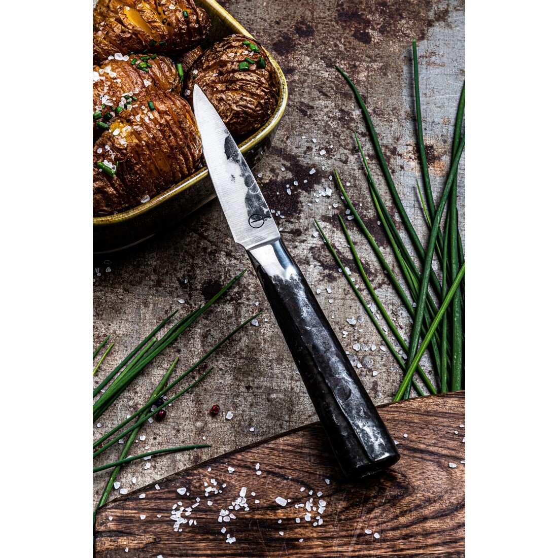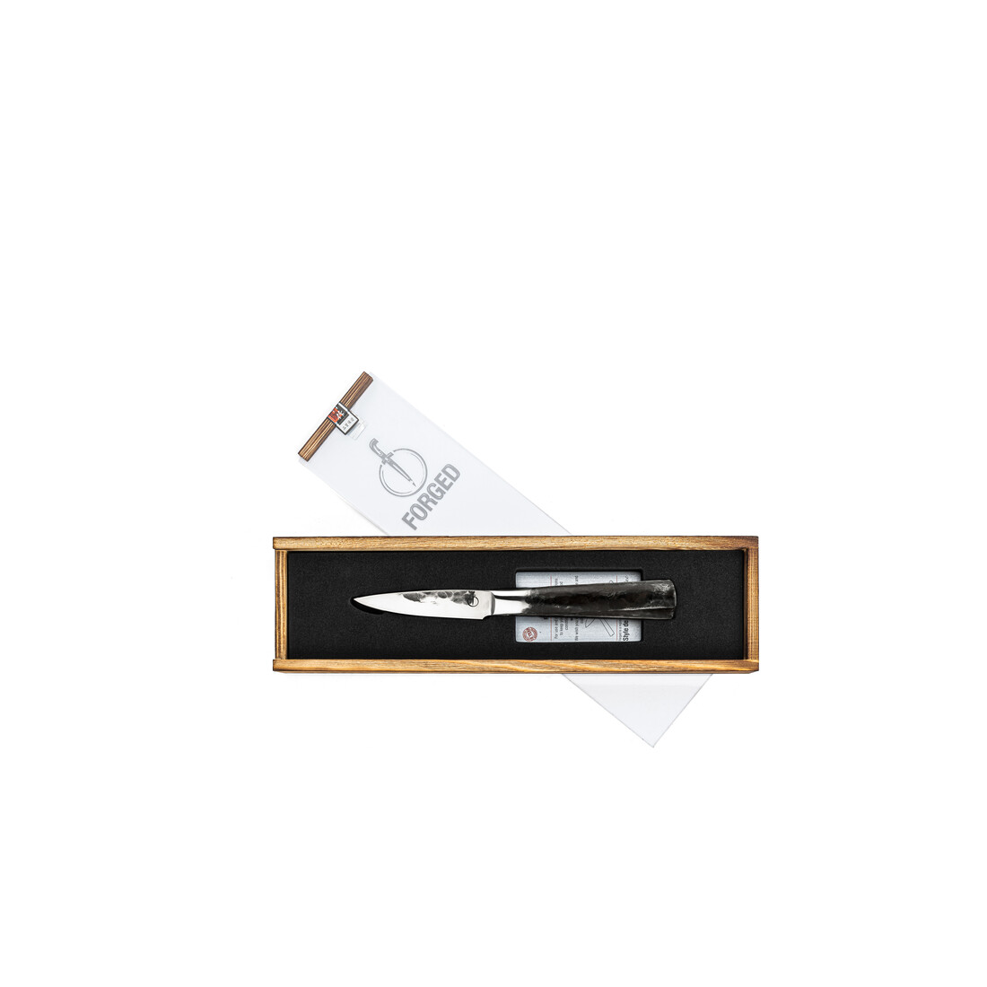 Het Forged Intense schilmesje is het kleinste mes uit de serie. Dit mesje is dan ook perfect geschikt voor het snijden van groente of het schillen van aardappels. Forged messen worden met de hand gemaakt van roestvrij staal. Het lemmet wordt vlijmscherp afgeleverd en is voorzien van het Forged logo. Het handvat is gemaakt van gebogen roestvrij staal. Ondanks de groffe constructie liggen de messen zeer goed in de hand.