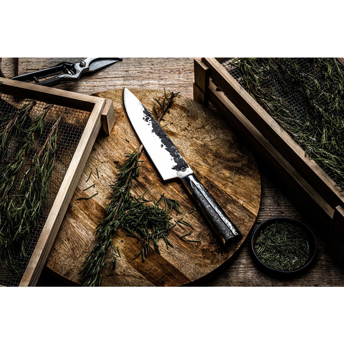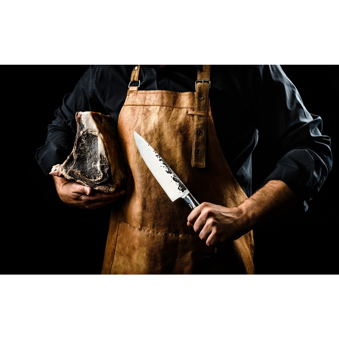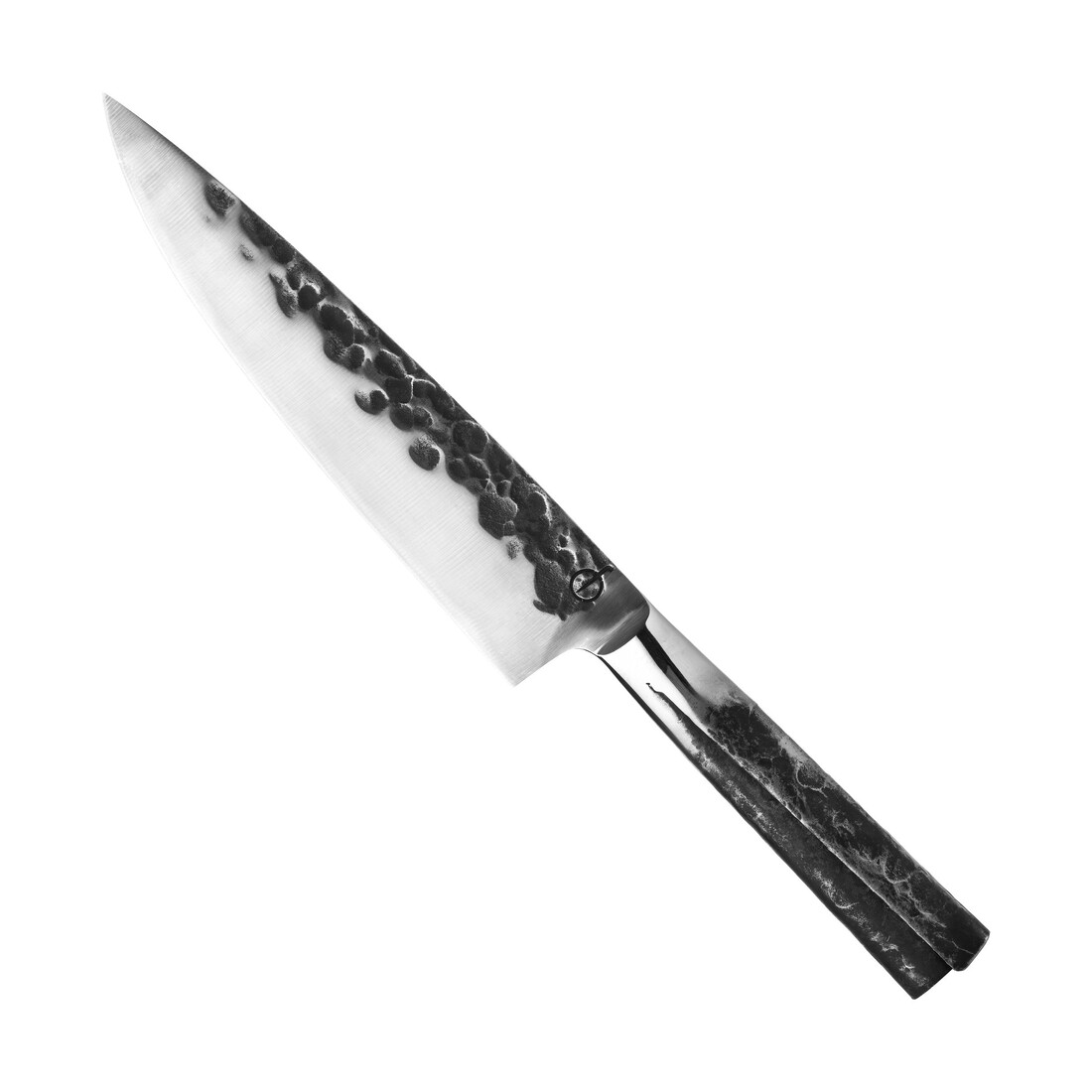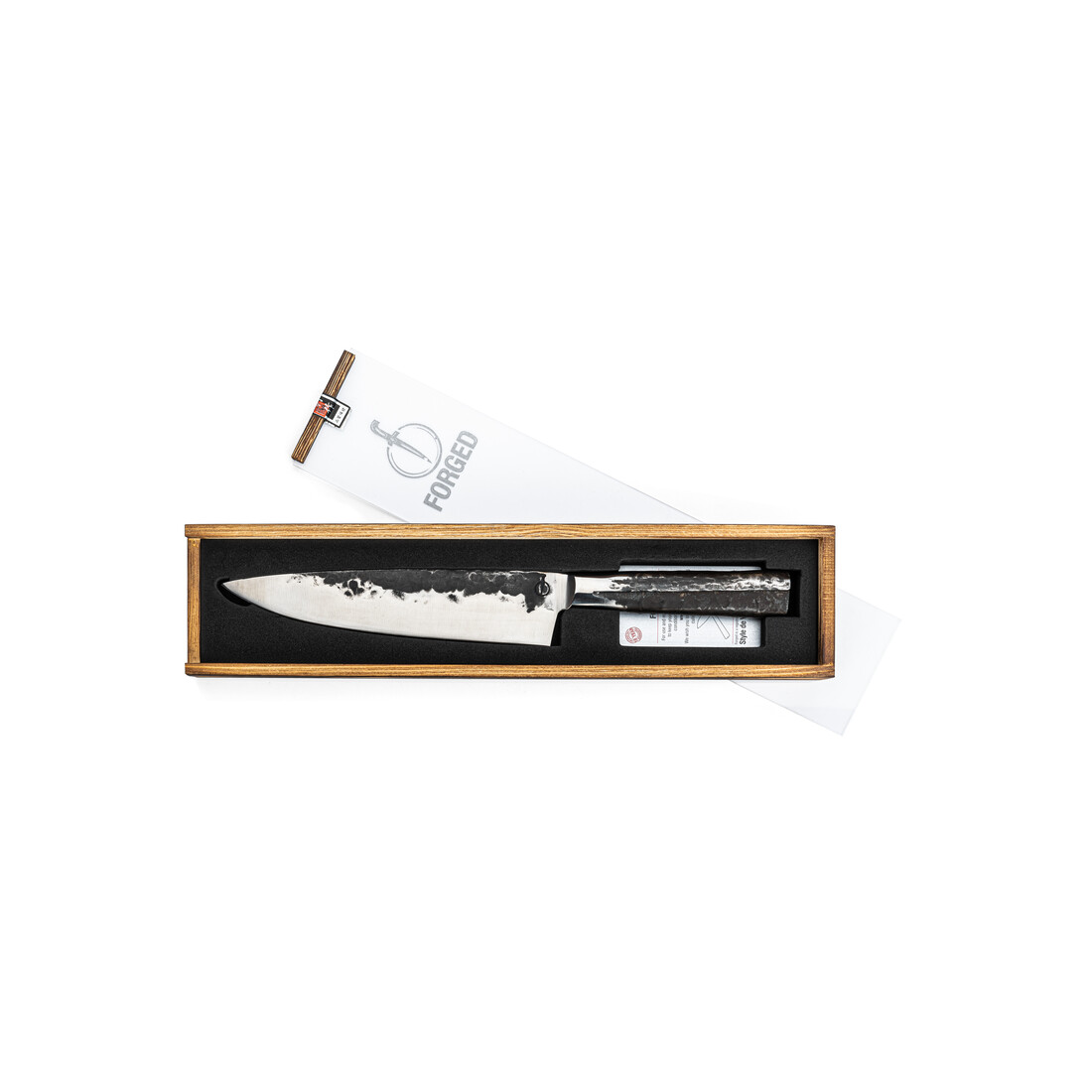 Dit koksmes uit de Intense Forged serie is geheel met de hand gemaakt. Het koksmes heeft een robuust en grof uiterlijk maar ligt des al niet te min uitstekend in de hand. Het handvat is gemaakt van omgebogen roestvrij staal en de krop is afgesloten. Dit Forged koksmes wordt geleverd in een luxe houten geschenkdoos. Ideaal dus om cadeau te doen!