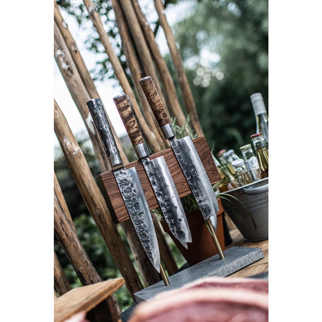 Het is een mooi vormgegeven mes met een robuuste uitstraling. Het handvat is bij het lemmet dichtgezet en verder hol van binnen. Ligt heel goed in de hand en is vlijmscherp. Wel wat prijzig maar het is het voor mij waard.