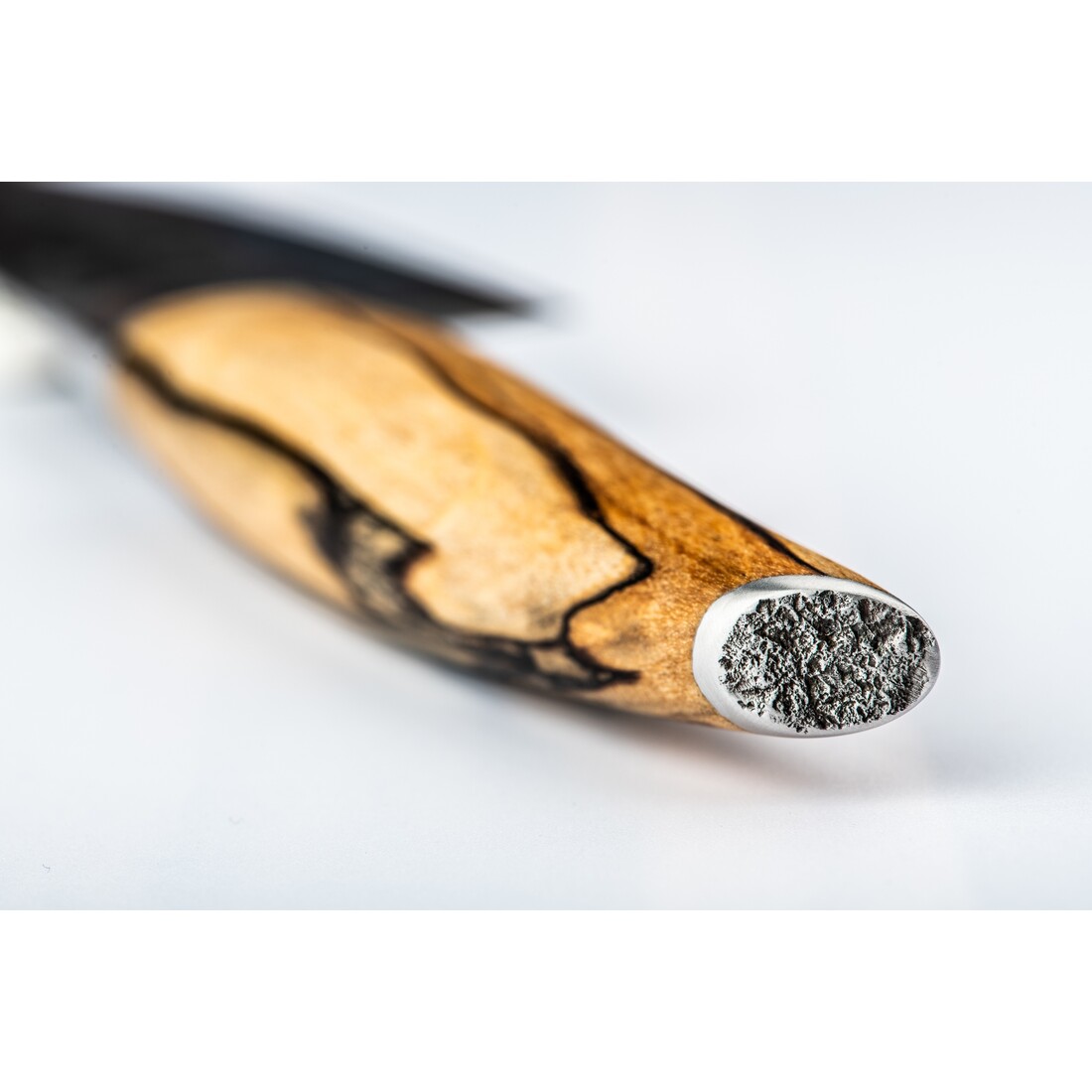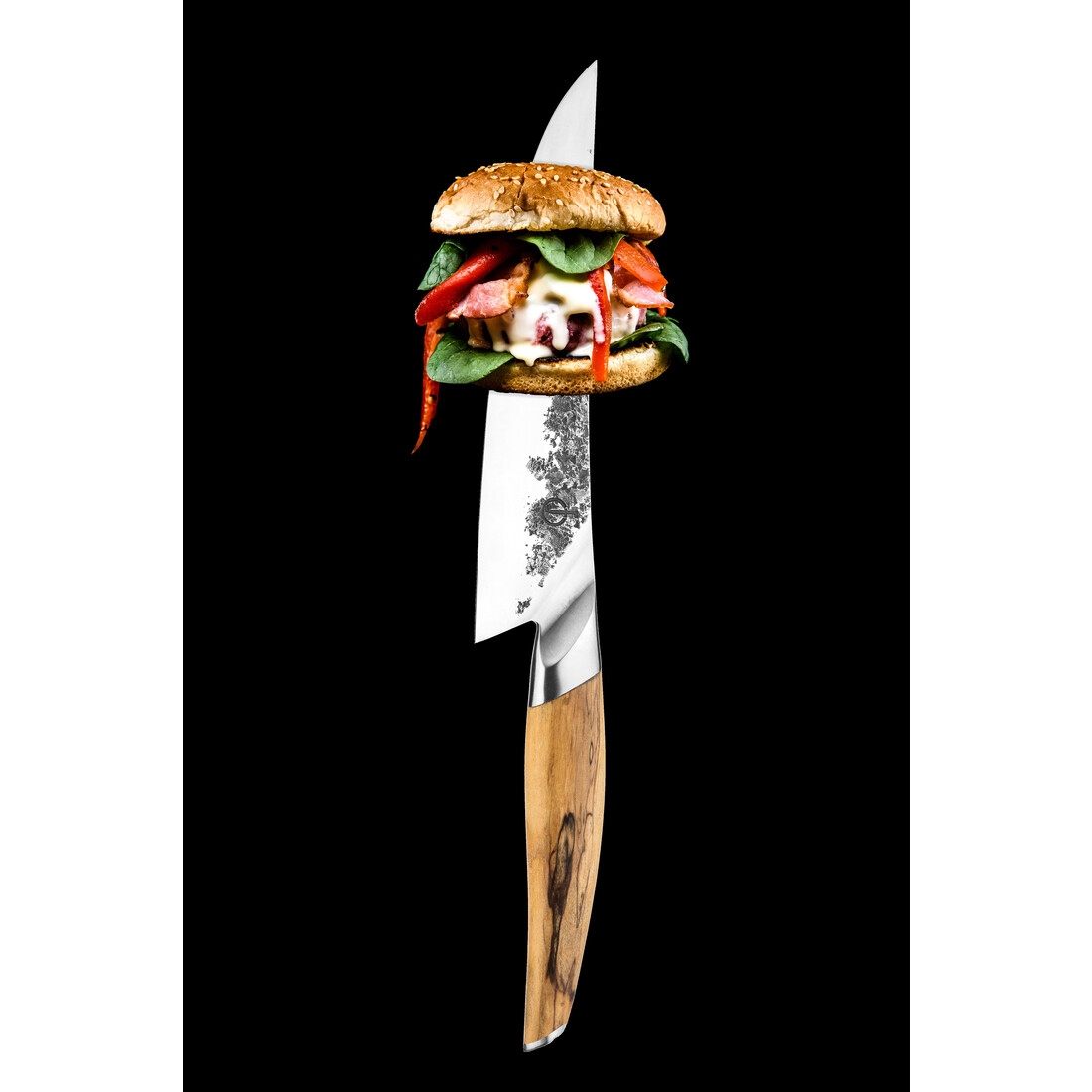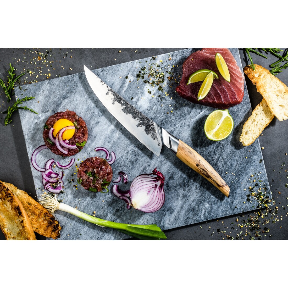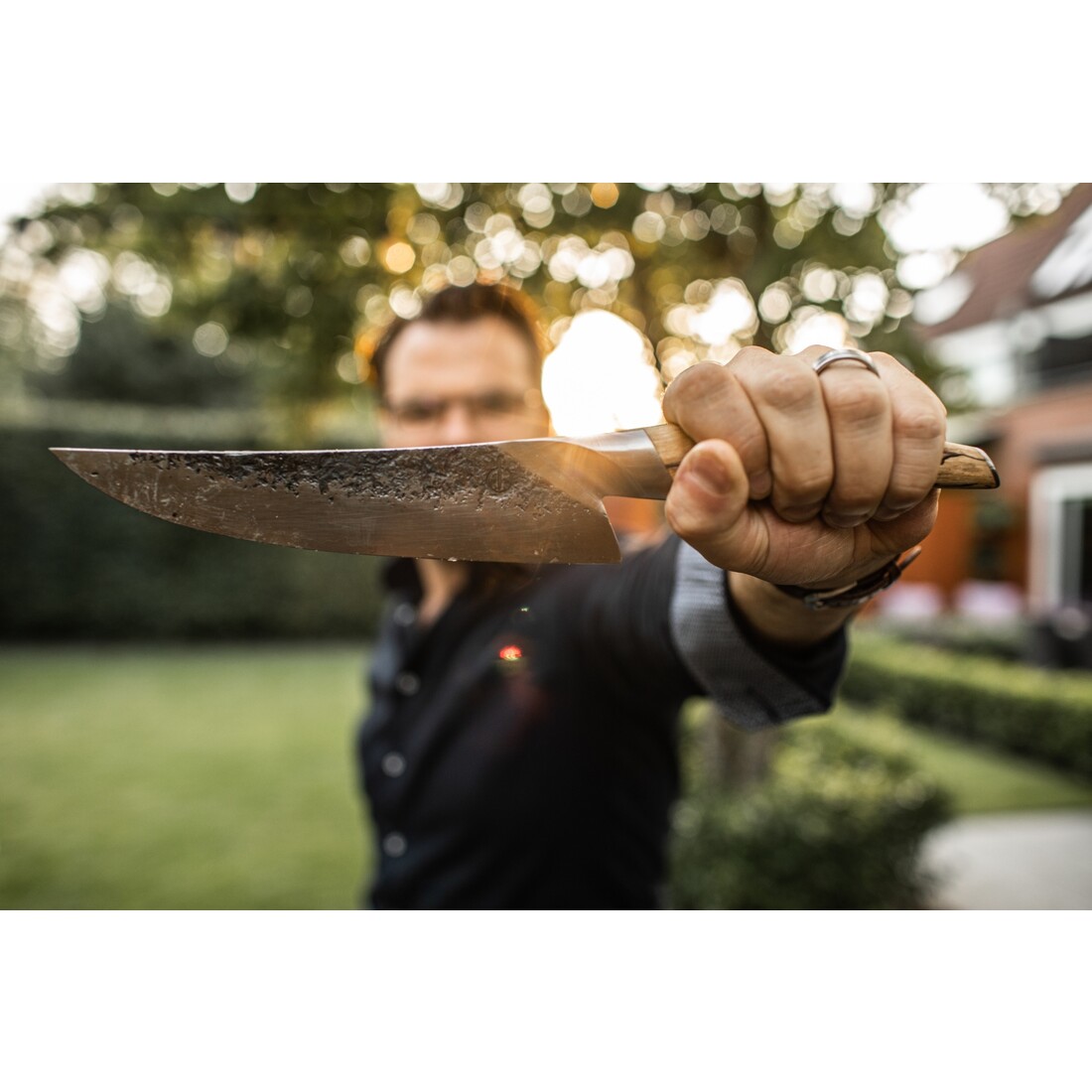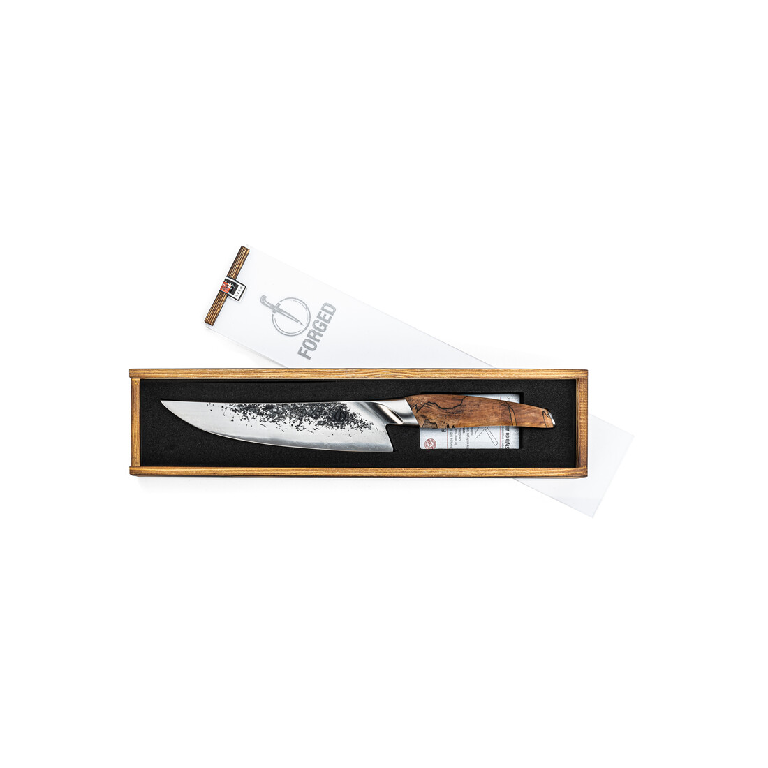 De Katai Forged serie is ontworpen met golfachtige vormen als inspiratiebron. Dit zie je direct terug aan de vorm van het lemmet, die helemaal tot in de handgreep doorloopt. Dit Koksmes heeft een lemmet van 20cm en is gemaakt van 5 lagen VG10 roestvrij staal. Dit zorgt voor uitzonderlijke scherpte, maar ook een goede elasticiteit en stevigheid. Op het lemmet bevindt zich ook de bekende hamerslag die Forged messen zo uniek maakt. Bij de Katai serie is de hamerslag met een fijne hamer nabewerkt, om zo een subtielere look te creëren. De handgrepen zijn gemaakt van prachtig wortelhout. De Katai Forged messen worden geleverd in prachtige geschenkverpakking en zijn voorzien van 10 jaar garantie.