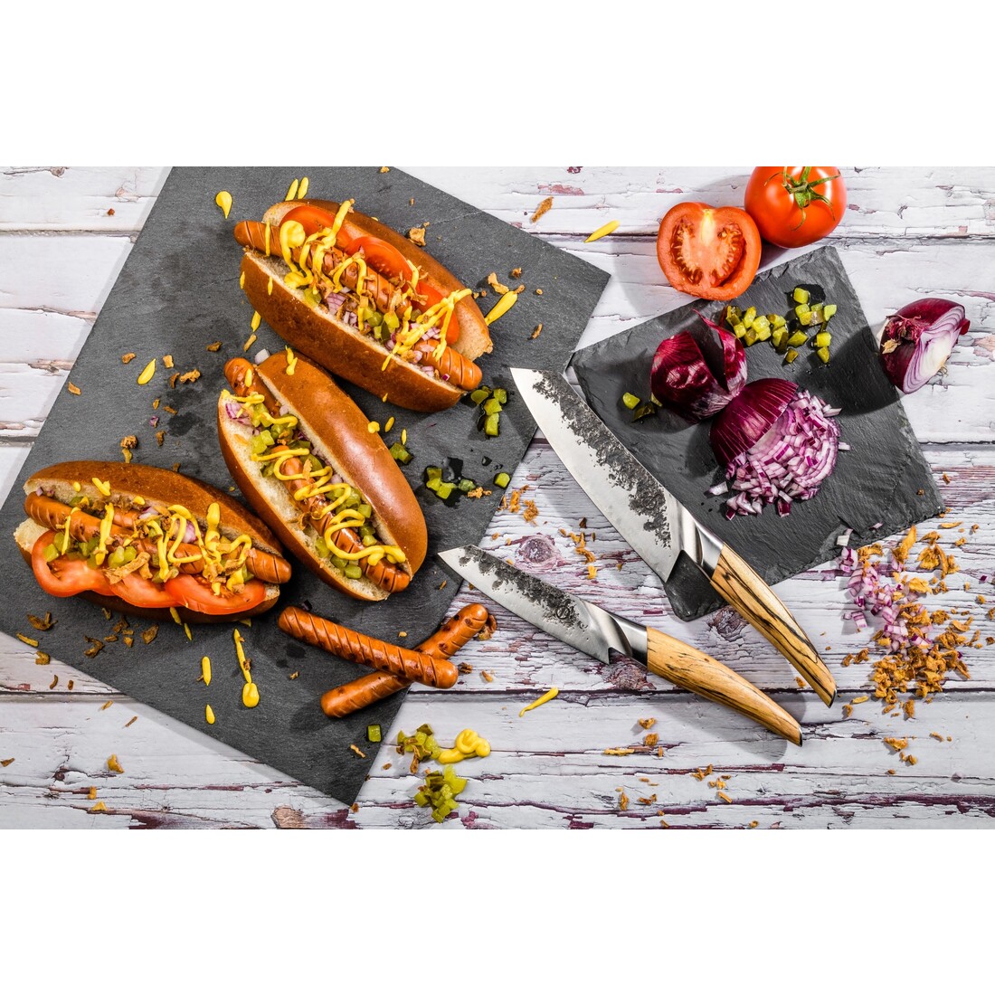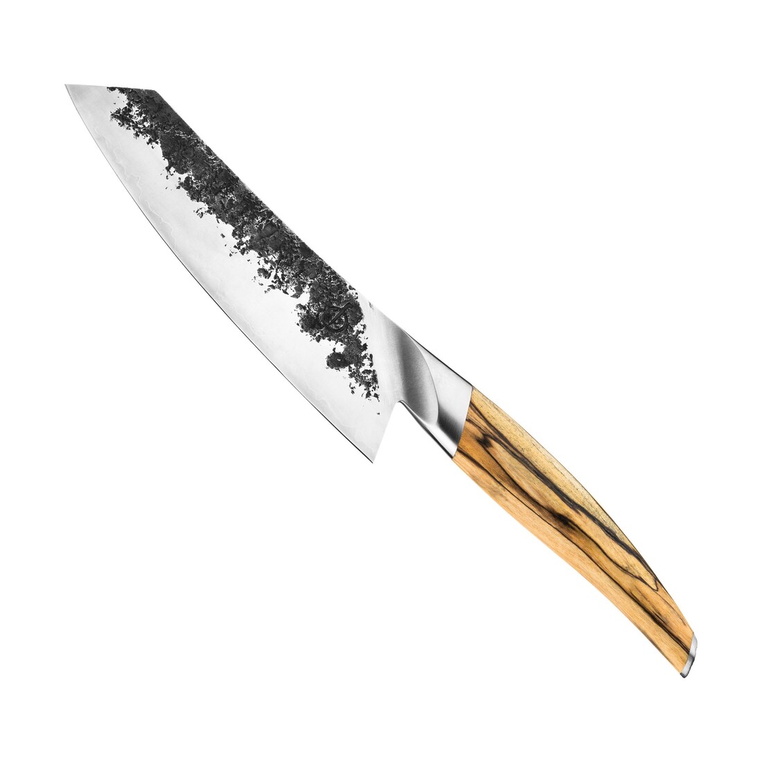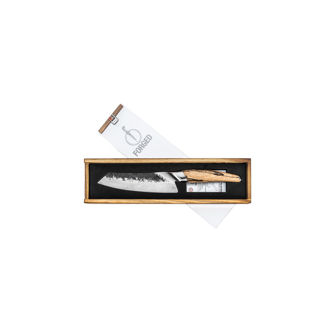 De Katai Forged serie is ontworpen met golfachtige vormen als inspiratiebron. Dit zie je direct terug aan de vorm van het lemmet, die helemaal tot in de handgreep doorloopt. Dit Santokumes heeft een lemmet van 18cm en is gemaakt van 5 lagen VG10 roestvrij staal. Dit zorgt voor uitzonderlijke scherpte, maar ook een goede elasticiteit en stevigheid. Op het lemmet bevindt zich ook de bekende hamerslag die Forged messen zo uniek maakt. Bij de Katai serie is de hamerslag met een fijne hamer nabewerkt, om zo een subtielere look te creëren. De handgrepen zijn gemaakt van prachtig wortelhout. De Katai Forged messen worden geleverd in prachtige geschenkverpakking en zijn voorzien van 10 jaar garantie.