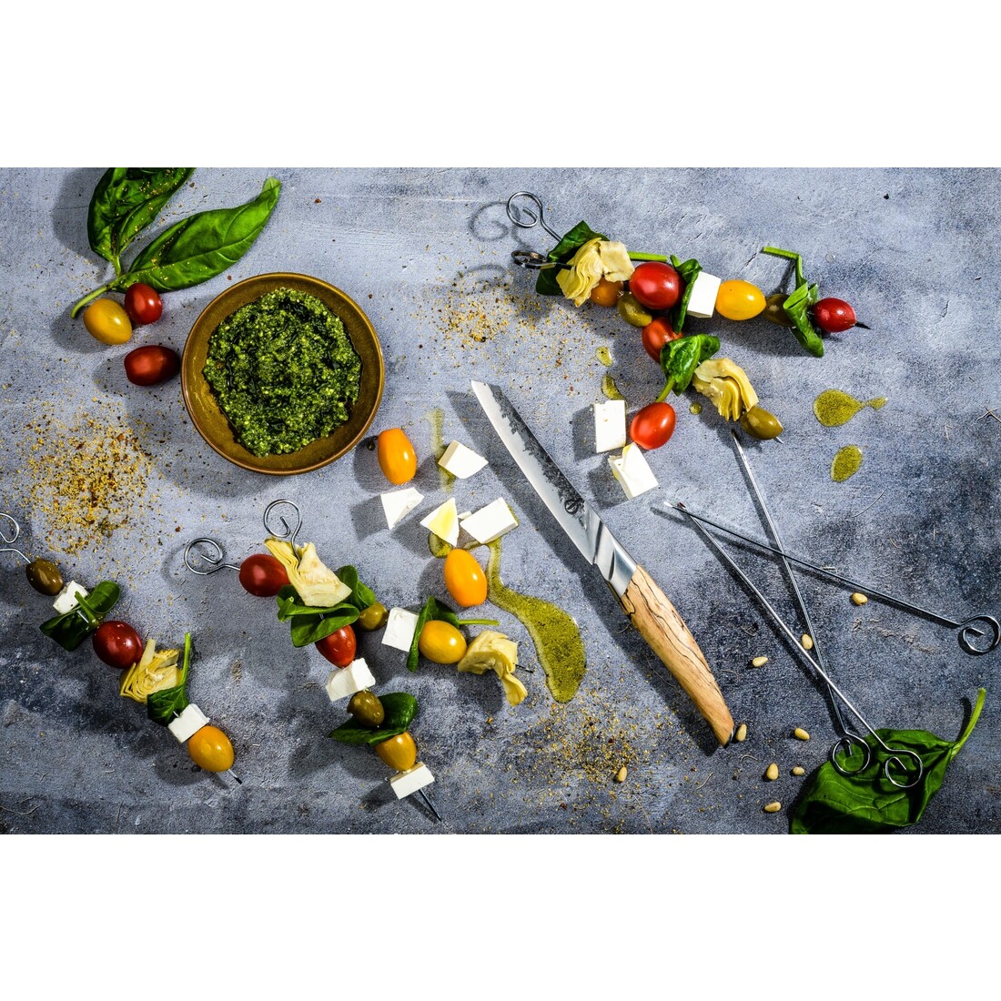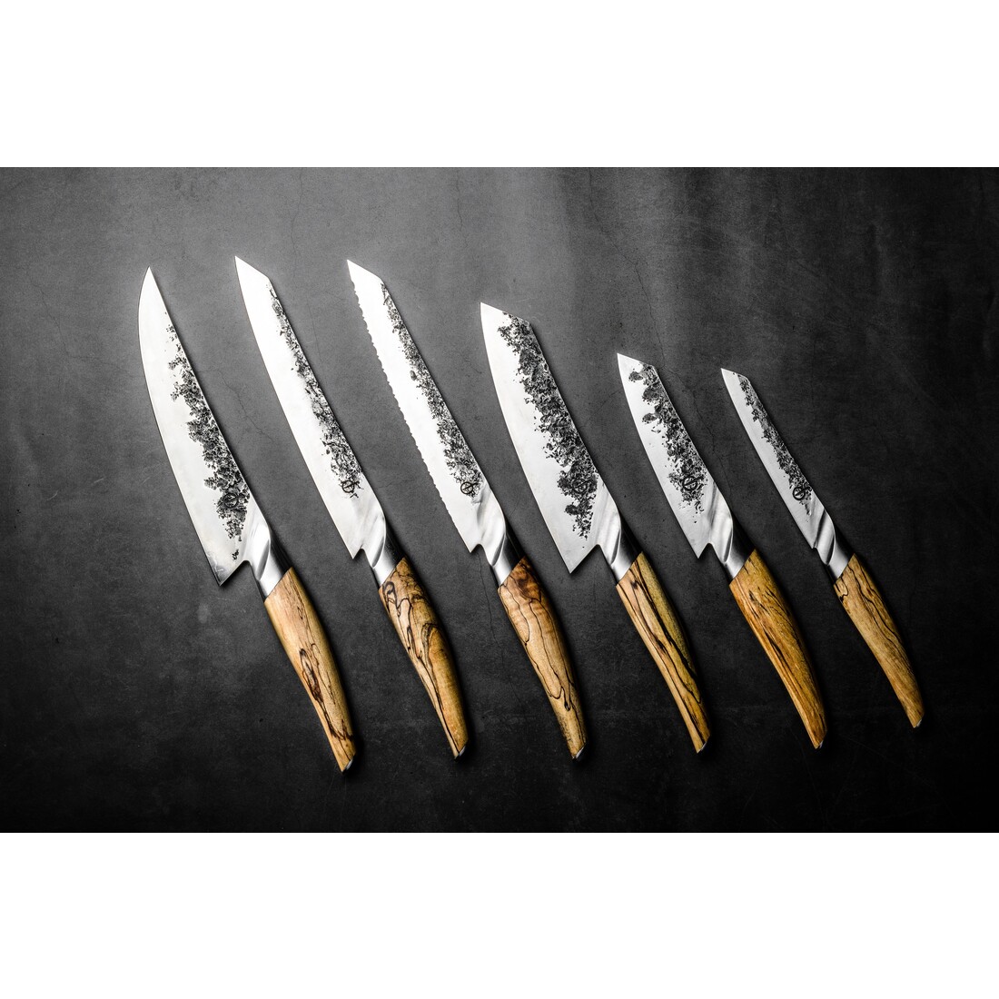 De Katai Forged serie is ontworpen met golfachtige vormen als inspiratiebron. Dit zie je direct terug aan de vorm van het lemmet, die helemaal tot in de handgreep doorloopt. Dit universele keukenmes heeft een lemmet van 12cm en is gemaakt van 5 lagen VG10 roestvrij staal. Dit zorgt voor uitzonderlijke scherpte, maar ook een goede elasticiteit en stevigheid. Op het lemmet bevindt zich ook de bekende hamerslag die Forged messen zo uniek maakt. Bij de Katai serie is de hamerslag met een fijne hamer nabewerkt, om zo een subtielere look te creëren. De handgrepen zijn gemaakt van prachtig wortelhout. De Katai Forged messen worden geleverd in prachtige geschenkverpakking en zijn voorzien van 10 jaar garantie.