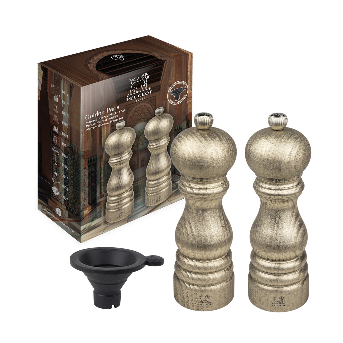 Dit stijlvolle duo van Peugeot combineert ambacht, kwaliteit en tijdloos design. De molens zijn vervaardigd uit beukenhout met een goudgepatineerde afwerking die de natuurlijke houtnerven zichtbaar maakt. Deze set brengt niet alleen smaak aan tafel, maar zien er ook erg feestelijk uit. Elke molen is uitgerust met een precisie-maalwerk dat ontworpen is voor optimale prestaties. De pepermolen is geschikt voor verschillende soorten peper en korianderzaad, terwijl de zoutmolen ideaal is voor droog, grof steenzout. Reinig deze set met een droge, zachte doek. Vermijd contact met water en plaats de molens niet in de vaatwasser.