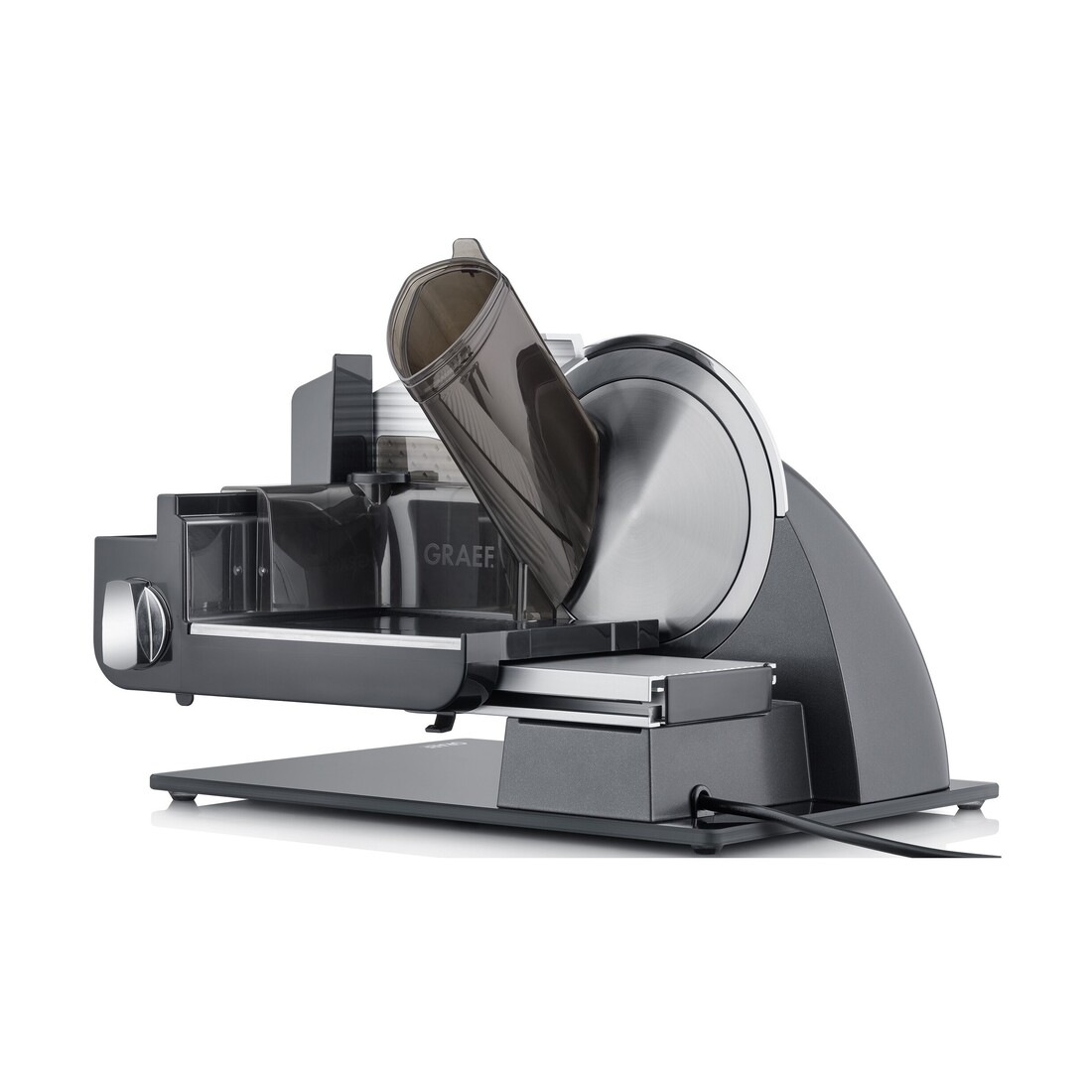De Graef Sliced Kitchen SKS702, vrijdragend, is een topmodel onder de snijmachines. Met de universele snijmachine snijd je makkelijk verse vleeswaren, kaas, groenten, fruit en brood. Daarnaast is deze snijmachine uitermate geschikt voor het snijden van flinterdunne plakjes, dankzij het holgeslepen mes van de machine. Uniek aan deze machine is dat zowel de instelknop als het snijgebied verlicht zijn, waardoor je goed zicht hebt op het te snijden product en de snijdikte. Bovendien verandert de verlichting na een minuut naar rood als het mes open staat, voor extra veiligheid. Je stelt de machine gemakkelijk in op een snijdikte van 0-20 mm. De roestvrijstalen mesafdekplaat van deze Sliced Kitchen voorkomt wrijving tussen het snijwaar en het draaiende mes. De machine heeft een snijmachine heeft een glad massief stalen mes. De snijmachine wordt geleverd met kunststof restenhouder en met opzetstuk 'mini-slice'. Ga voor een professionele machine met deze zwarte elektrische snijmachine.