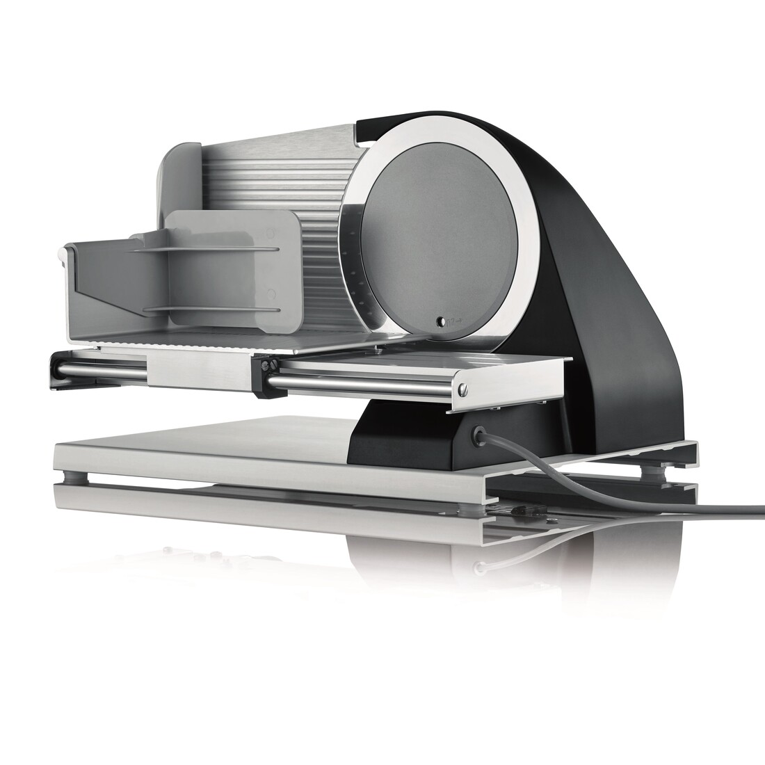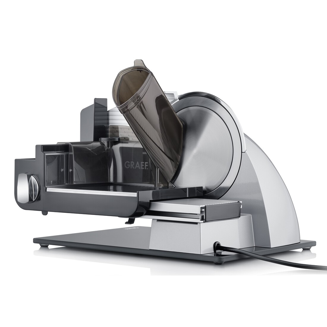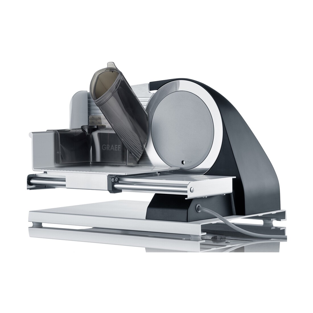 De Graef Sliced Kitchen SKS902, vrijdragend, is een moderne snijmachine. Met de universele snijmachine snijd je makkelijk verse vleeswaren, kaas, groenten, fruit en brood. Daarnaast is deze snijmachine uitermate geschikt voor het snijden van flinterdunne plakjes, dankzij het holgeslepen mes van de machine. Je stelt de machine gemakkelijk in op een snijdikte van 0-15 mm. De speciale mesafdekplaat van deze Sliced Kitchen voorkomt wrijving tussen het snijwaar en het draaiende mes. Dankzij de krachtige 185 watt motor is ook zwaarder snijwaar voor deze machine geen probleem. De snijmachine wordt geleverd met kunststof restenhouder en met opzetstuk 'mini-slice'. Ga voor een krachtige machine met deze zwarte elektrische snijmachine.