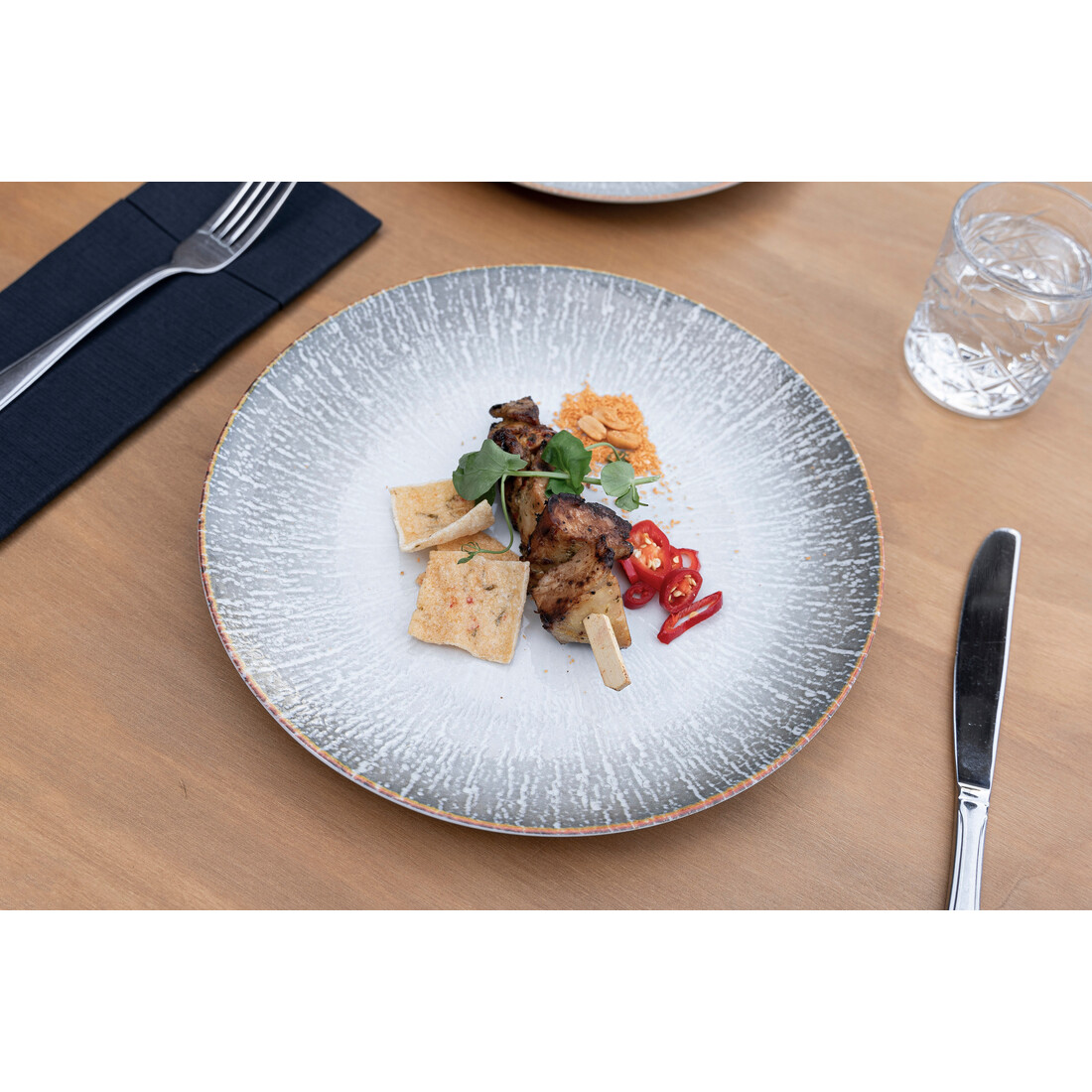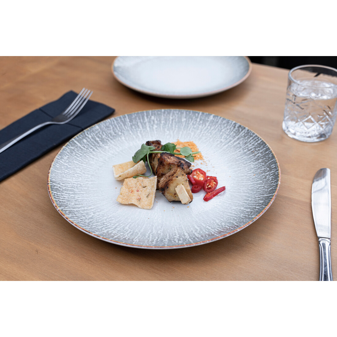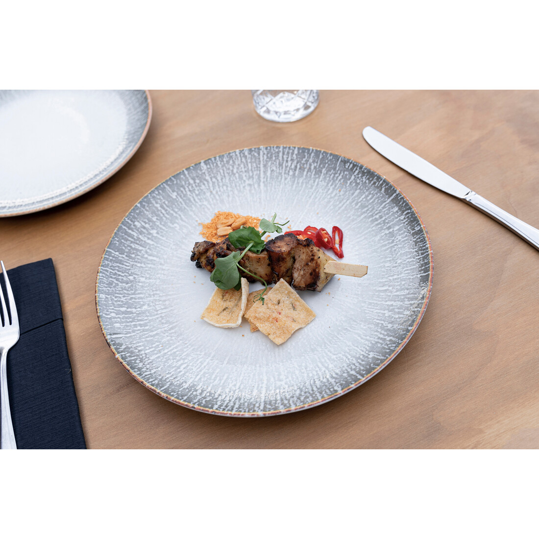Met de serie Juntos geef je ieder etentje een extra vleugje luxe! De borden zijn verkrijgbaar in 15 verschillende prints en twee verschillende formaten. Dit is de Juntos Grietas met een modern en robuust ontwerp. Het bord heeft een 'gebarsten' blauw/bruine look in de buitenste ring. Het midden is het bord wat lichter. Dit zorgt ervoor dat alle aandacht gaat naar het gerecht in het midden van dit bord!