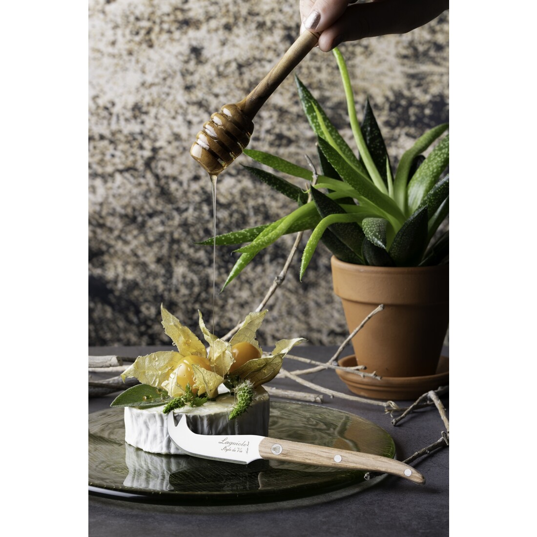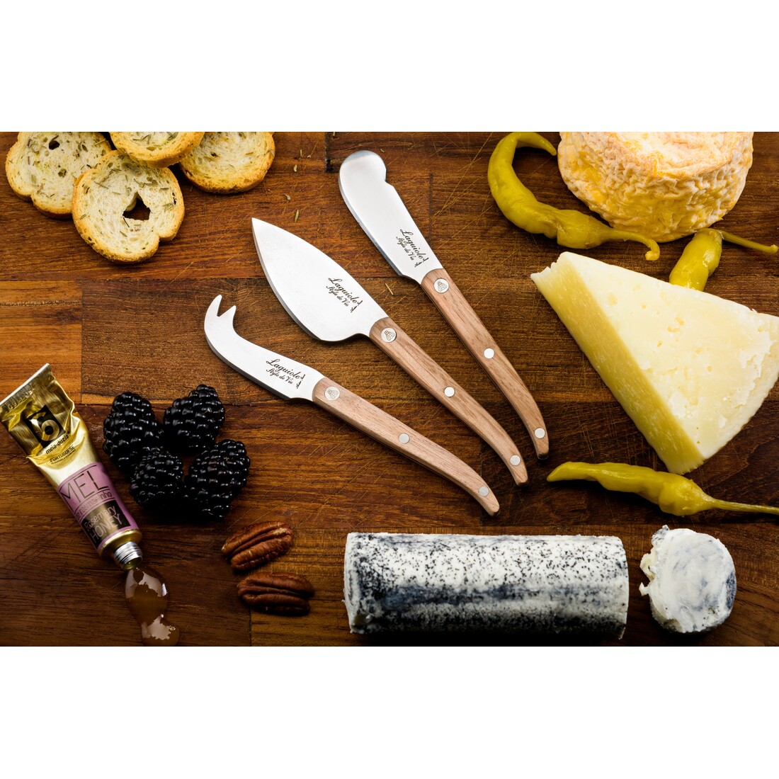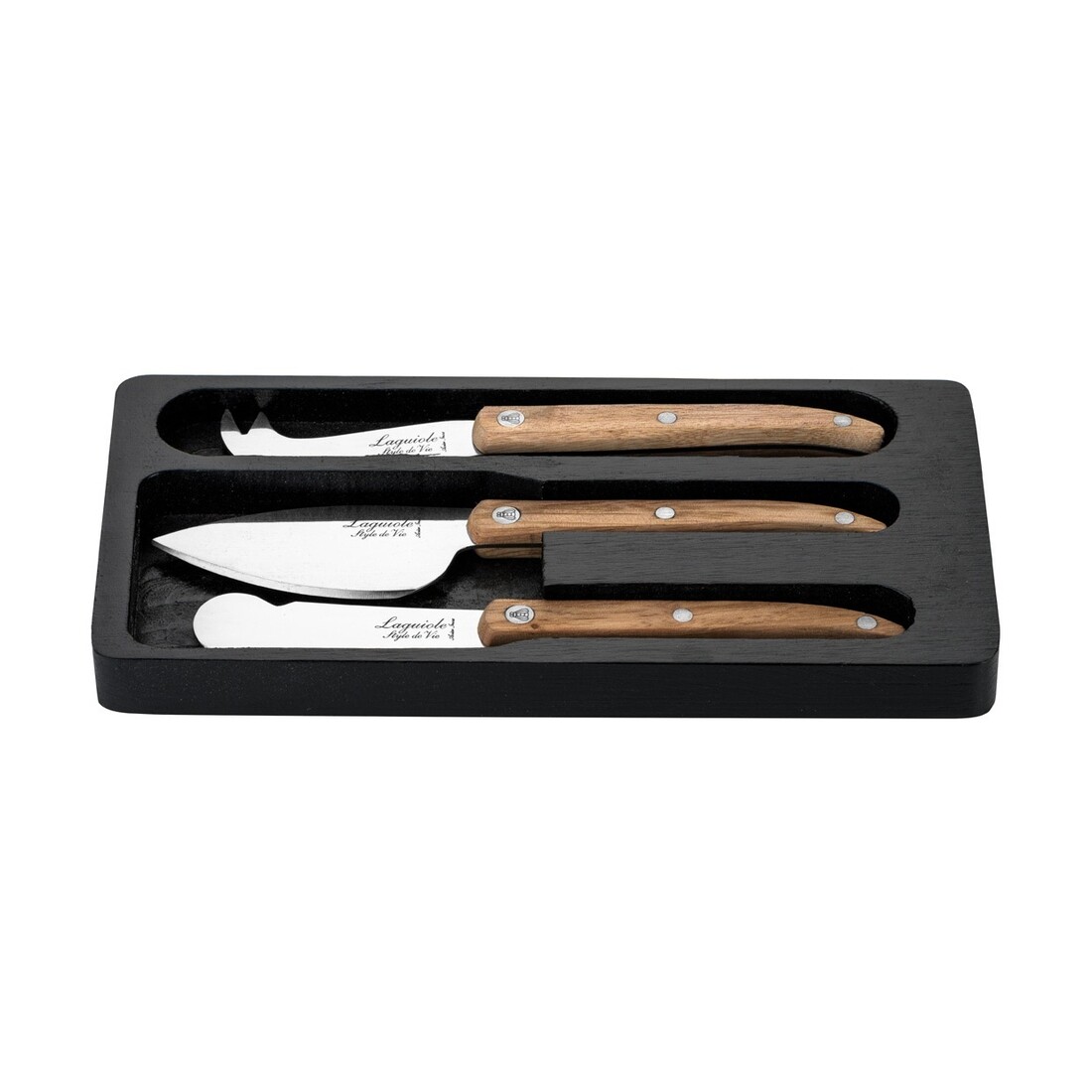 Laguiole Style de Vie Innovation Line Kaasmessenset 3-delig Eikenhout. De 3 kaasmessen hebben een luxe eikenhouten handgreep. Het lemmet van de kaasmessen is gemaakt van RVS. Met deze messenset heeft u voor elke kaas een kaasmes in huis. Geschikt voor harde en zachte kazen. De kaasmessen zijn verpakt in een zwart houten tray.
