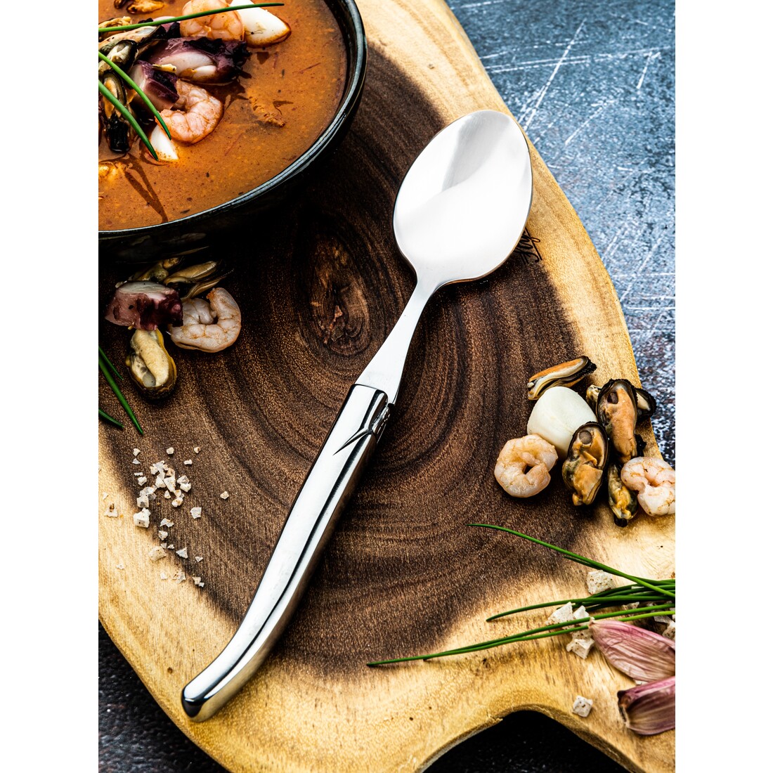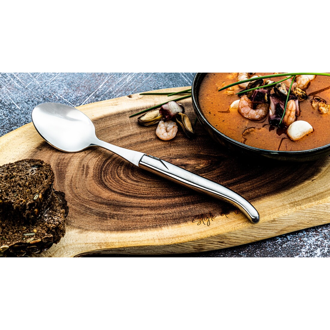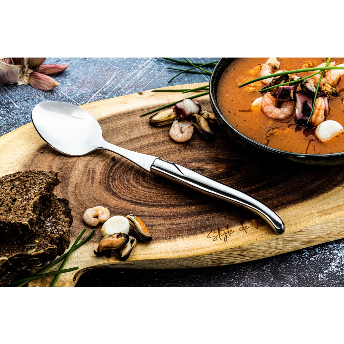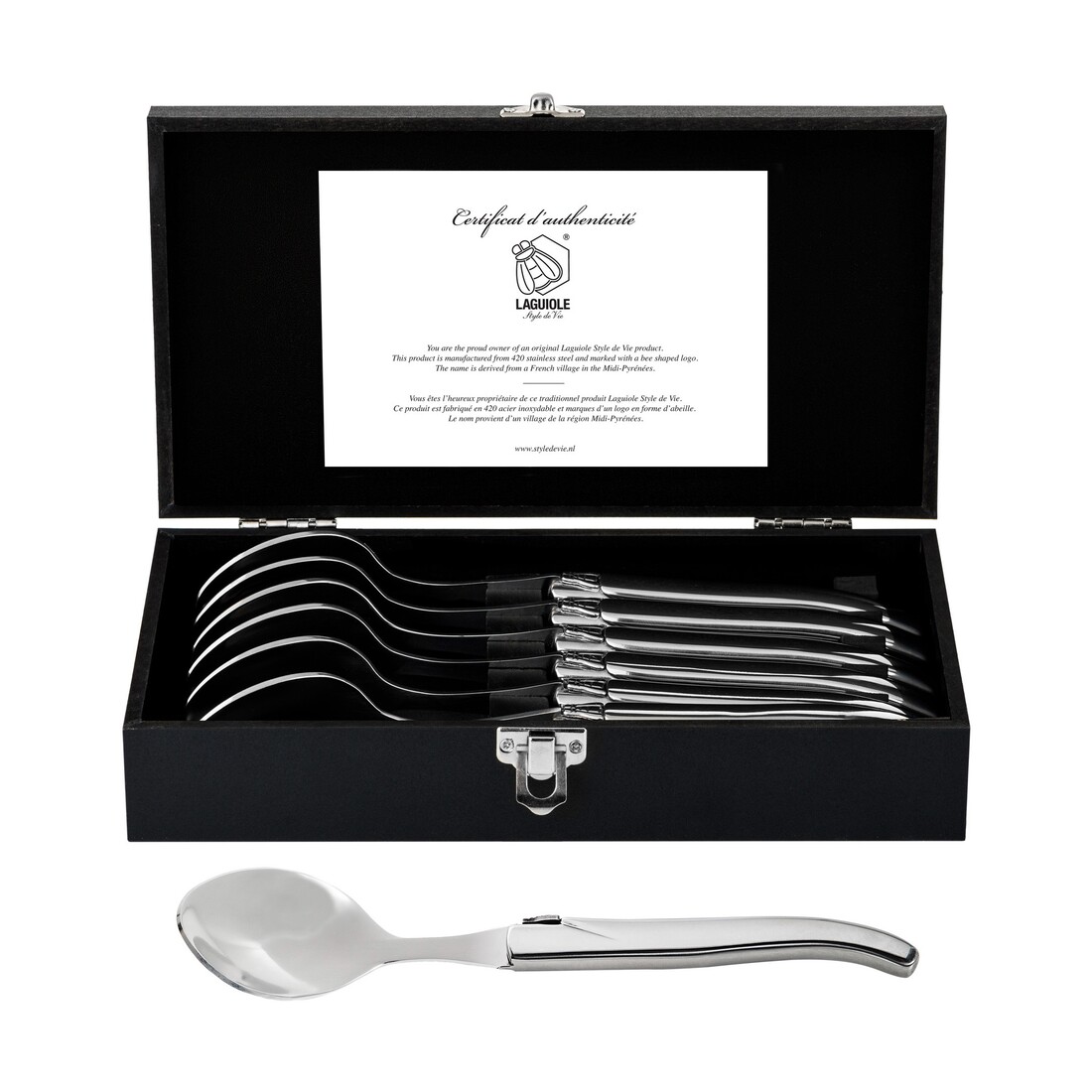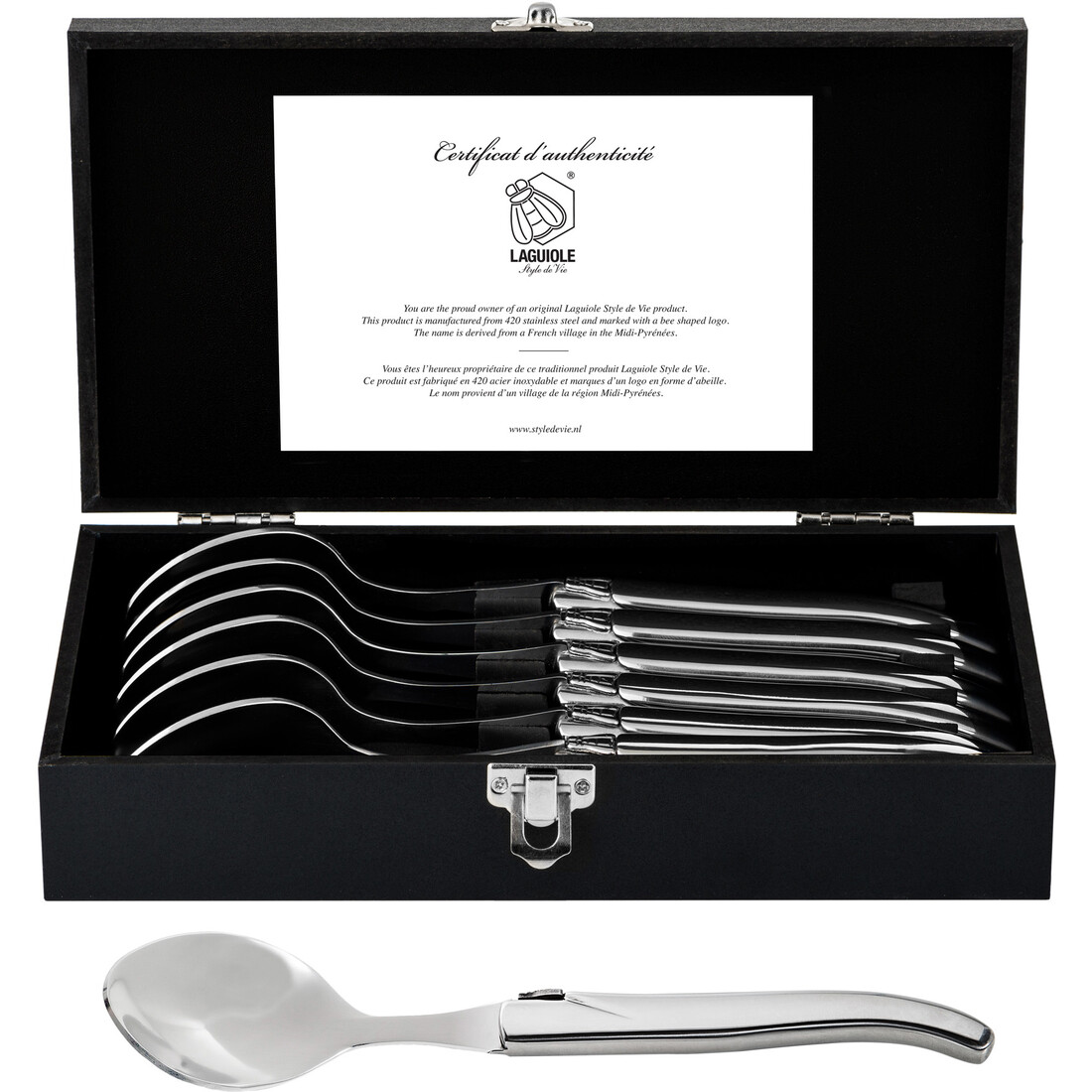 Deze Laguiole Style de Vie Luxury Line lepels zijn volledig gemaakt van roestvrij staal. De rug van de handgrepen zijn bovendien prachtig versierd. De lepels worden in een set van 6 geleverd, verpakt in een luxe houten geschenkverpakking.De vorken zijn 2,5mm dik.