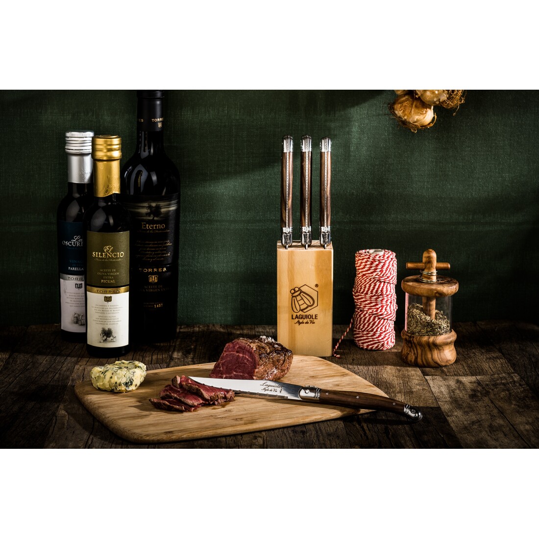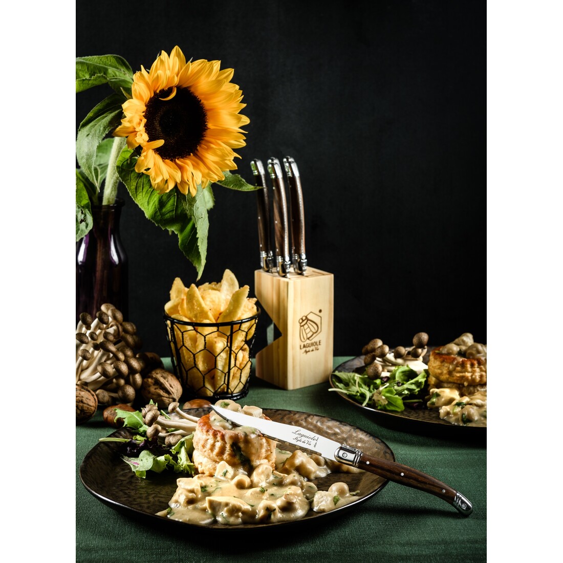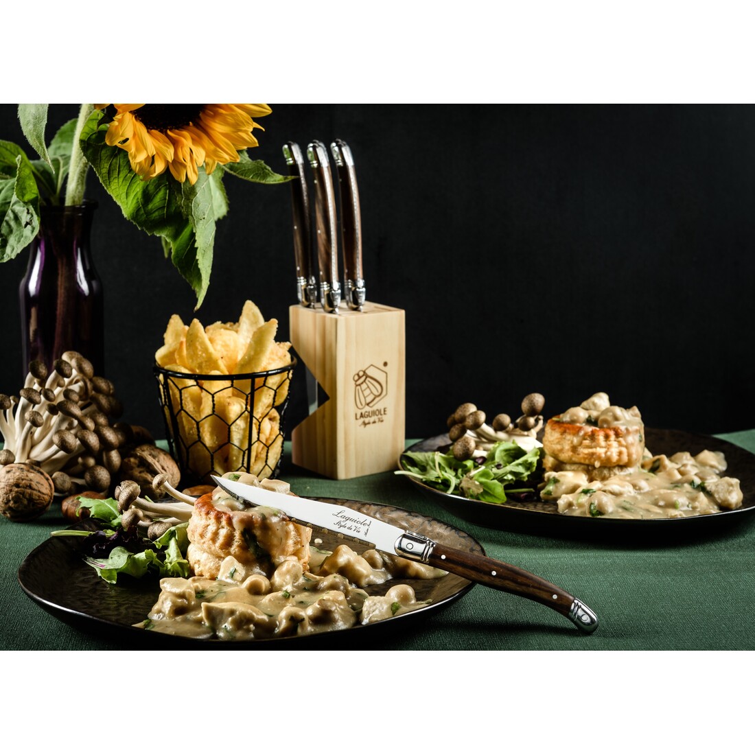 Set van 6 Laguiole Style de Vie steakmessen met kunststof handgrepen met hout print. Het lemmet heeft een gekartelde snede en is gemaakt van roestvrij staal (1,8mm dik). De steakmessen worden geleverd in een leuk houten opbergblokje voorzien van Laguiole Style de Vie logo.