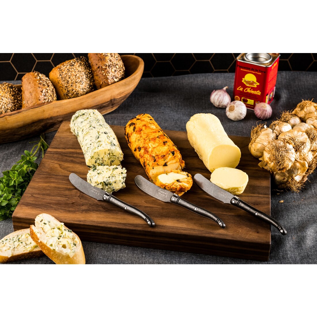 Deze set van 4 botermesjes uit de Laguiole Style de Premium Line hebben een totale lengte van 16cm. De messen zijn geheel gemaakt van roestvrij staal en hebben een zwarte 'stonewash' finish. Vaatwasmachine bestendig, hoewel met de hand reinigen wordt aanbevolen. Wordt geleverd in een houten tray.