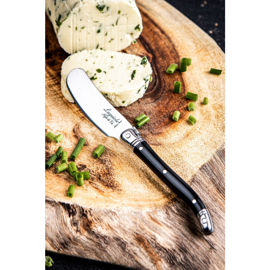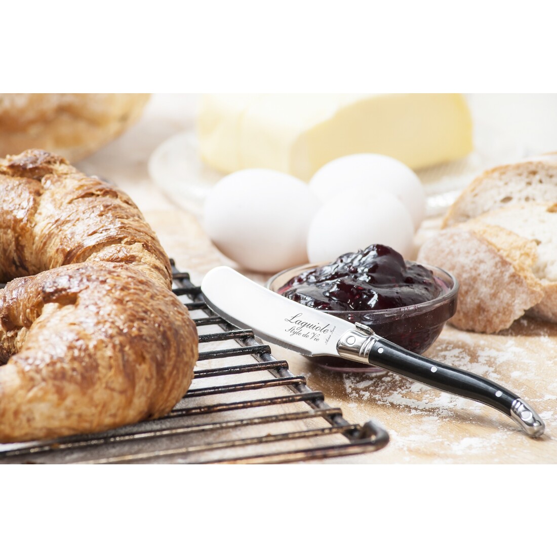 Deze set van 4 botermesjes uit de Laguiole Style de Premium Line hebben een totale lengte van 16cm. De messen zijn voorzien van een zwart handvat met het ingelegde bijtje van Laguiole Style de Vie. Vaatwasmachine bestendig, hoewel met de hand reinigen wordt aanbevolen. Wordt geleverd in een houten tray.