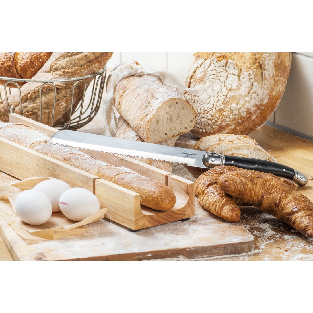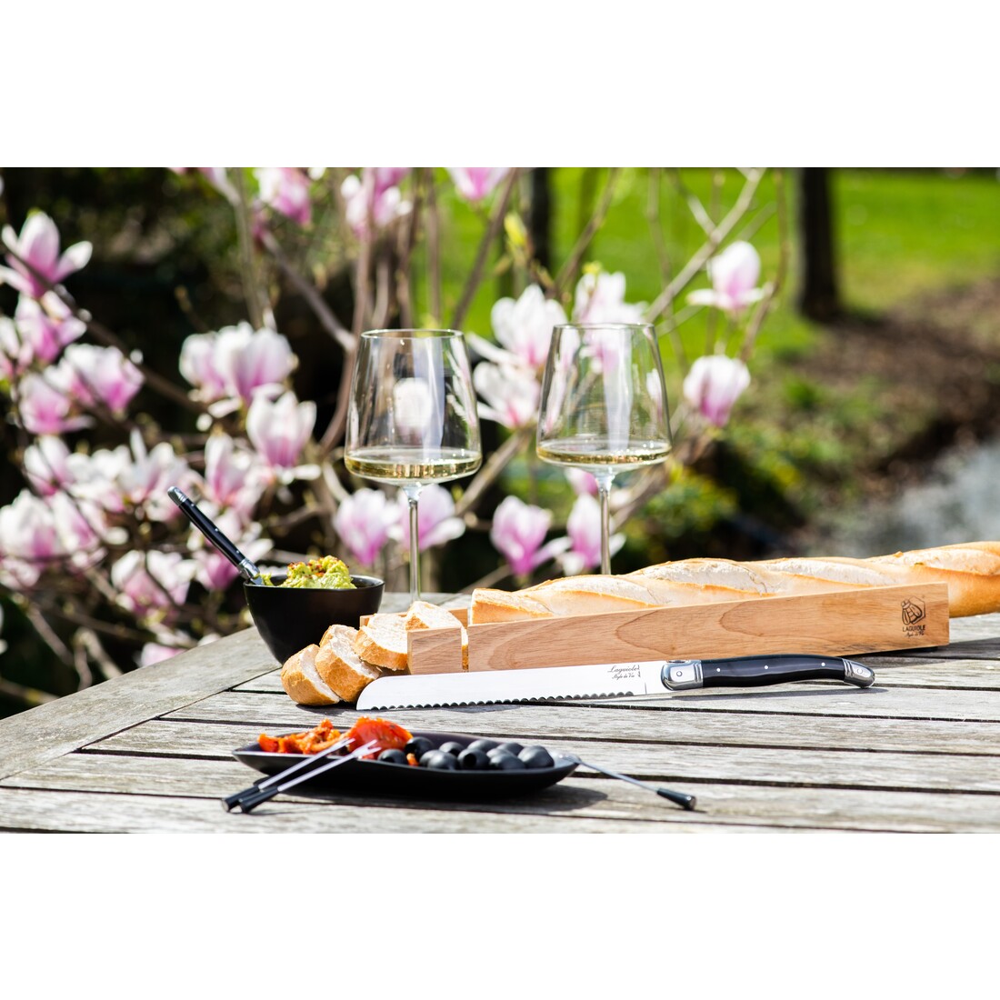 De Laguiole Style de Vie broodmes zwart wordt geleverd met stokbroodplank. Hierin kan je heel gemakkelijk uw stokbrood in stukjes snijden. Het lemmet van het broodmes is gemaakt van RVS en het zwartkleurig handvat van kunststof. De stokbroodplank is voorzien van het logo van Laguiole Style de Vie. Het broodmes is niet alleen om stokbrood mee te snijden. Je kan er ook vele andere broden mee snijden.