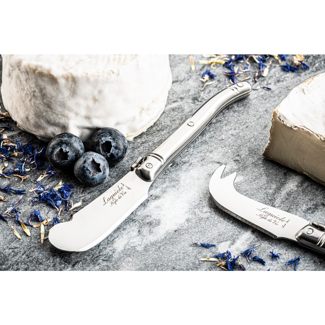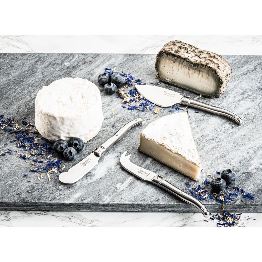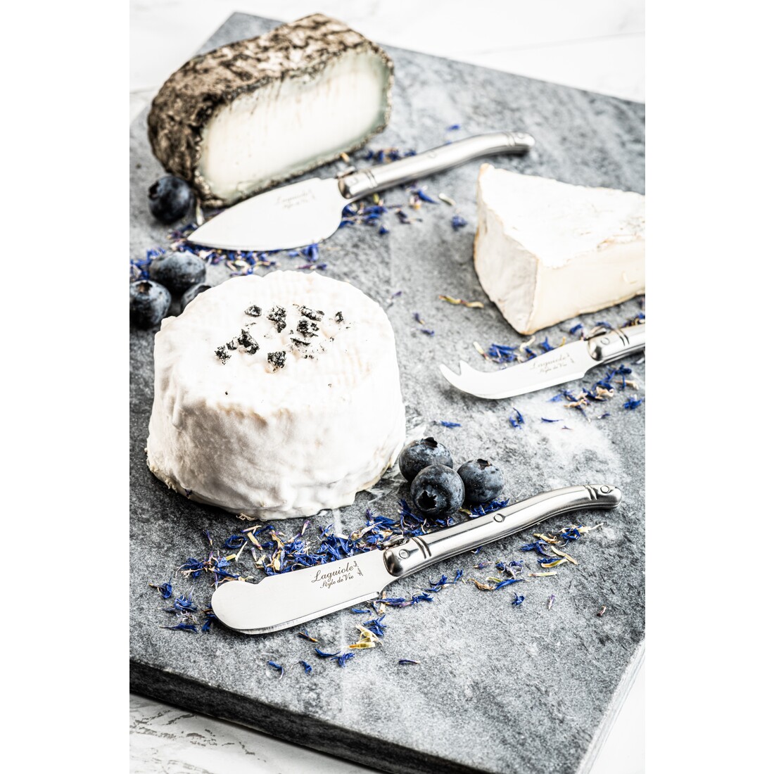Set van 3 Laguiole Style de Vie Premium Line kaasmesjes. De kaasmessen zijn geheel gemaakt van roestvrij staal. De kaasmesjes kunnen in de vaatwasser, hoewel met de hand reinigen wordt aanbevolen. Wordt geleverd in een houten tray.