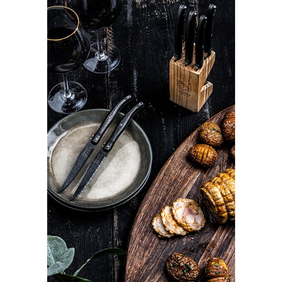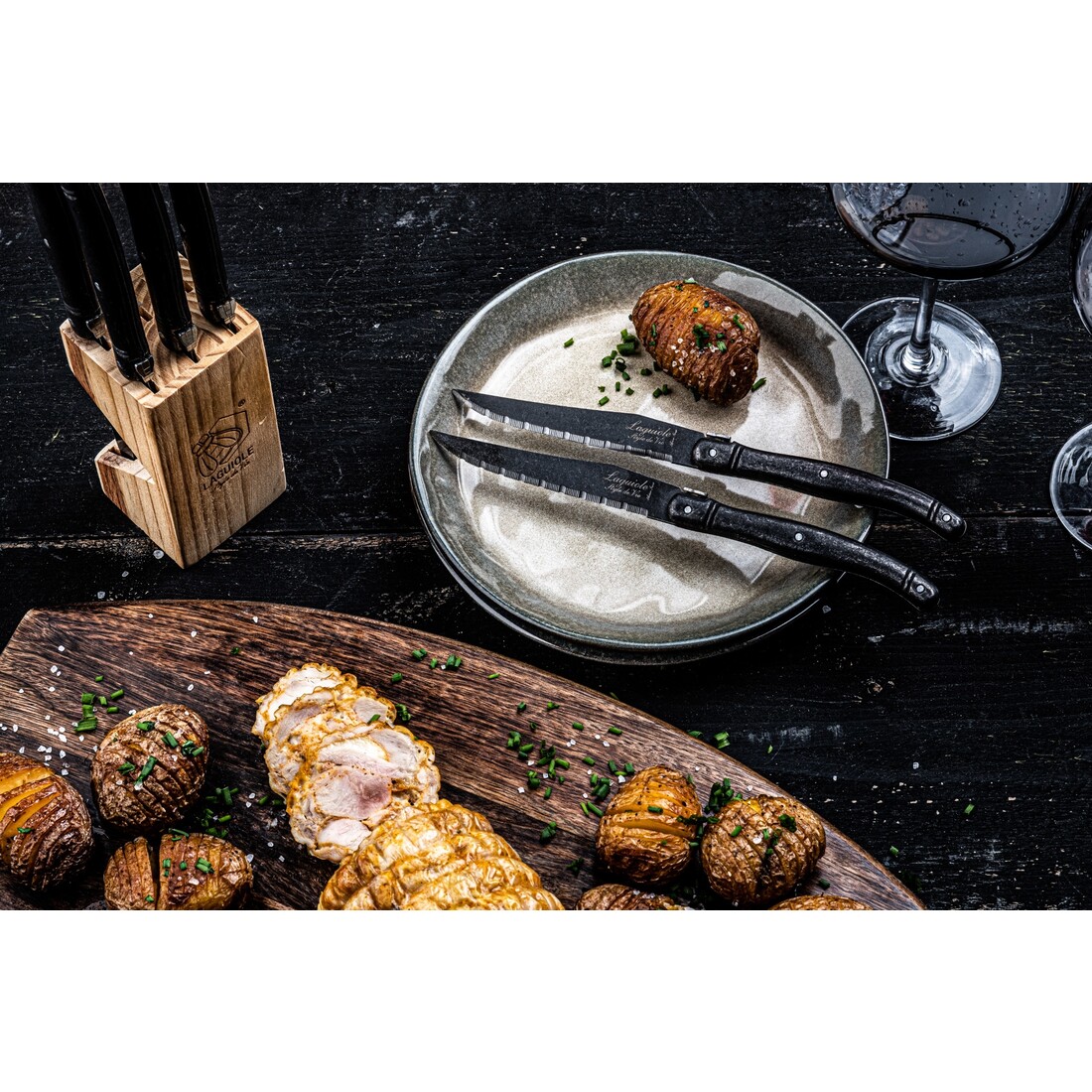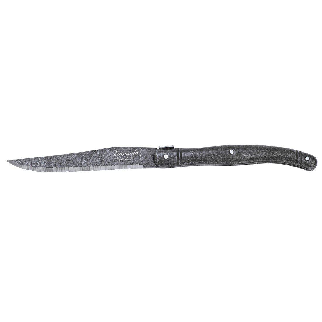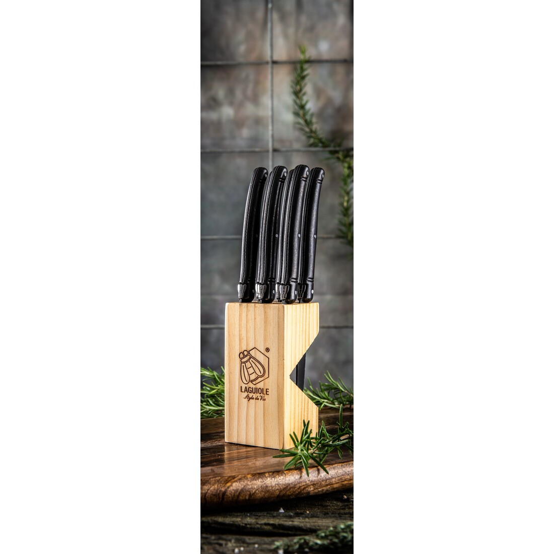Set van 6 Laguiole Style de Vie steakmessen met zwarte stonewash handgrepen. Het lemmet heeft een gekartelde snede en is gemaakt van roestvrij staal (1,8mm dik). De steakmessen worden geleverd in een leuk houten opbergblokje voorzien van Laguiole Style de Vie logo.