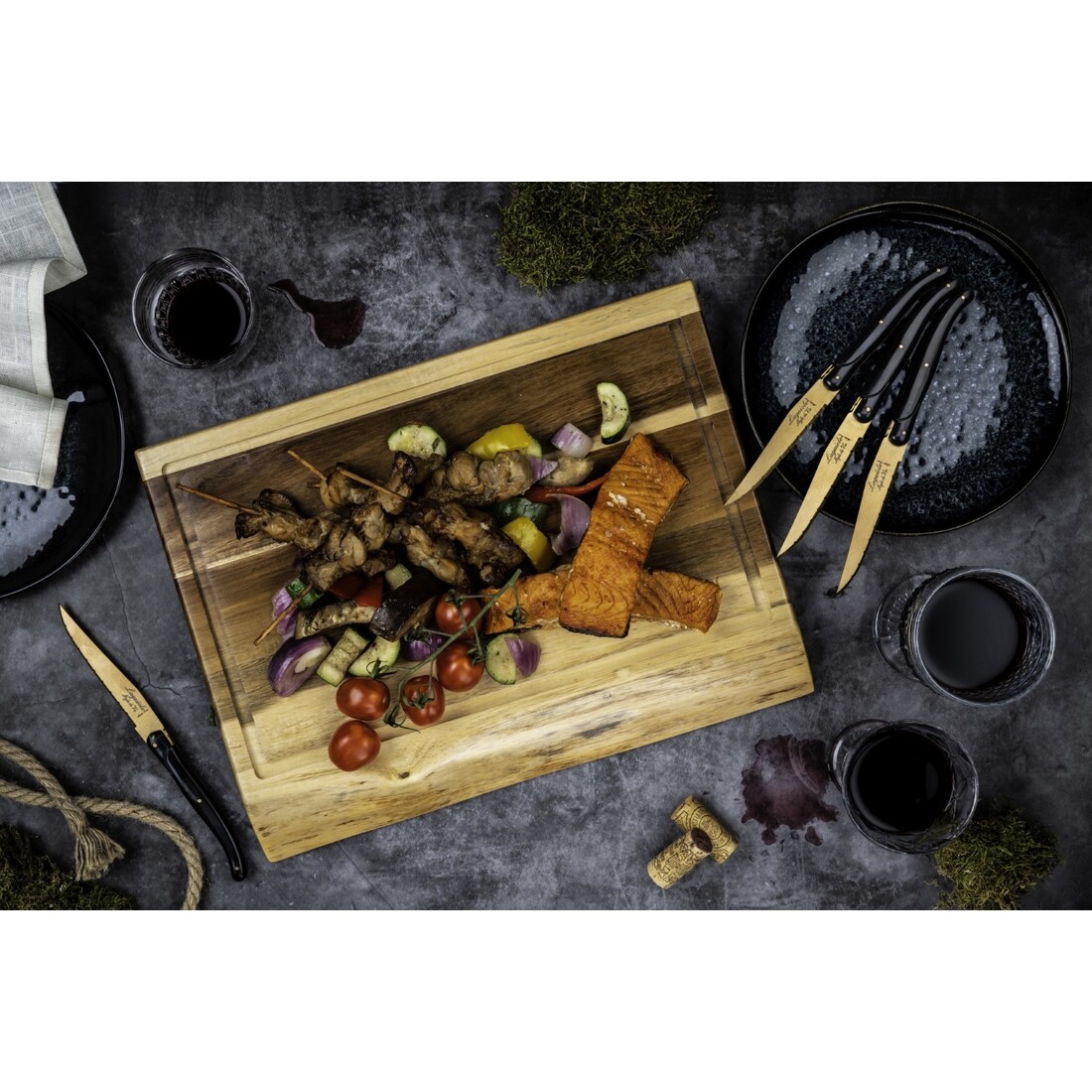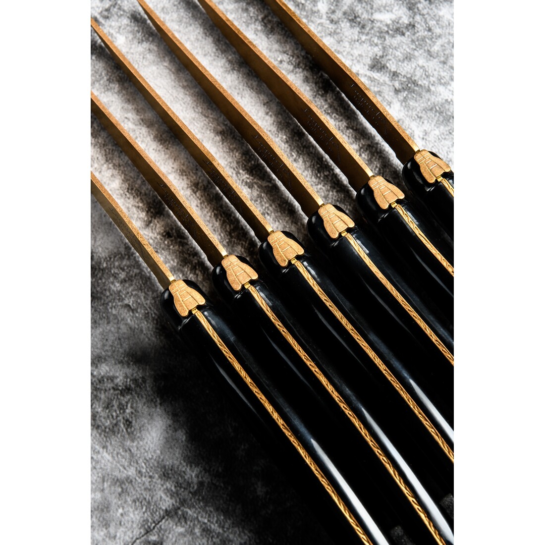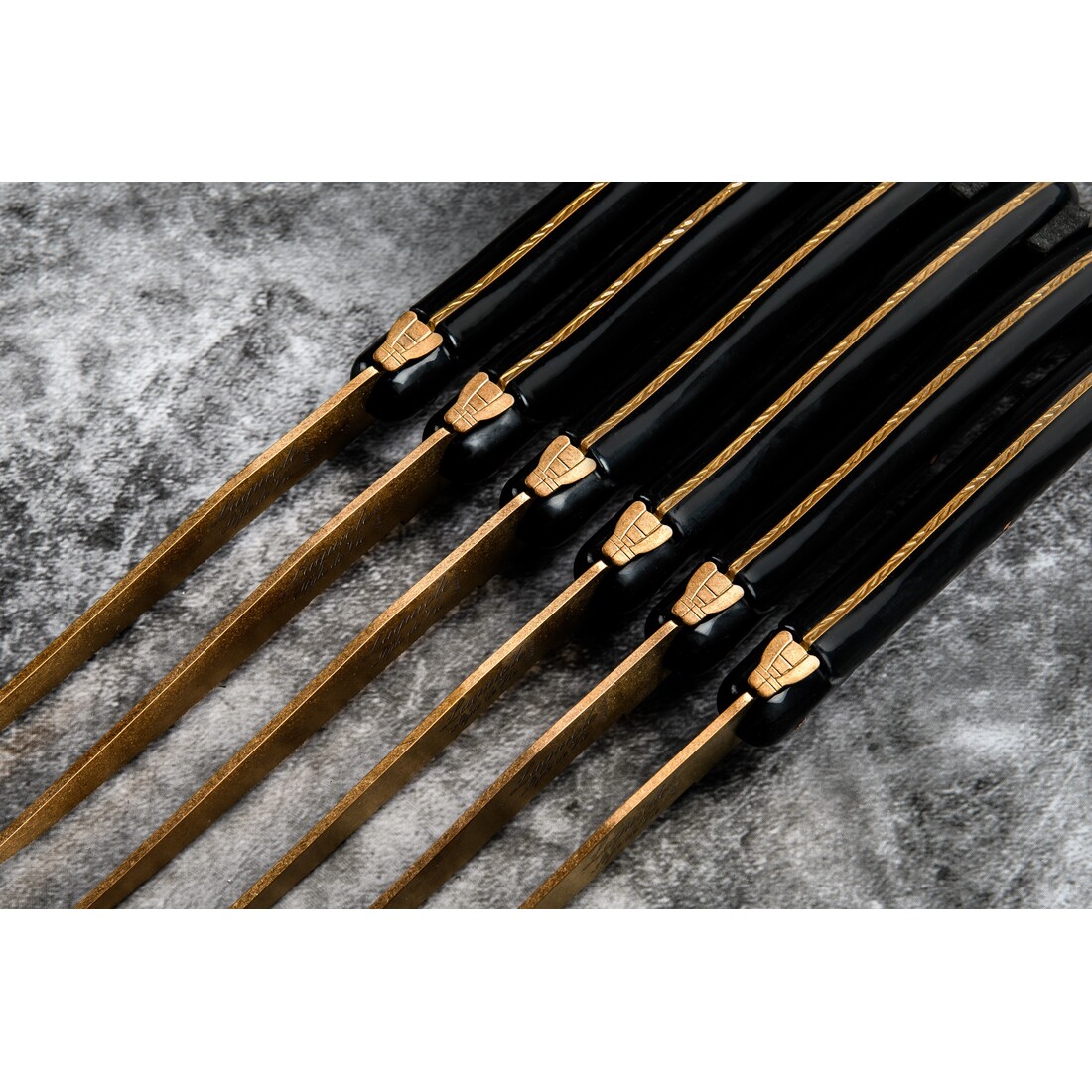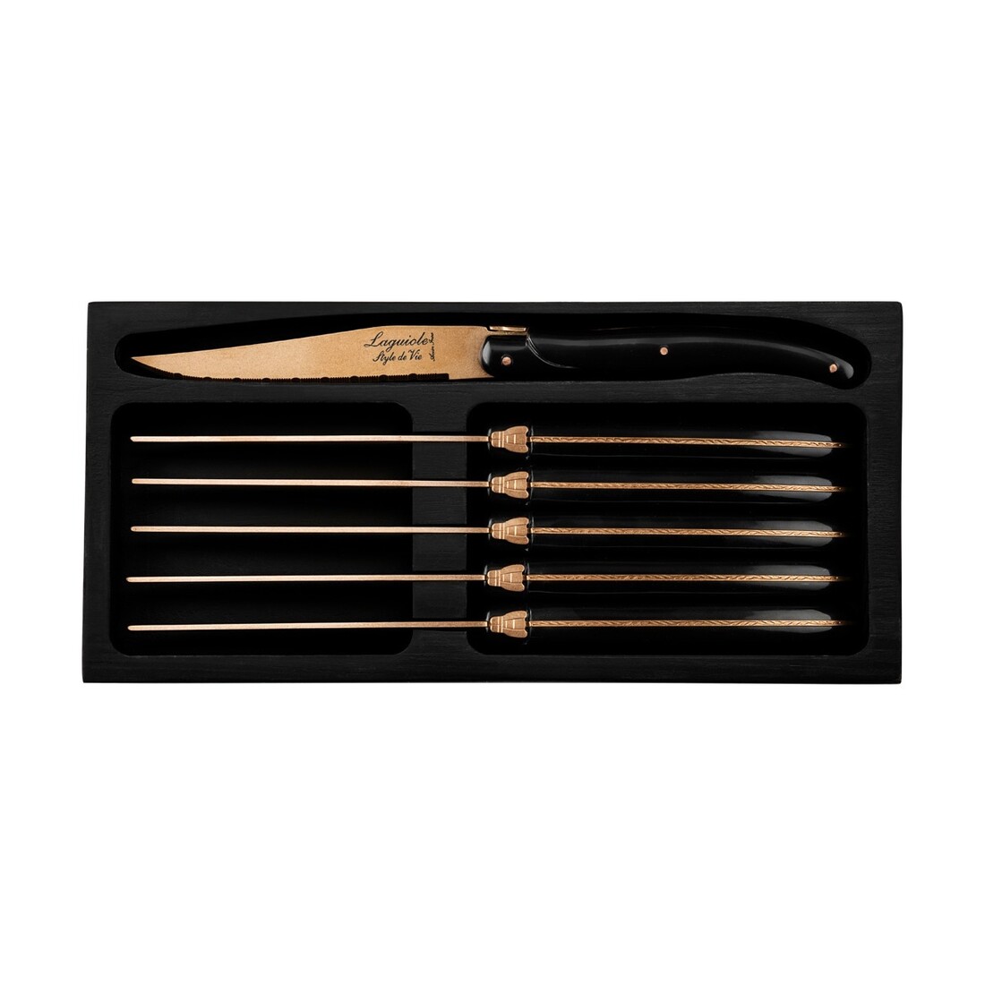 Deze set van 6 steakmessen uit de Laguiole Style de Vie Prestige Line hebben een koperen lemmet. De steakmessen zijn voorzien van een 1,8mm gekartelde snede en is gemaakt van roestvrij staal. Het handvat is van stonewash ABS. De 6 steakmessen worden verpakt in een zwart houten tray. Door het gekartelde lemmet zijn de messen multi inzetbaar, voor zowel een BBQ als een overheerlijke maaltijd.