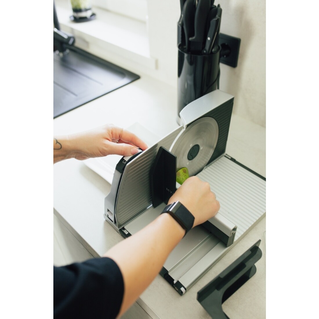 Een ander praktisch aspect van de MYtiny is het slimme kabelcompartiment waarmee het snoer op de gewenste lengte kan worden ingesteld of volledig kan worden opgeborgen. Hierdoor blijft het apparaat overzichtelijk en veilig in gebruik. De compacte vormgeving in combinatie met de hoogwaardige materialen maakt de Graef MYtiny tot een ideale keuze voor wie ruimte wil besparen zonder concessies te doen aan snijprestaties en veiligheid.