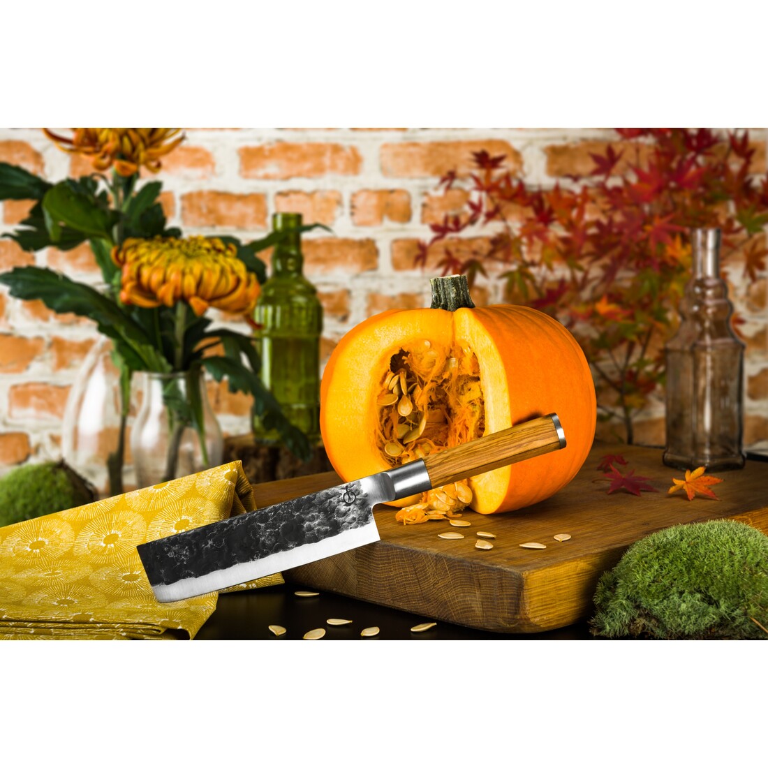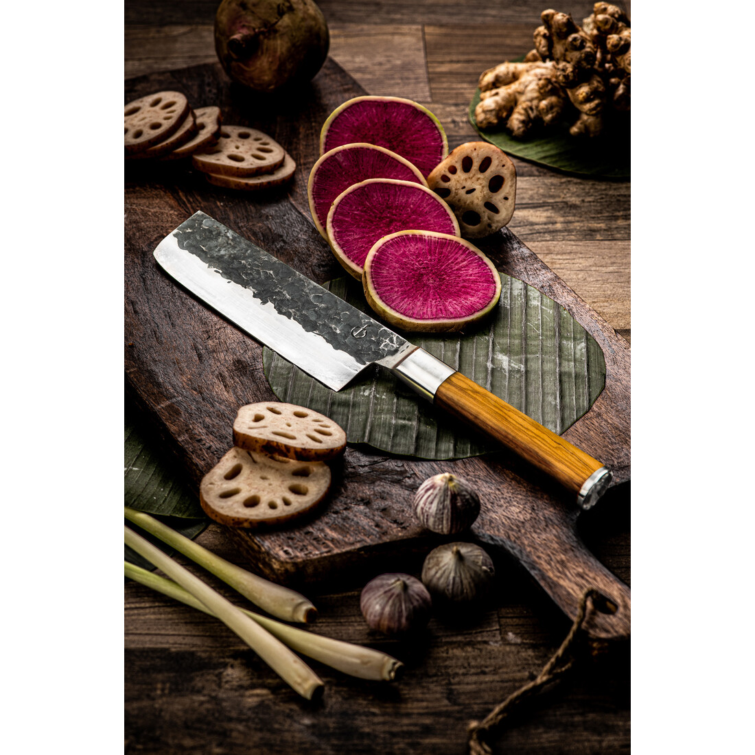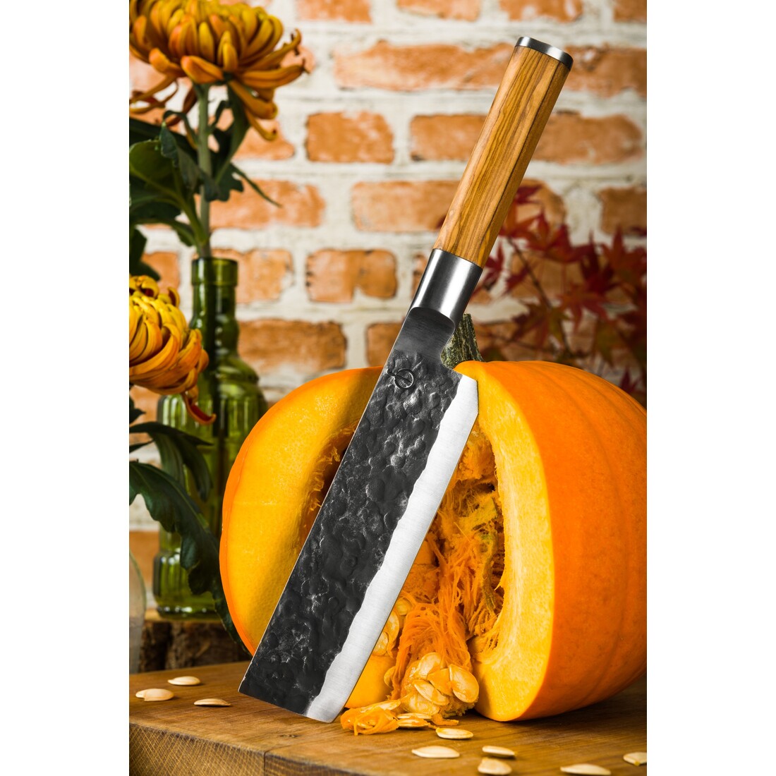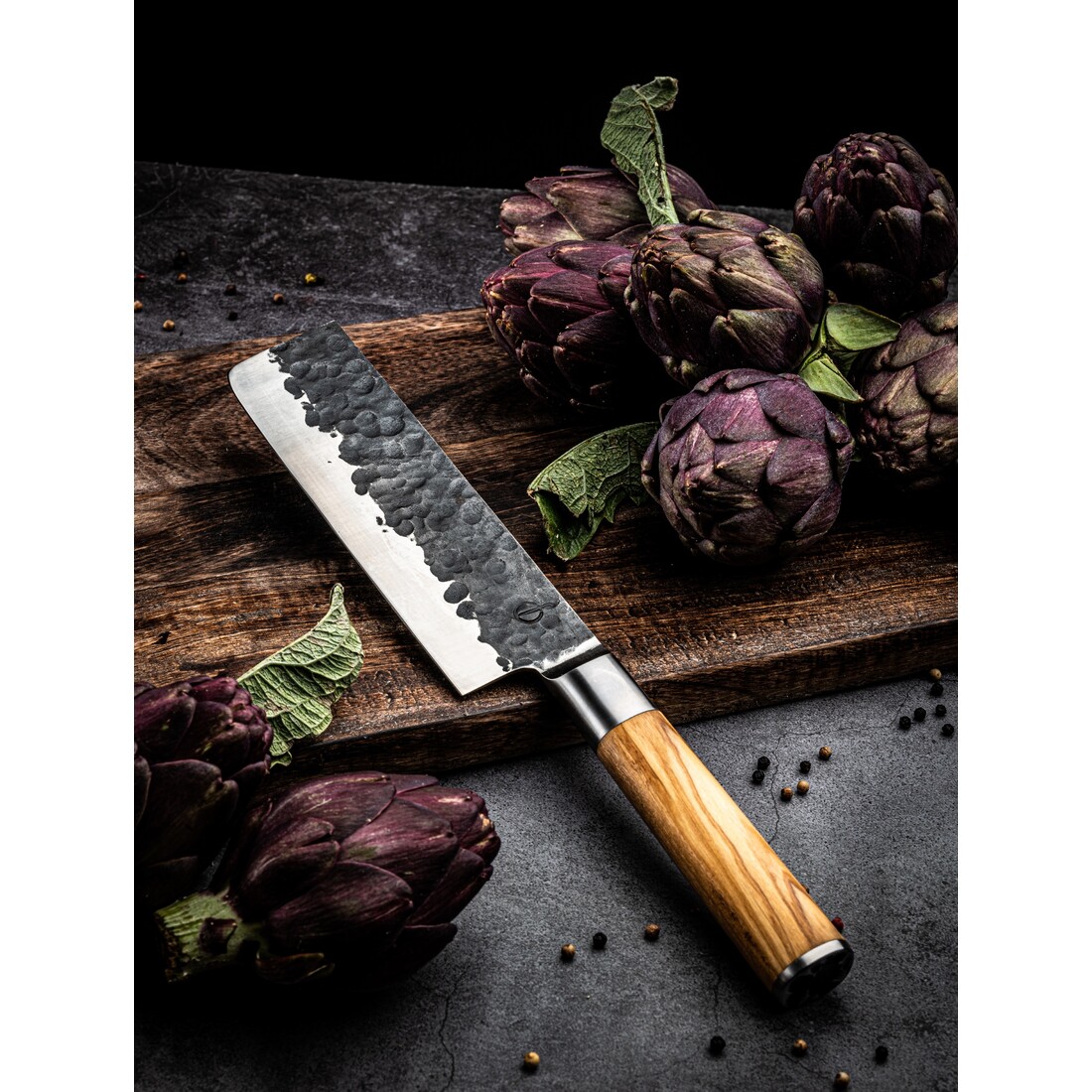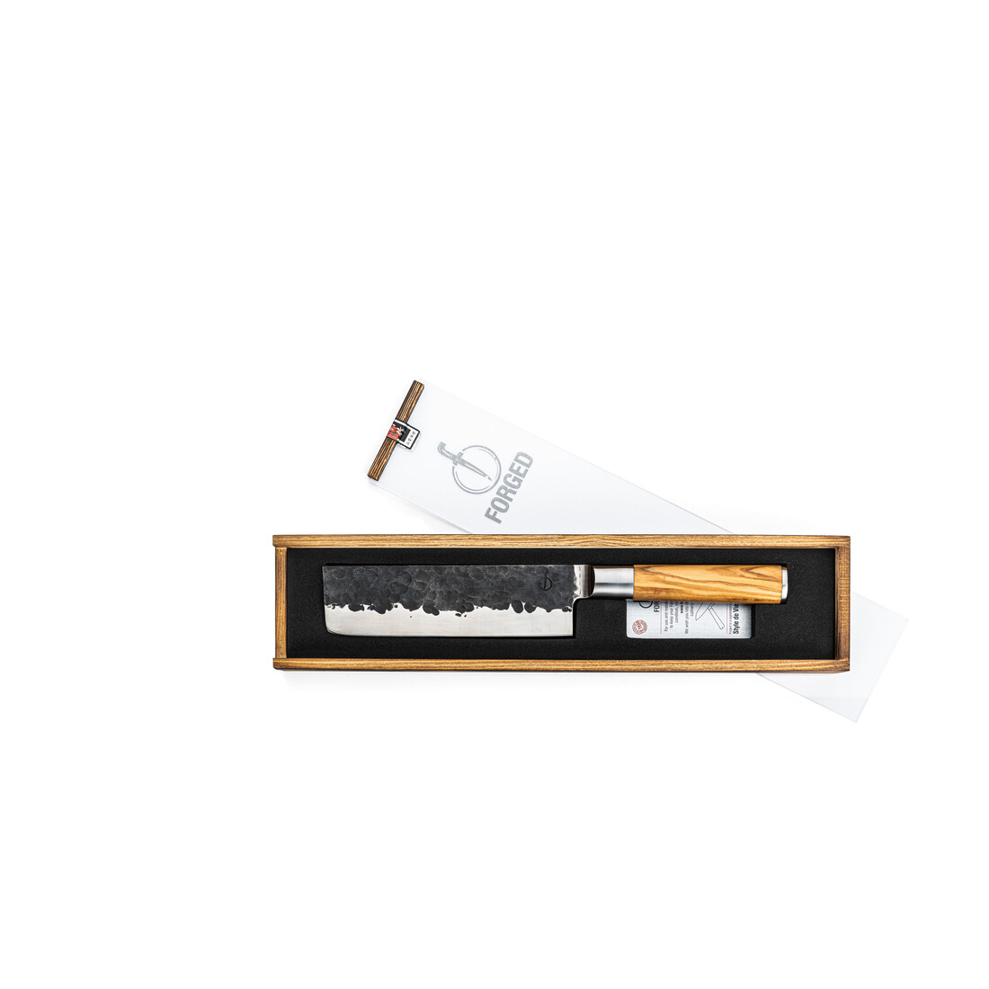 Het Forged Olive hakmes, ook wel Nakiri genoemd, is een Japans groentemes. Het mes is gemaakt voor het fijnsnijden en hakken van groenten en kruiden. De handgreep van olijfhout is extra opvallend door de doorlopende krop en de toegevoegde pommel op de achterzijde. De pommel is bovendien afgewerkt in dezelfde stijl als het lemmet, waardoor alles één geheel wordt.