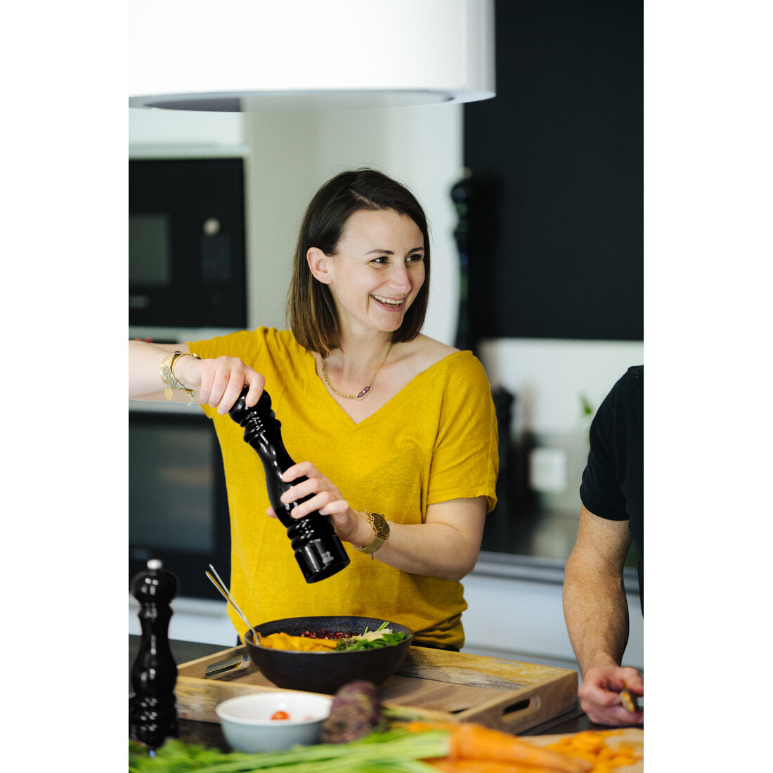 De Peugeot Paris u'Select zoutmolen in een chique zwarte kleur is perfect voor iedere (hobby)kok. Met het u'Select-systeem stel je de maalgraad gemakkelijk en professioneel in, waardoor je altijd de perfecte smaak kiest voor jouw gerecht. Je stelt dit in door onderaan de molen te draaien. De slanke houten vorm ligt prettig in de hand en is daarom fijn in gebruik. De zoutmolen heeft een afmeting van 30 cm en is stijlvol afgewerkt met een zilverkleurige knop met het kenmerkende logo van Peugeot daarop. Het is een veelzijdige molen voor gebruik in de keuken en op tafel.