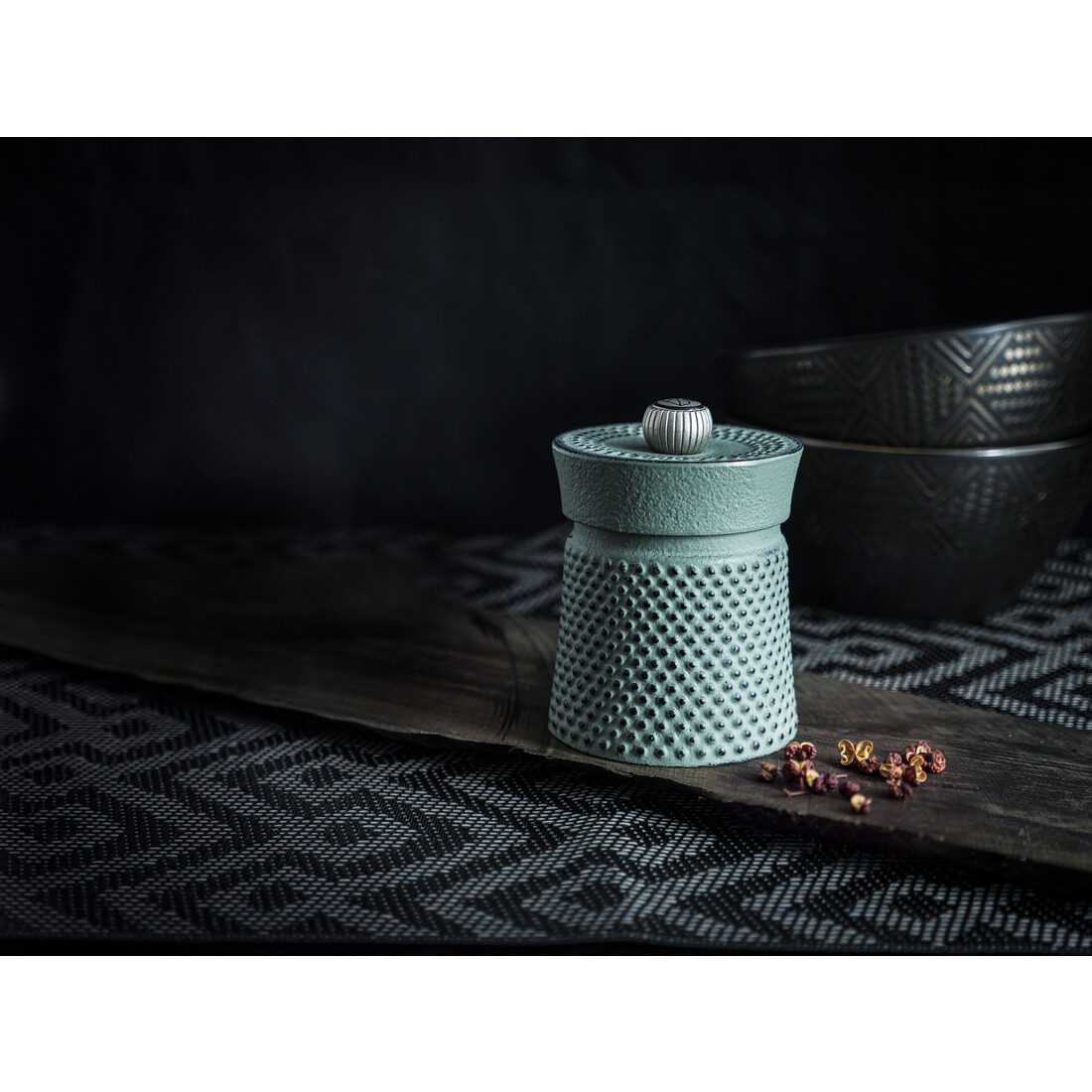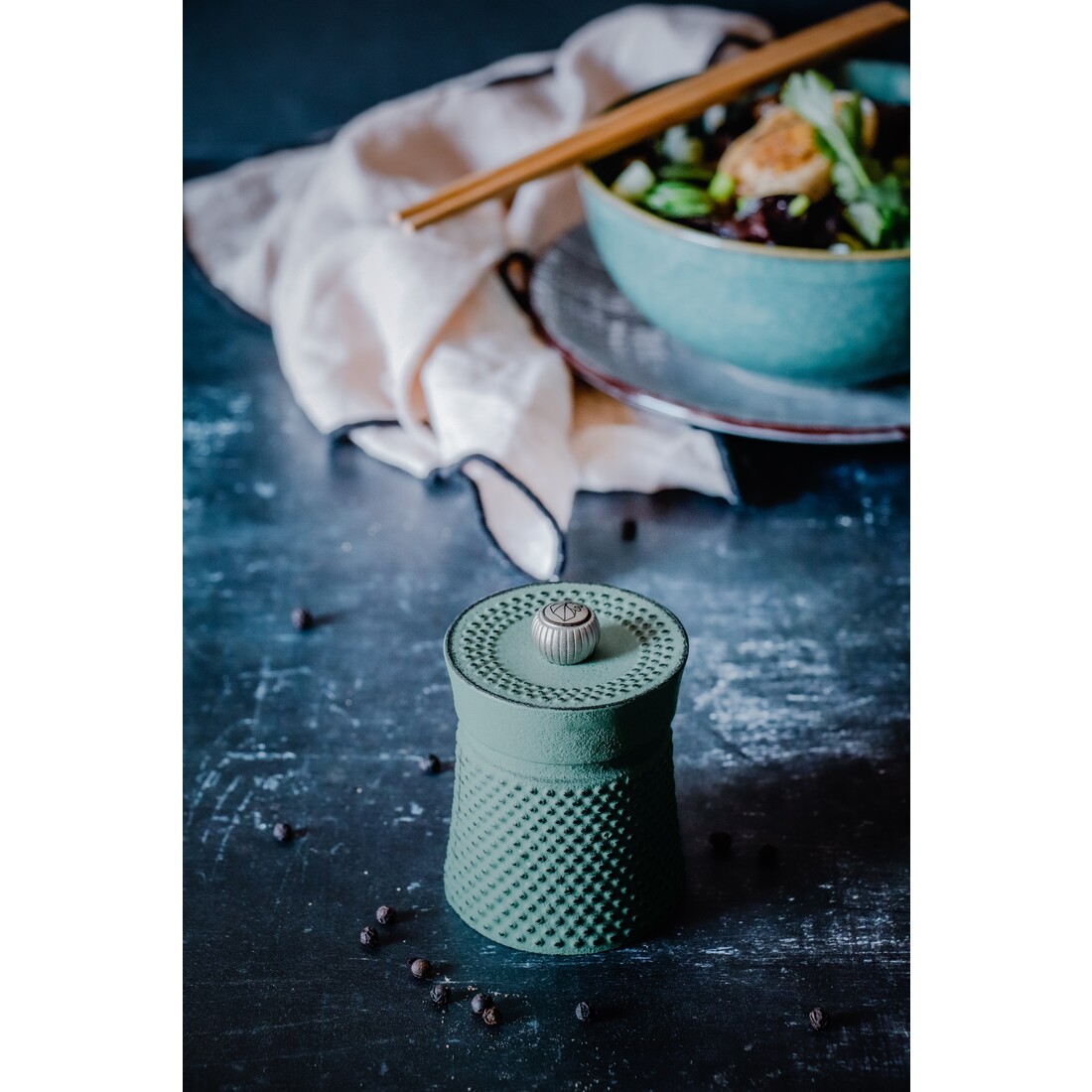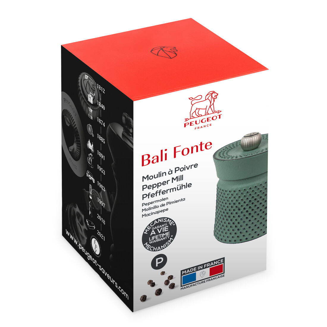 De Peugeot Bali manuele pepermolen is een compacte smaakmaker in de keuken. De serie brengt een eerbetoon aan één van de belangrijkste peperculturen te wereld: Indonesië. Pepermolen Bali Fonte heeft een afmeting van 8 cm en is gemaakt van groen gietijzer, met zilverkleurige knop aan de bovenzijde.