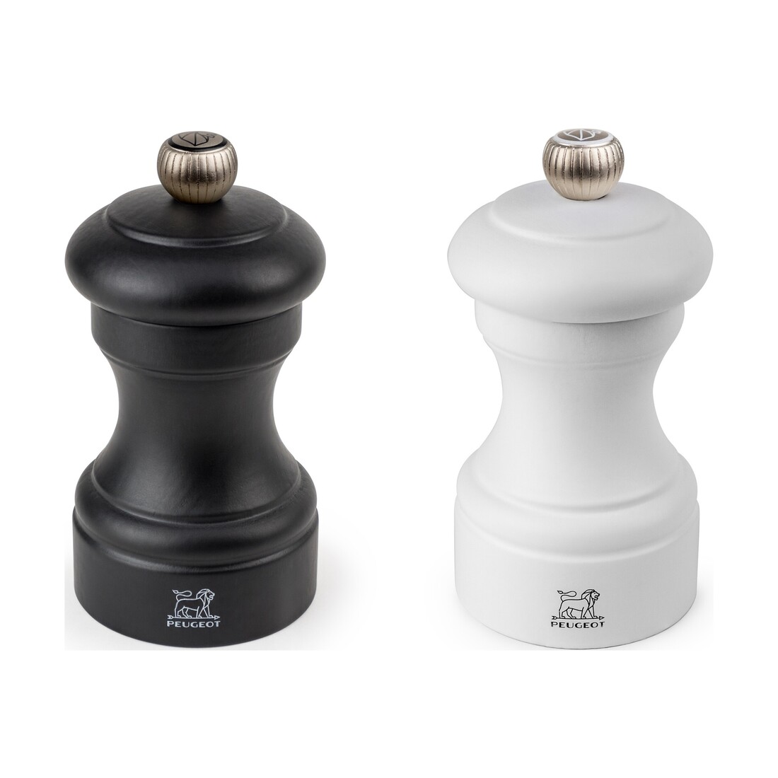 De peper- en zoutmolen set uit de Bistro serie van Peugeot bestaat uit twee kwalitatieve molens met een klassiek design. De compacte peper- en zoutmolen zijn 10 cm hoog en is worden geleverd in de kleurencombinatie mat zwart/mat wit. Je stelt het klassieke maalwerk van de molens gemakkelijk met de hand in. De beukenhouten molens hebben een stijlvolle en moderne uitstraling, waardoor je ze tijdens ieder etentje als tafelaankleding kan neerzetten. Je kan de molens gelijk in gebruik nemen, omdat deze gevuld met peper- of zoutkorrels worden geleverd. Handig! Ga voor de hoge kwaliteit van dit klassieke Franse merk en geef ieder gerecht de smaak die het verdient met de Peugeot Bistro peper- en zoutmolens.