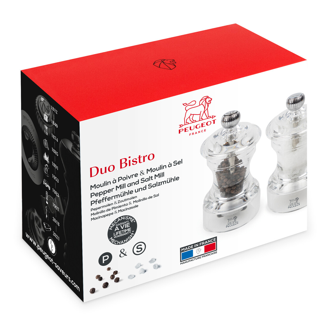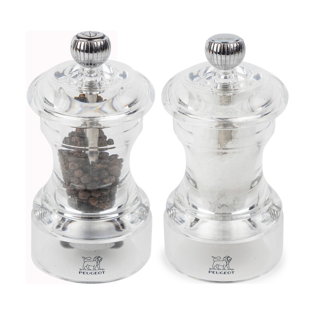 De peper- en zoutmolen set uit de Bistro serie van Peugeot bestaat uit twee kwalitatieve molens met een klassiek design. De compacte peper- en zoutmolen zijn 10 cm hoog en is worden geleverd in een transparante. Je stelt het klassieke maalwerk van de molens gemakkelijk met de hand in. De acryl molens hebben een stijlvolle en moderne uitstraling, waardoor je ze tijdens ieder etentje als tafelaankleding kan neerzetten. Je kan de molens gelijk in gebruik nemen, omdat deze gevuld met peper- of zoutkorrels worden geleverd. Handig! Ga voor de hoge kwaliteit van dit klassieke Franse merk en geef ieder gerecht de smaak die het verdient met de Peugeot Bistro peper- en zoutmolens.