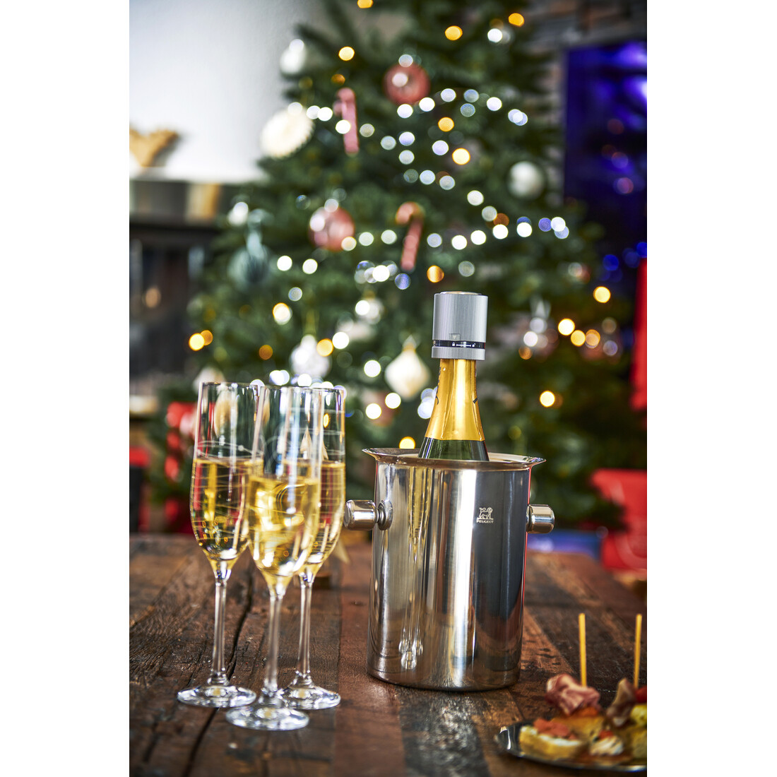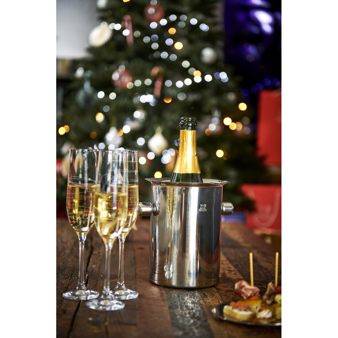 De Peugeot champagne emmer is gemaakt voor ieder binnen- of buitenfeestje. Dit is een onmisbaar accessoire voor iedere champagneliefhebber. De emmer is gemaakt van roestvrij staal en wordt geleverd met vier handige ijsblokjes om de fles champagne extra koel te houden. Geniet van de ultieme champagne beleving met de roestvrijstalen champagne emmer van Peugeot.Specificaties