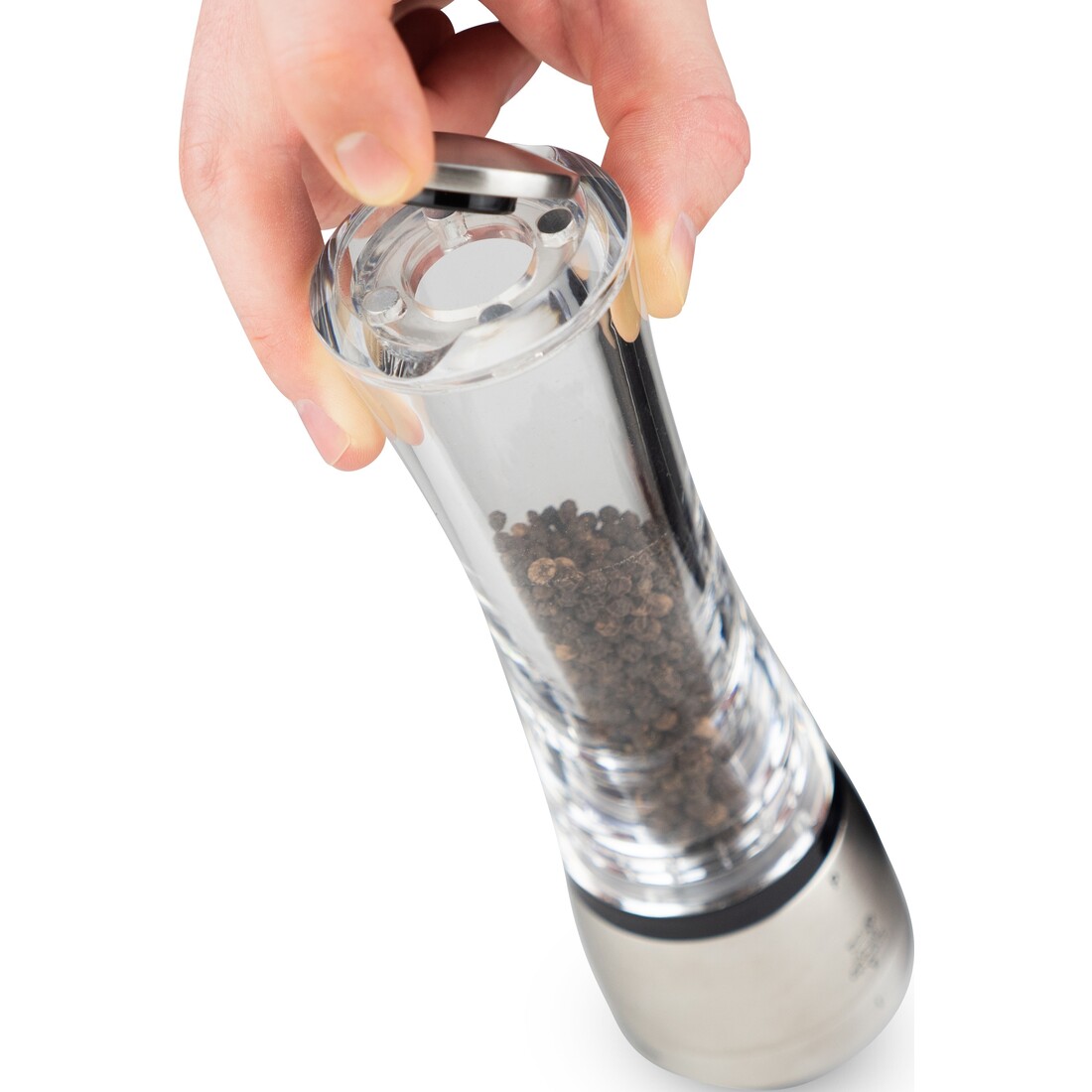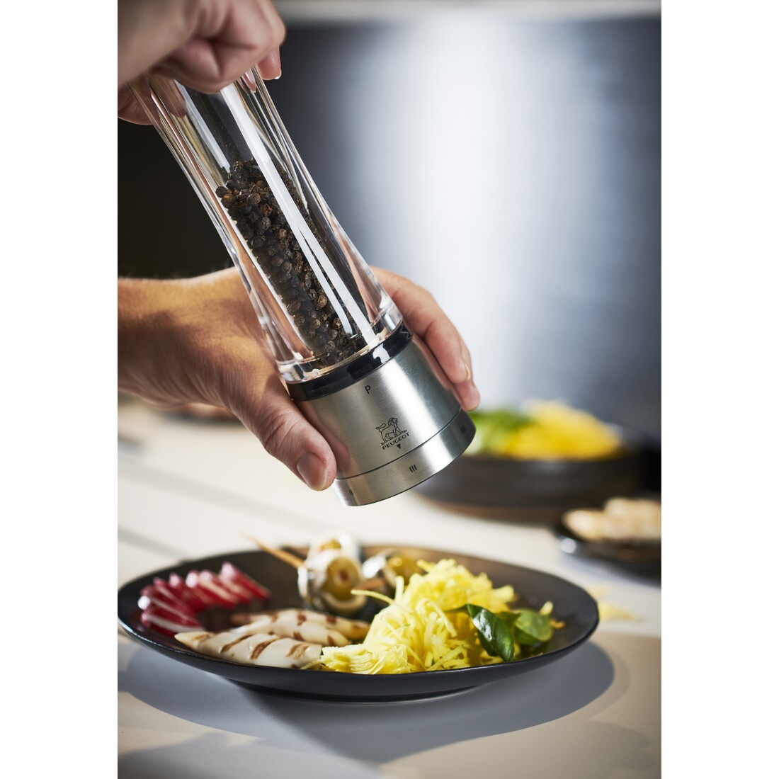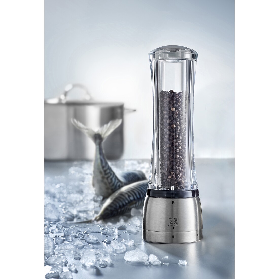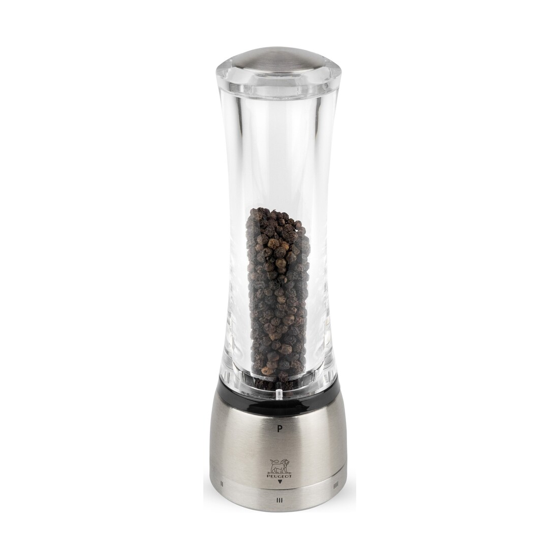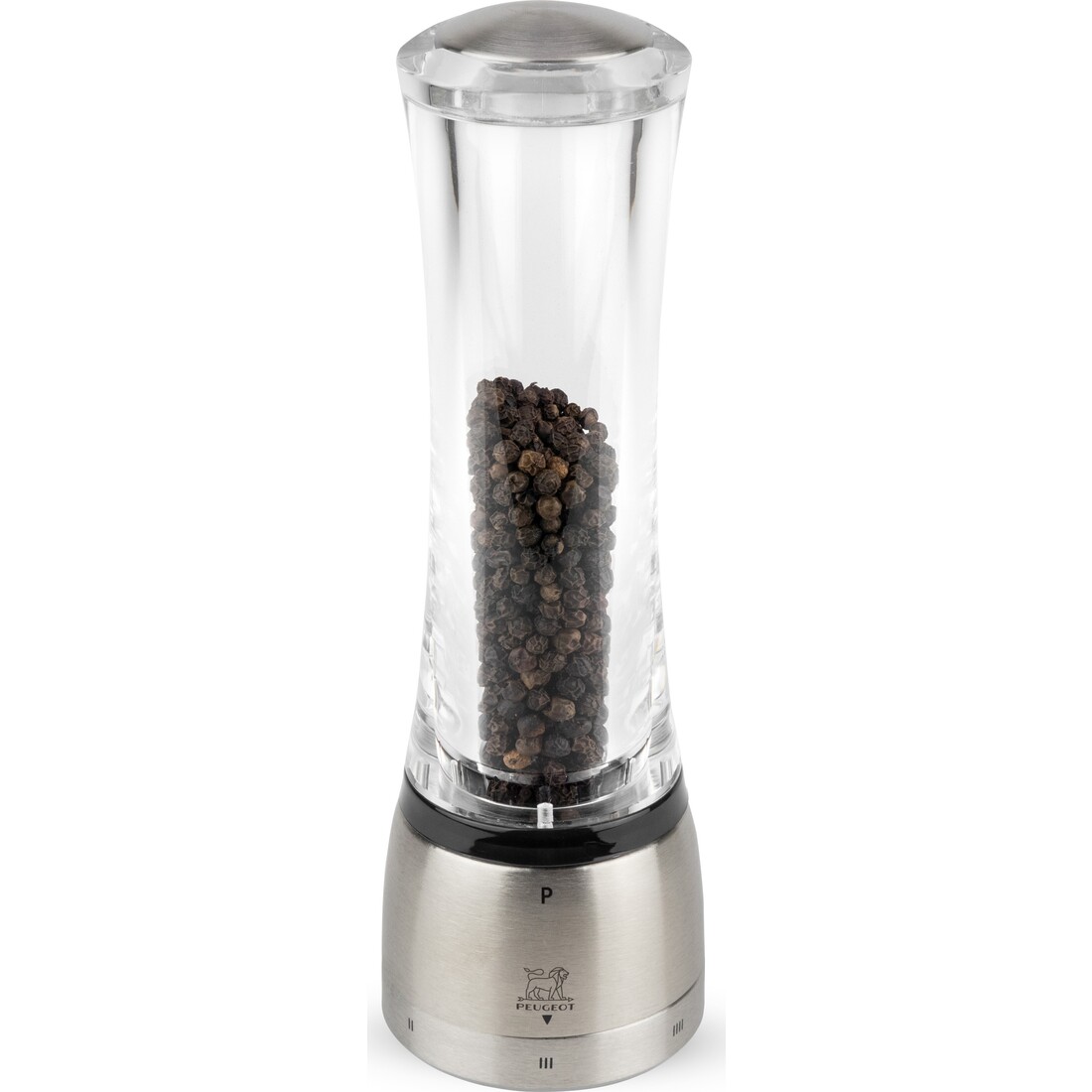 Laat jouw peperkorrels stralen in de transparante Peugeot Daman pepermolen. Een puur ontwerp van acryl en inox en een afmeting van 21 cm. Deze elegante pepermolen is voorzien van de handige u'Select functie met 6 instelbare selecties voor de maalgraad.