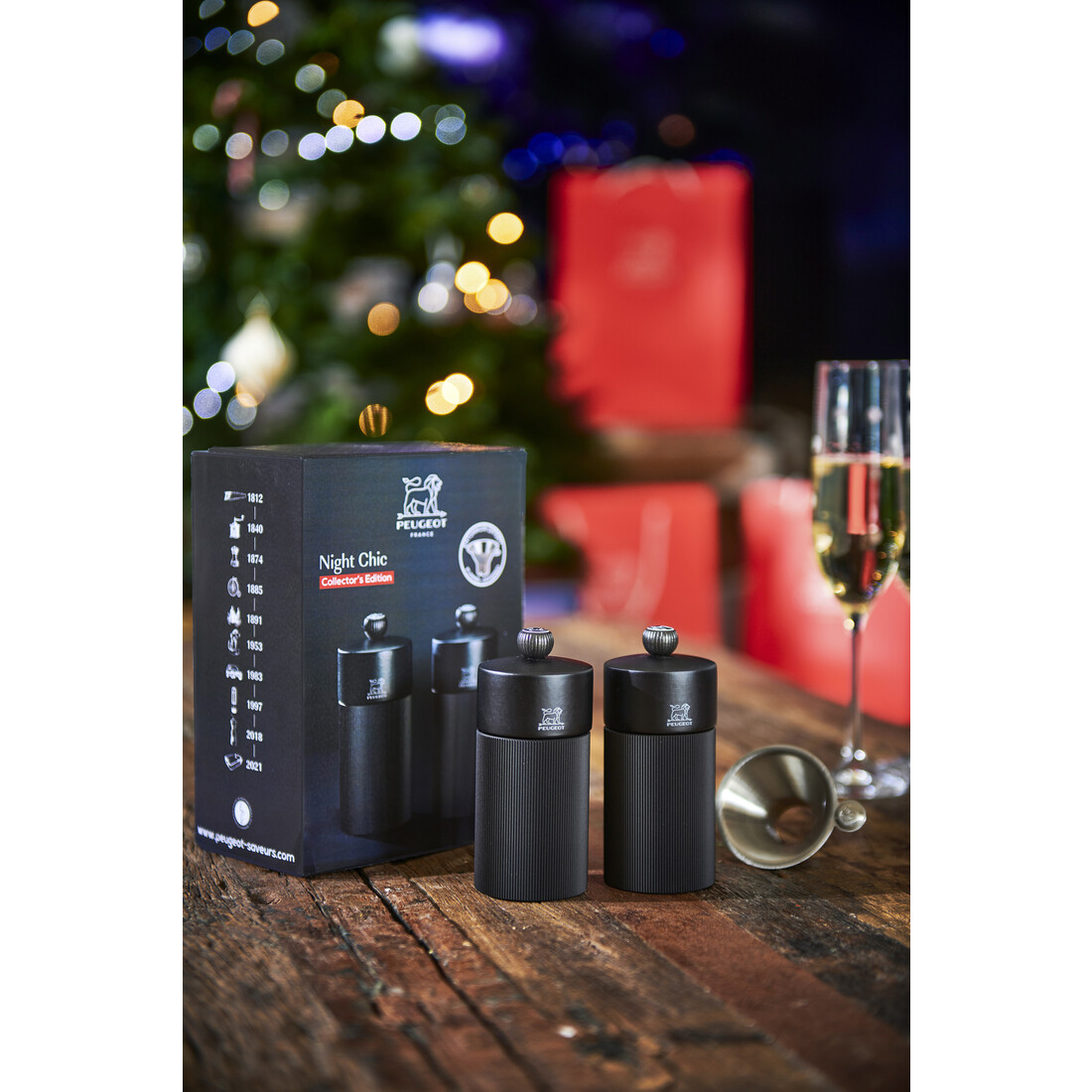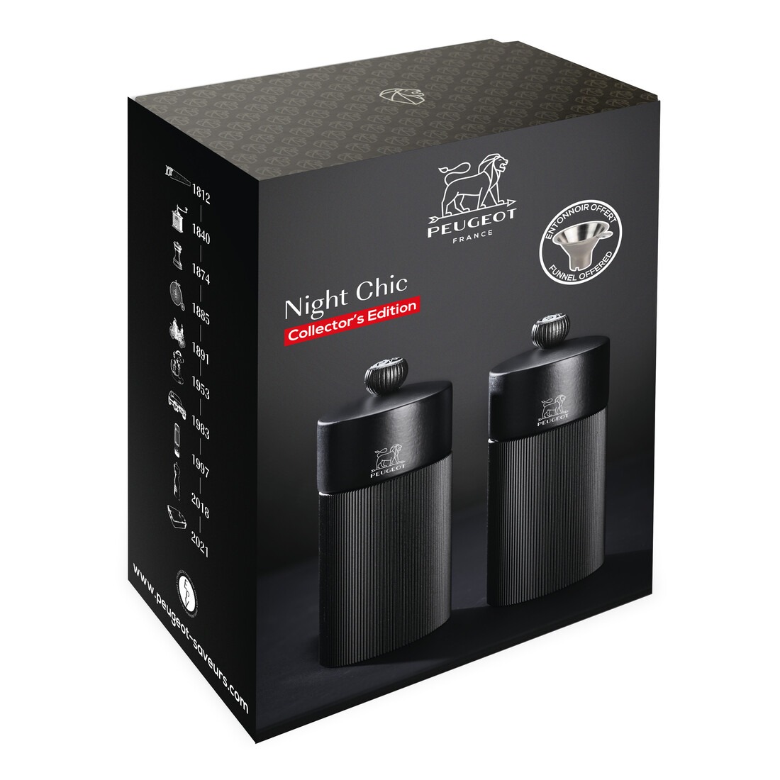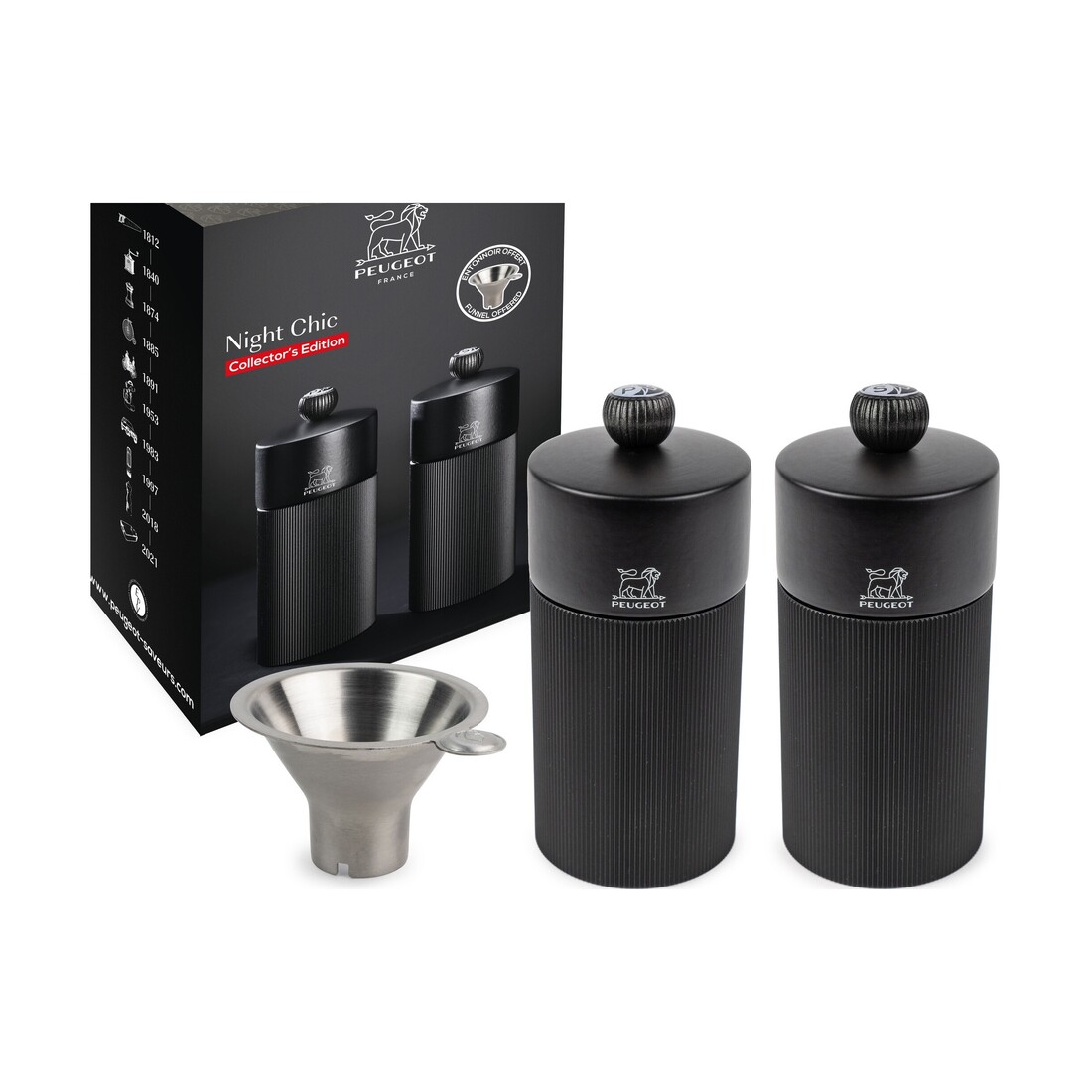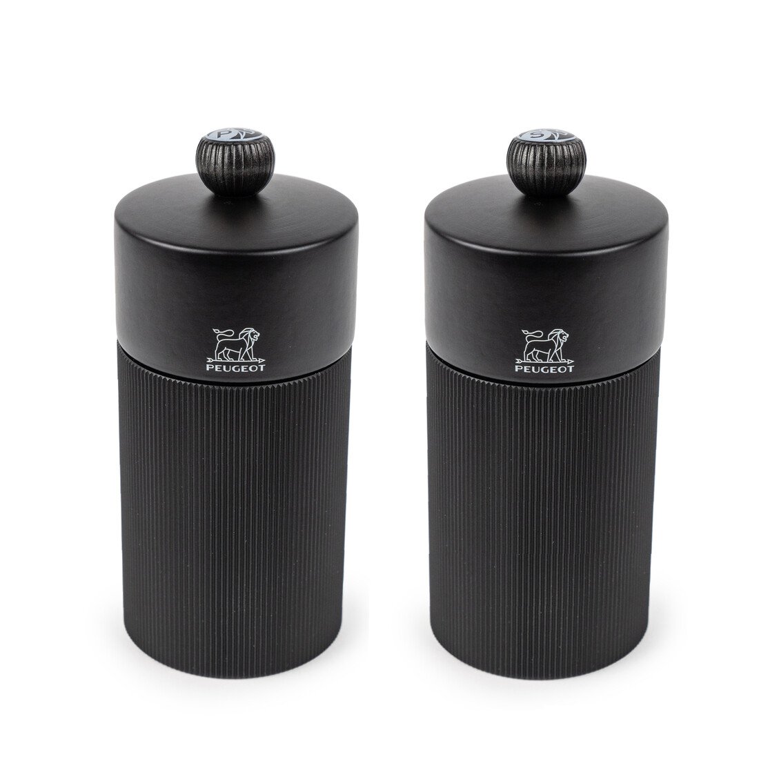 Een stijlvol duo en de perfecte match in iedere keuken. De Peugeot Duo Line peper- en zoutmolen is een prachtige (geschenk)set in de kleur mat zwart. De molens zijn 12 cm hoog en worden geleverd met een handig roestvrijstalen trechter om de molens te kunnen bijvullen. De peper- en zoutmolen worden gemaakt van Frans PEFC-hout en hebben een regelbare maalgraad. Het stijlvolle duo wordt bekroond met handige knoppen, voorzien van de P (Peper) of S (Zout), je houdt de molens gemakkelijk uit elkaar en kiest altijd de passende smaak voor jouw gerecht. Om de molens gelijk in gebruik te nemen worden peper- en zoutkorrels meegeleverd, handig!