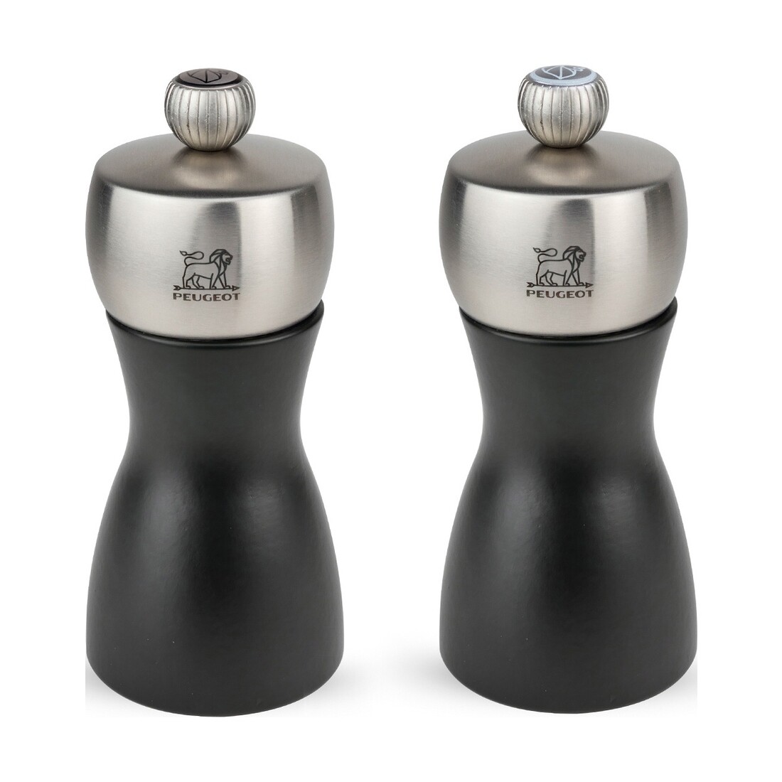 De Peugeot Fidji peper- en zoutmolen set is een elegante exemplaar. Een stijlvolle set met twee molens, gemaakt van beukenhout en roestvrijstaal. De peper- en zoutmolen hebben een moderne matzwarte kleur en zijn voorzien van uniek Peugeot maalwerk. De maling van de korrels kan je zelf instellen, door aan de knoppen bovenop te draaien. Zo kies je voor ieder gerecht de perfect passende maling. De Fidji set heeft een hoogte van 12 cm.