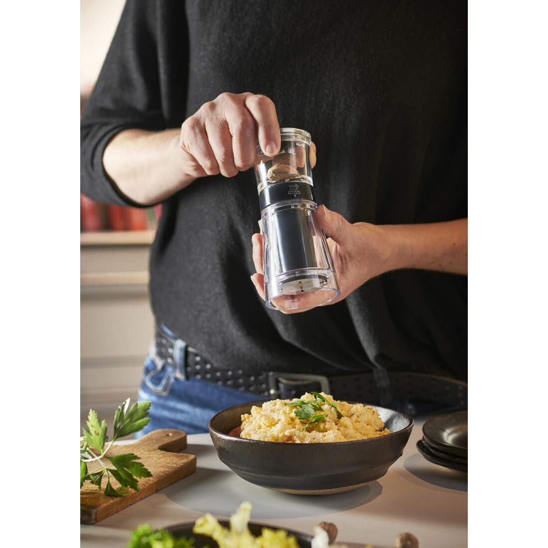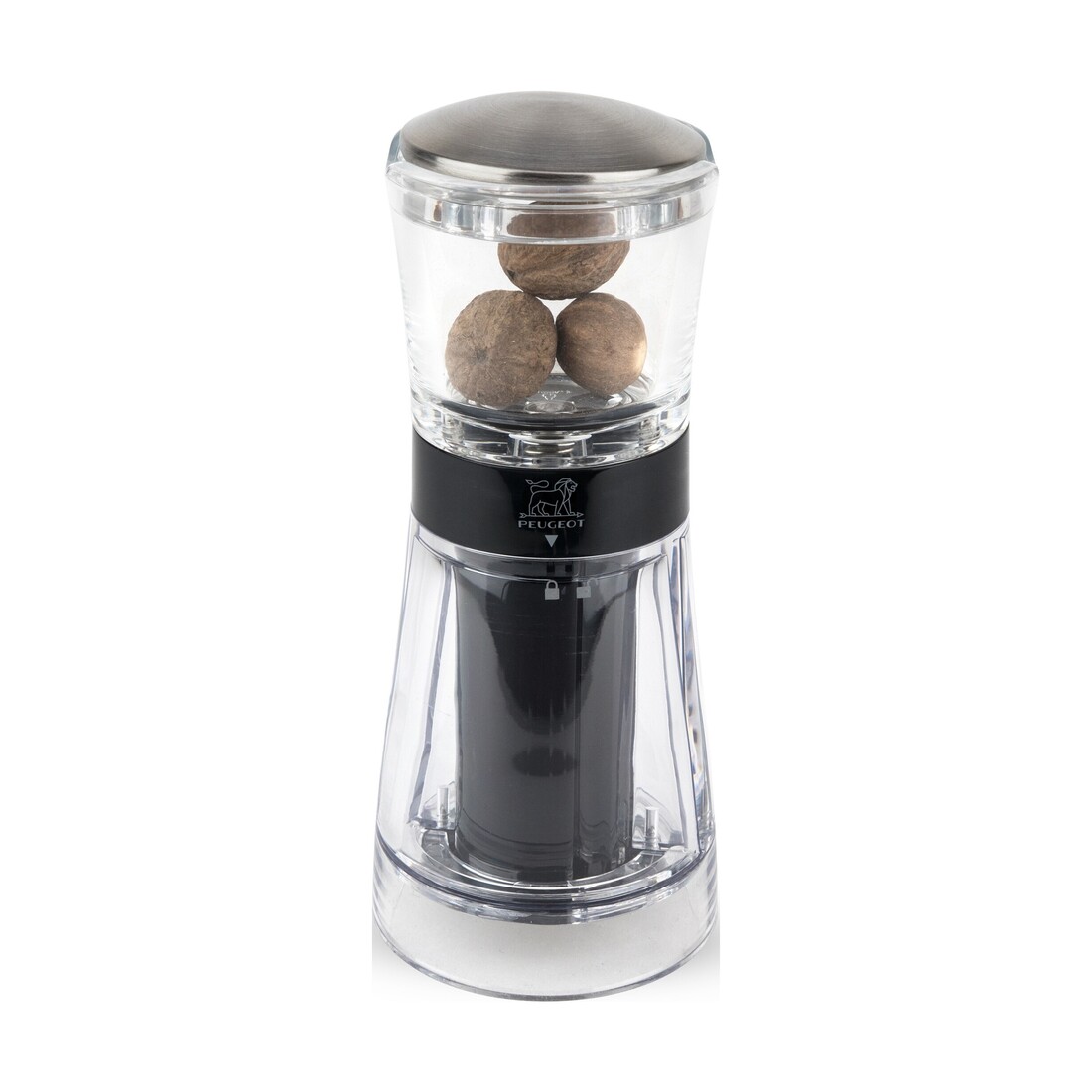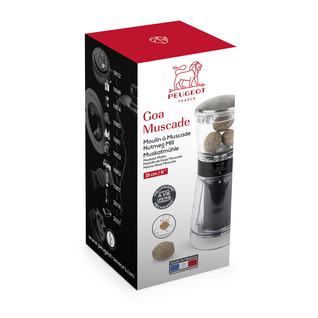 Het vermalen van nootmuskaat doe je met een kwalitatieve Peugeot muskaatmolen. Deze Peugeot Goa nootmuskaatmolen is transparant van kleur en heeft een hoogte van 15 cm. De kunststof nootmuskaatmolen heeft een roestvrijstalen maalmechanisme dat de muskaatnoot met gelijkmatige kracht tegen de messen aan drukt. Maak ieder gerecht op smaak en maak de nootmuskaatmolen als het nodig is schoon met warm water en afwasmiddel.