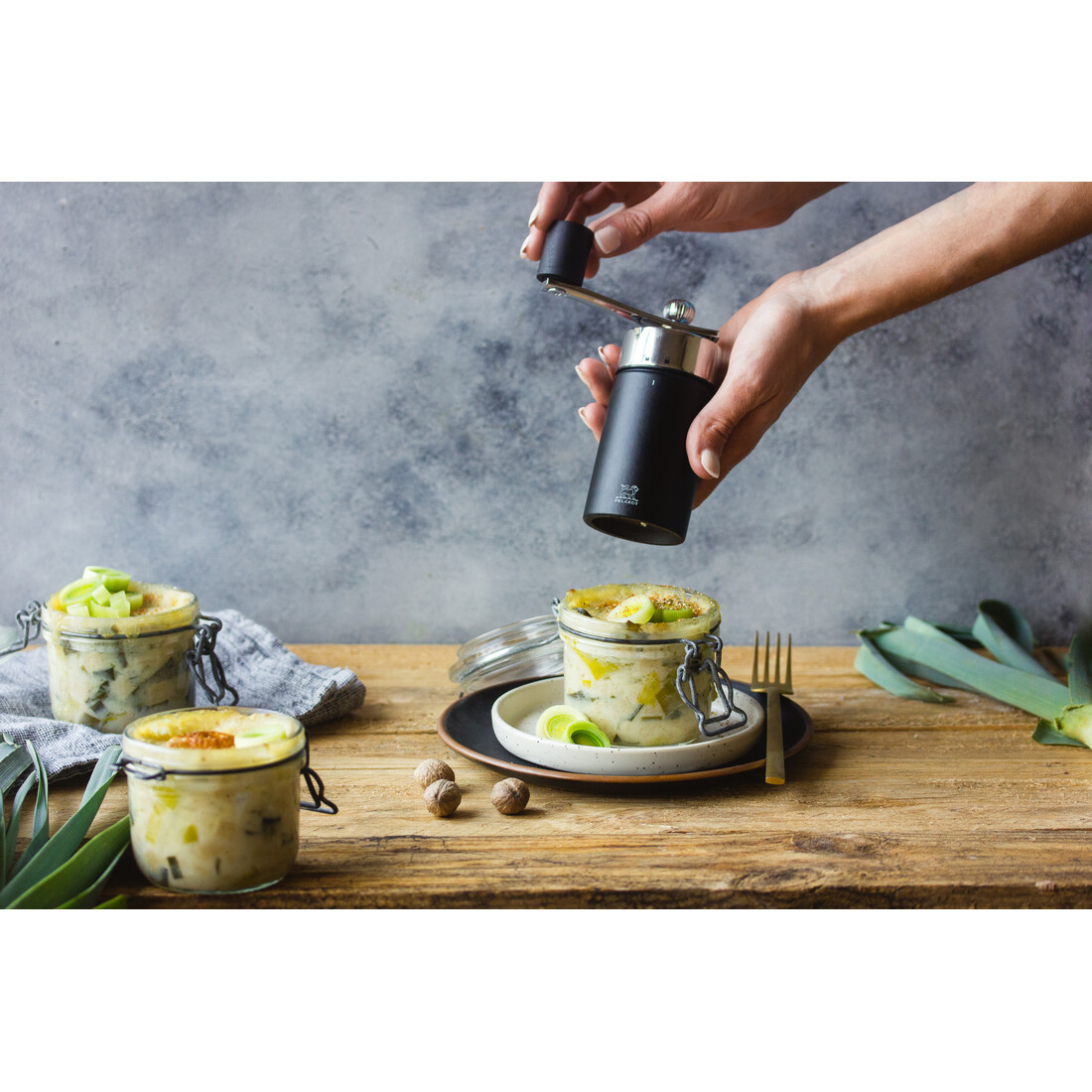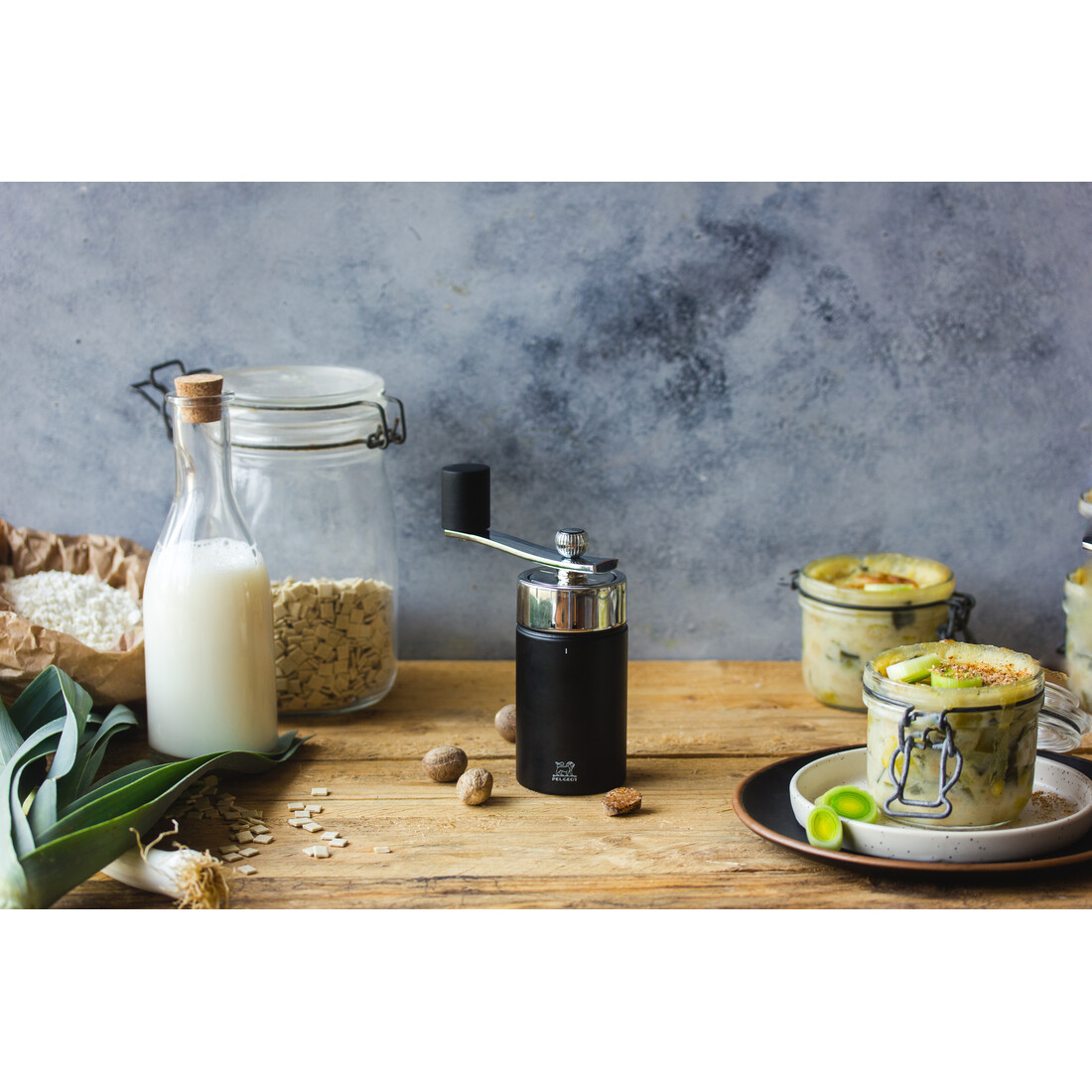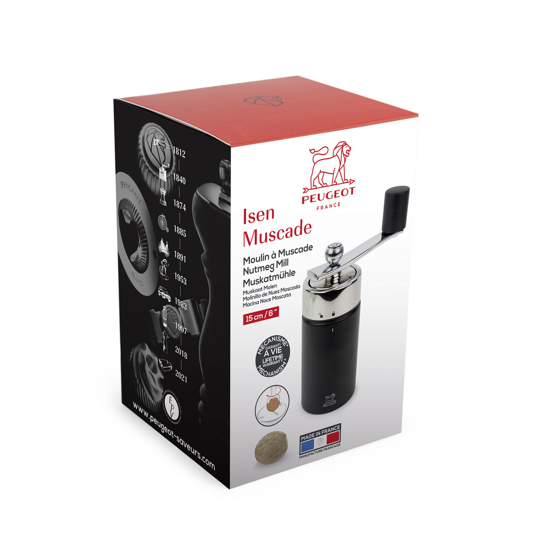 Het vermalen van nootmuskaat doe je met een kwalitatieve Peugeot muskaatmolen. Deze Peugeot Isen nootmuskaatmolen is mat zwart van kleur en heeft een hoogte van 15 cm. De beukenhouten nootmuskaatmolen heeft een roestvrijstalen maalmechanisme dat met een instelbare maalgraad. Maak ieder gerecht op smaak en reinig als het nodig is de buitenzijde met een vochtige doek en het maalwerk met een droge kwast.