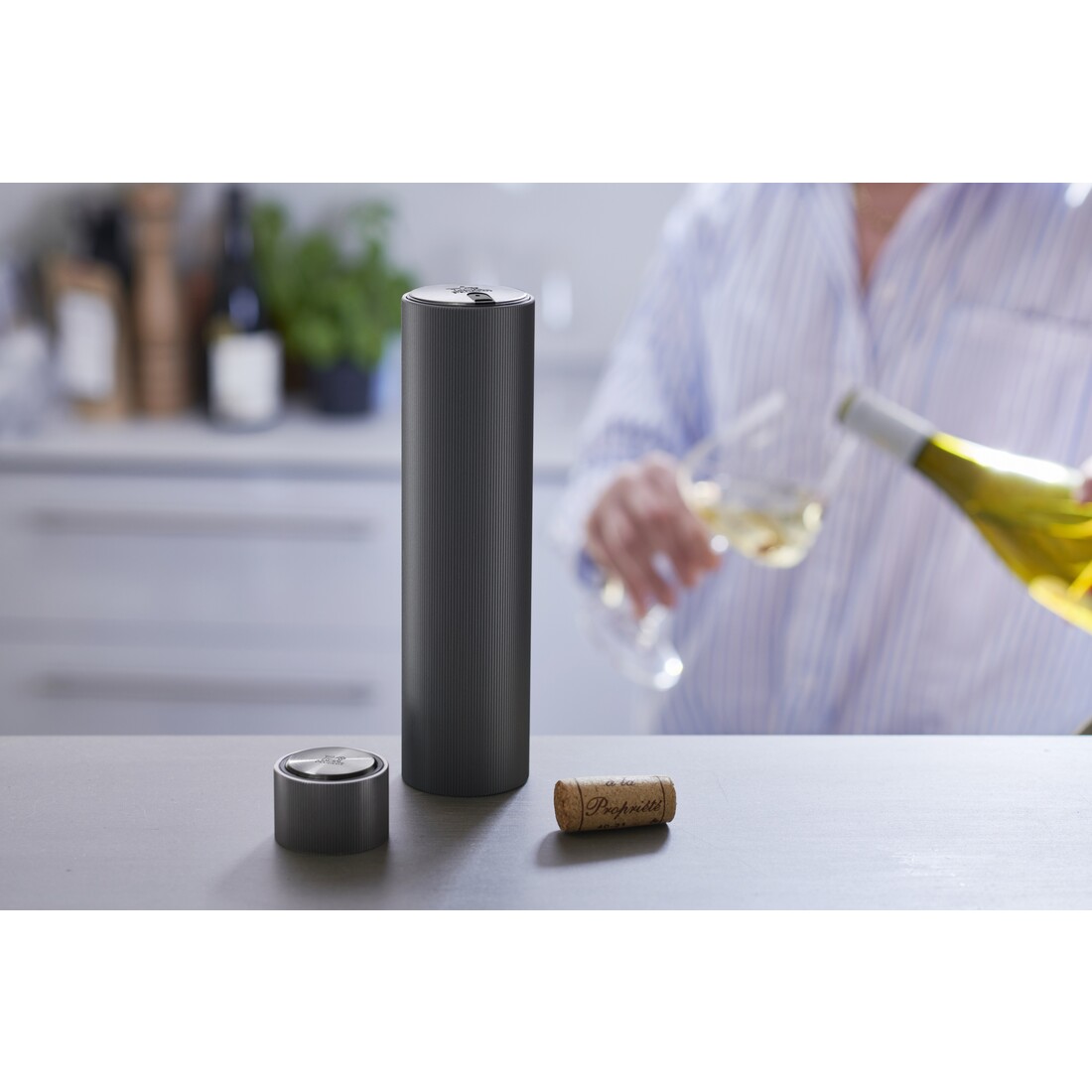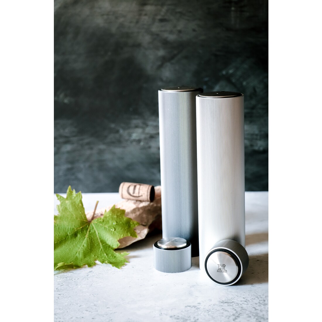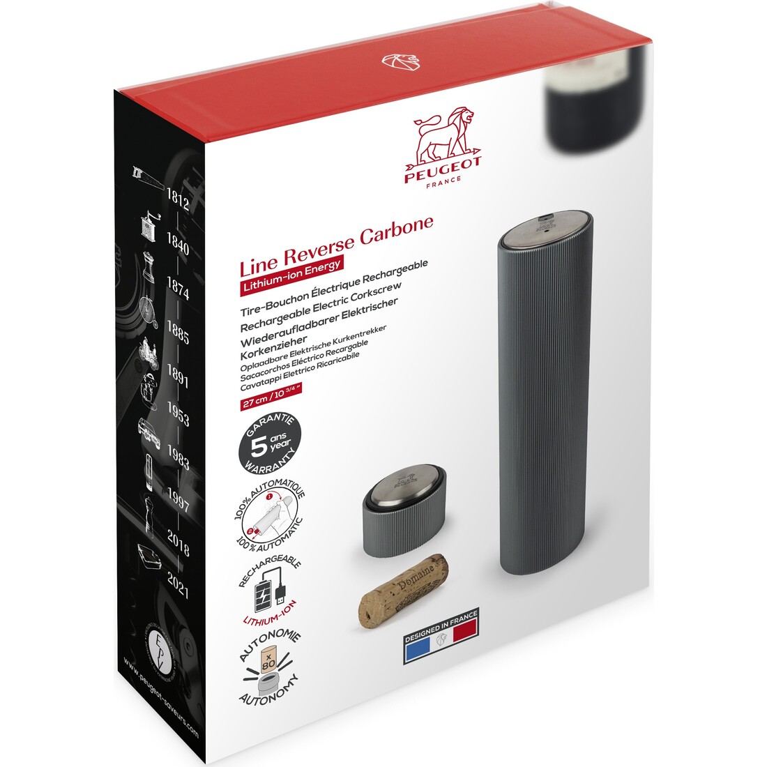 Flessen ontkurken was nog nooit zo makkelijk. Met de Peugeot Line Reverse automatische kurkentrekker open je iedere fles. De elektrische kurkentrekker is oplaadbaar en heeft een afwerking in kleur carbon. De meegeleverde lithium-ion-batterij is goed voor 80 keer ontkurken en is daarna binnen 2,5 uur weer volledig opgeladen.