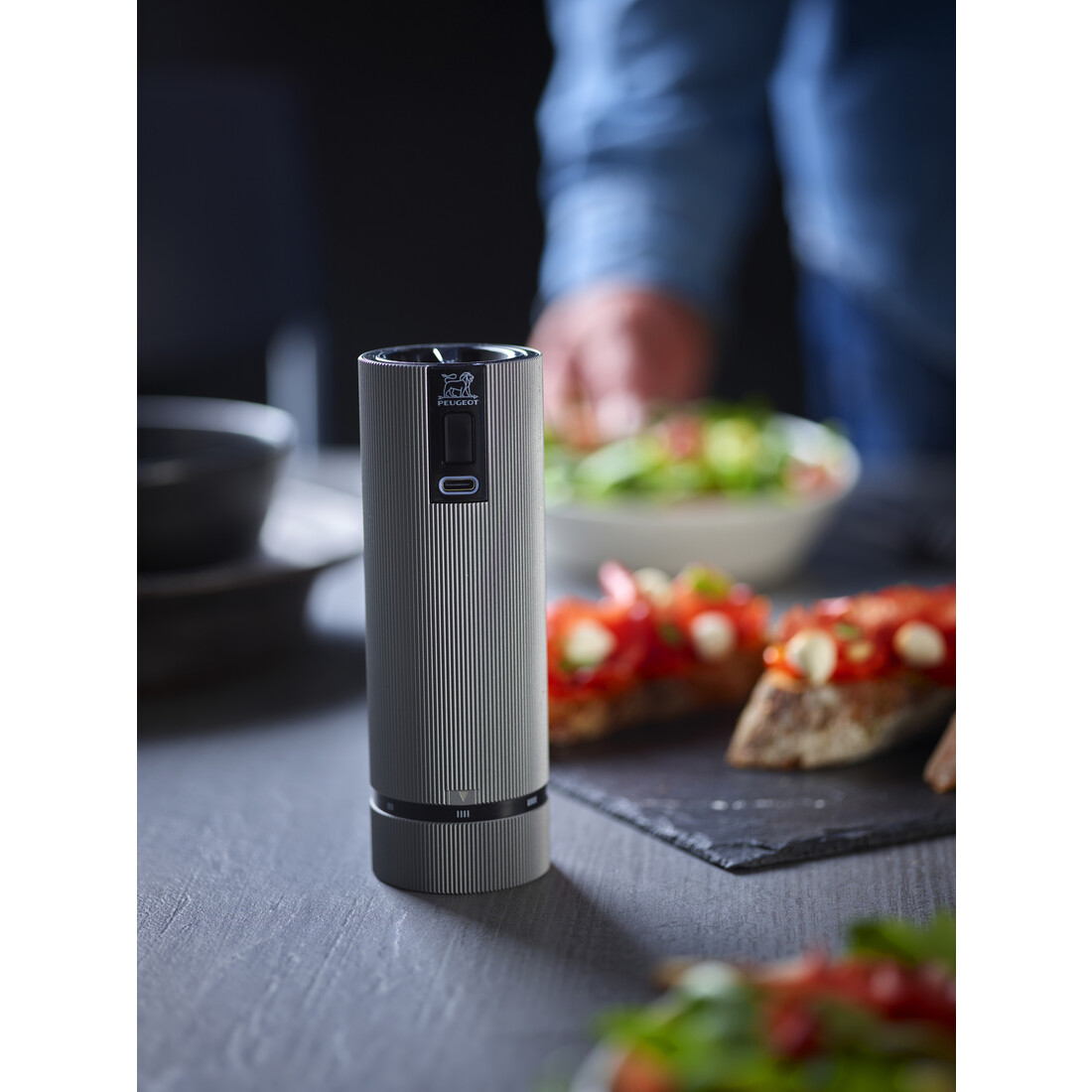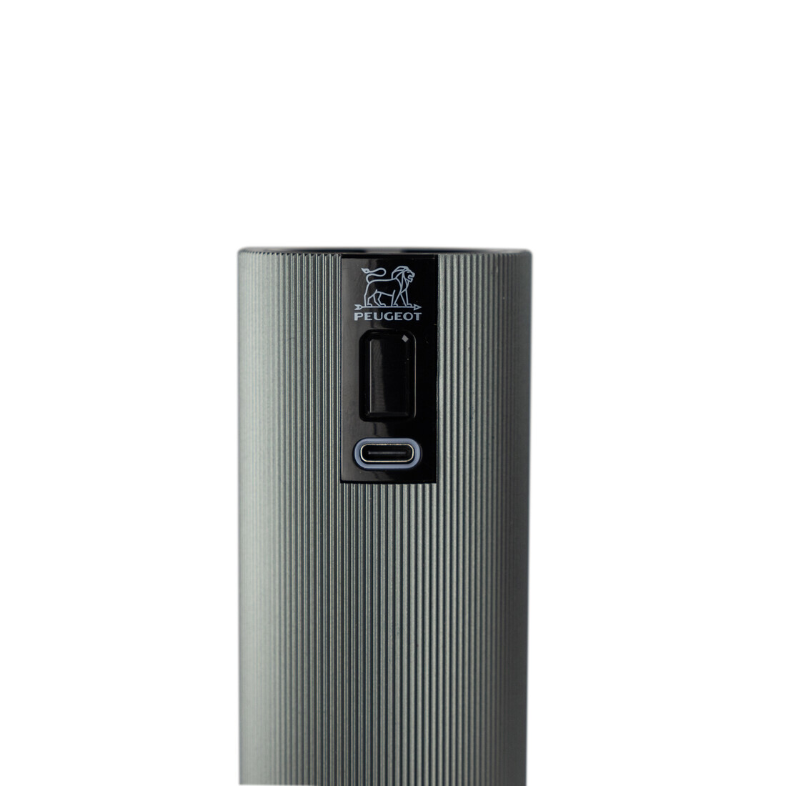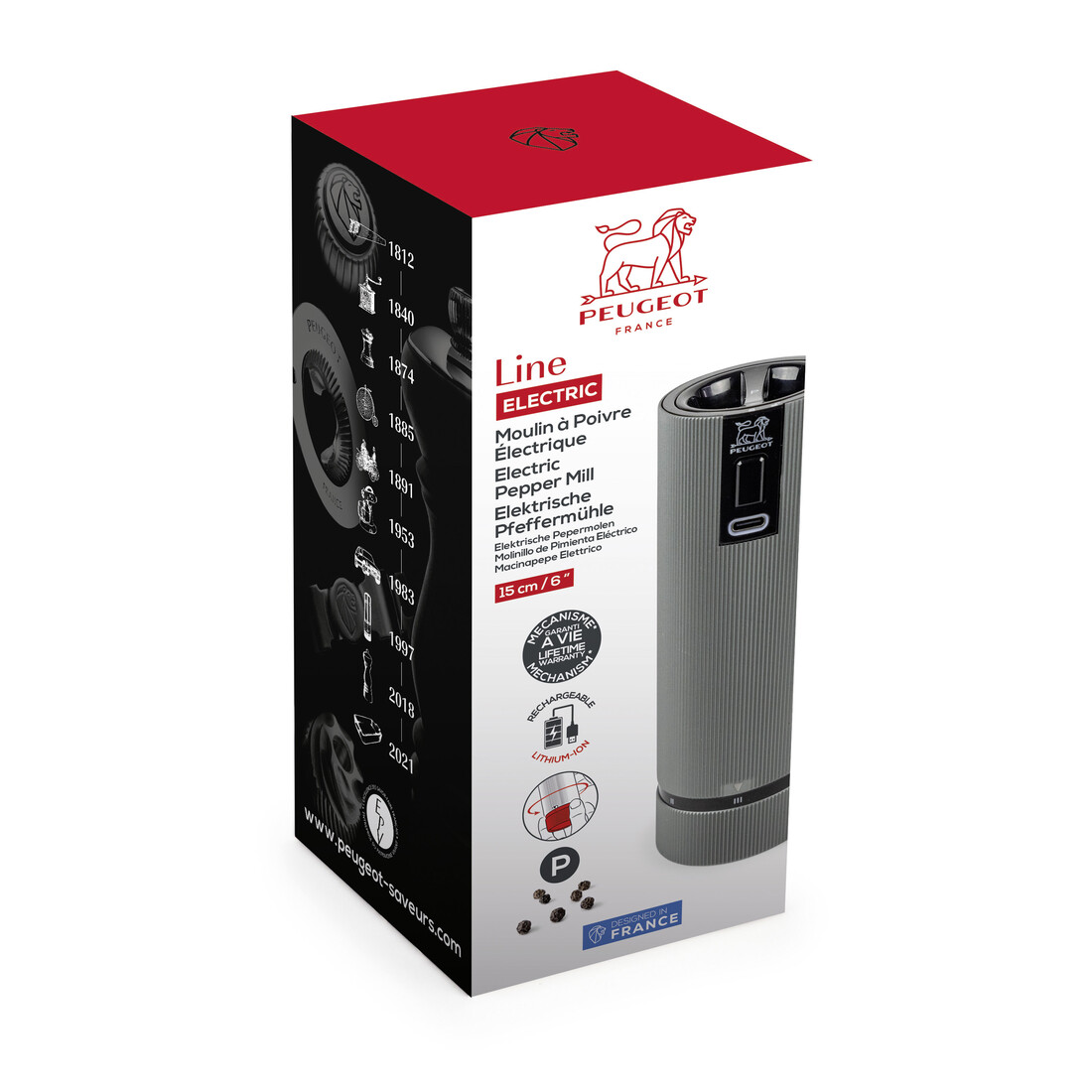 De elektrische pepermolen van Peugeot uit de Line serie is een stijlvolle toevoeging aan de keuken. De molen is gemaakt van geribbeld aluminium en heeft een compacte afmeting van 15 cm. De pepermolen heeft een carbonkleur en je kan hem als perfecte smaakmaker inzetten. De functionele en elegante pepermolen heeft 6 verschillende maalstanden. Je kiest per gerecht de perfecte maalgraad, waardoor je altijd op smaak kunt koken. Je stelt dit in met de unieke u'Select functie aan de onderzijde van de Peugeot molen. De lithium-ionbatterij van de Line molens gaat lang mee en is snel op te laden. Het trechtervormige reservoir maakt het bijvullen eenvoudig en de molen wordt geleverd met peperkorrels. De Line pepermolen is direct bruikbaar en staat voor de beste smaak en kwaliteit, een waardige investering voor iedere keuken!
