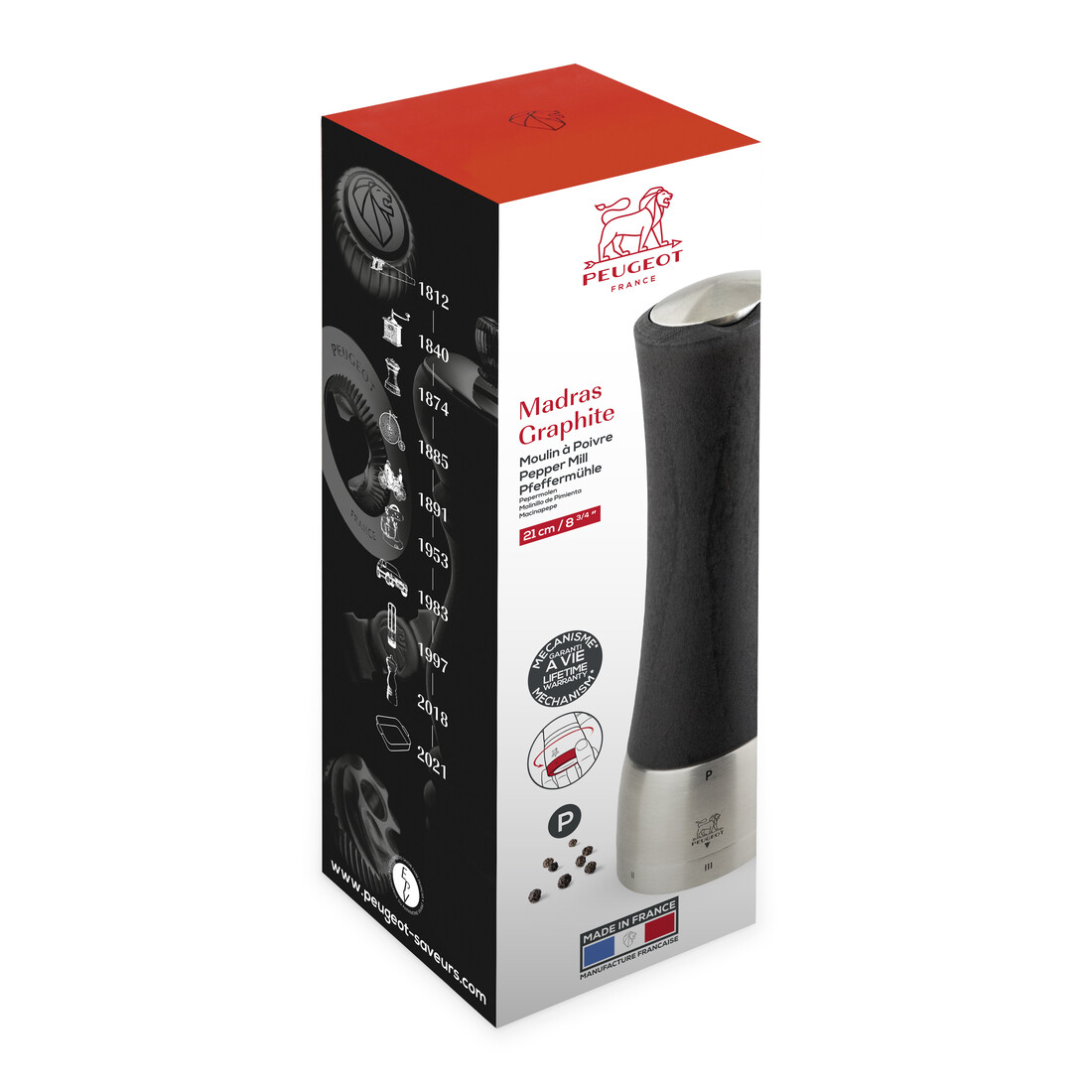 De Madras molens zijn innovatief en bevatten geen verticale centrale as meer. Dit maakt het vullen van het reservoir een stuk makkelijker. De Peugeot Madras pepermolen is daarnaast voorzien van de unieke u'Select functie om de maalgraad naar wens in te stellen. Dit maalwerk heeft levenslange garantie, waardoor je gegarandeerd lang geniet van de kwaliteit van deze molen!