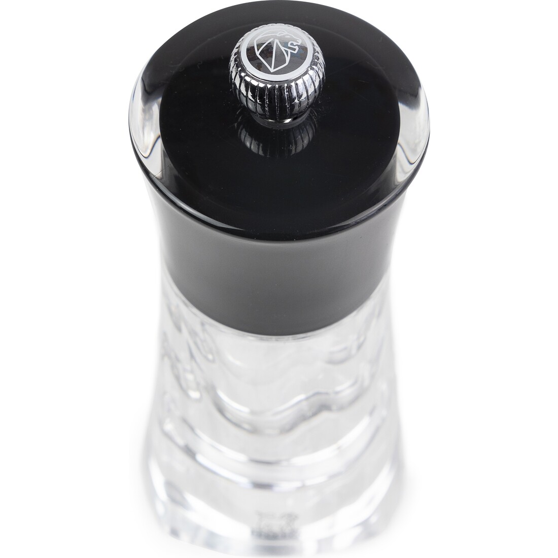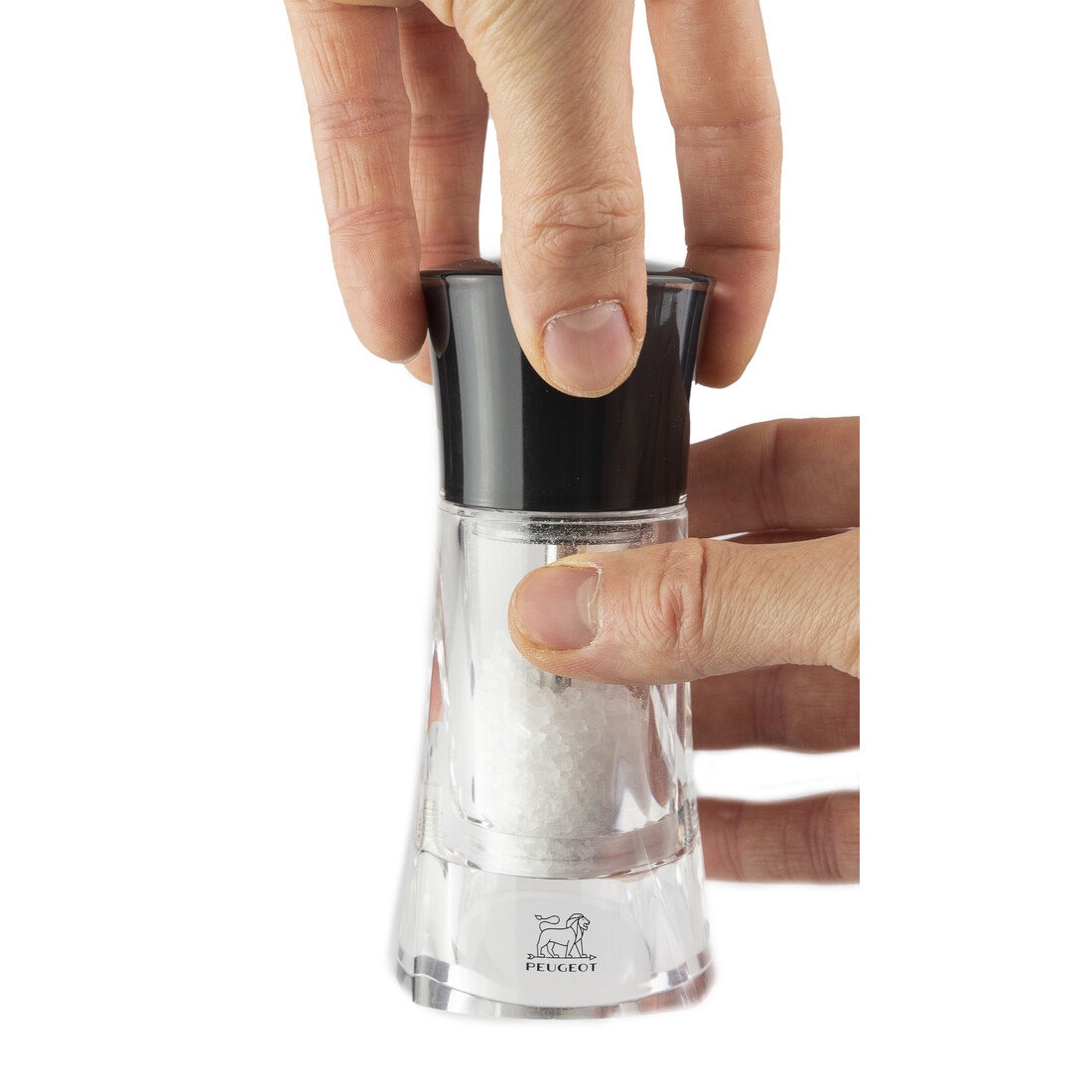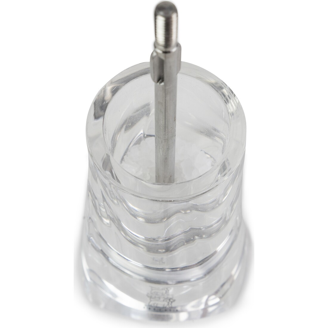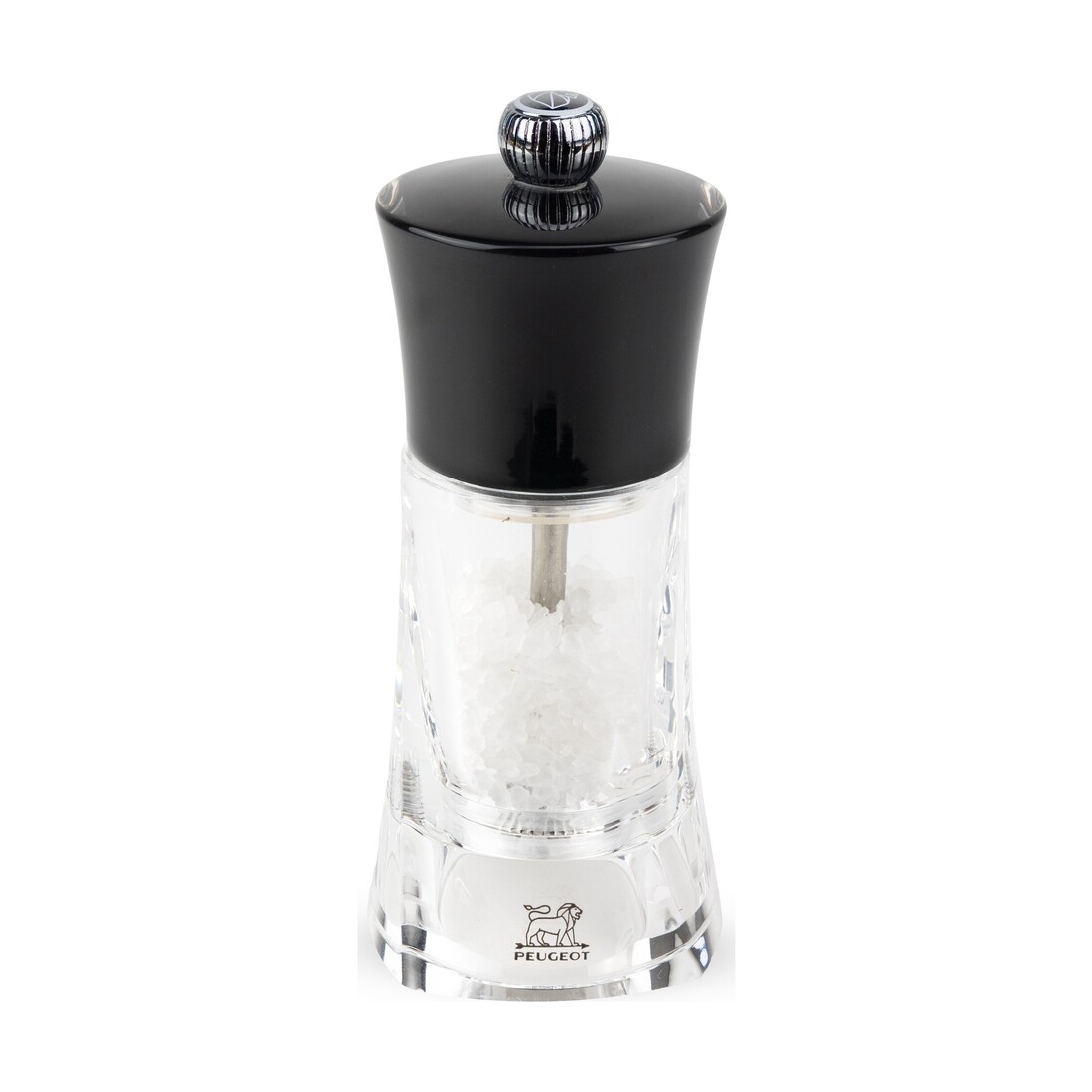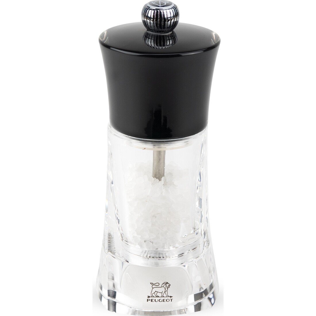 Creëer een heldere uitstraling aan tafel met de Peugeot Molène zoutmolen. Een transparante molen met een zwarte bovenkant en een gedraaide body. De zoutmolen is gemaakt van acryl en heeft een afmeting van 14 cm.